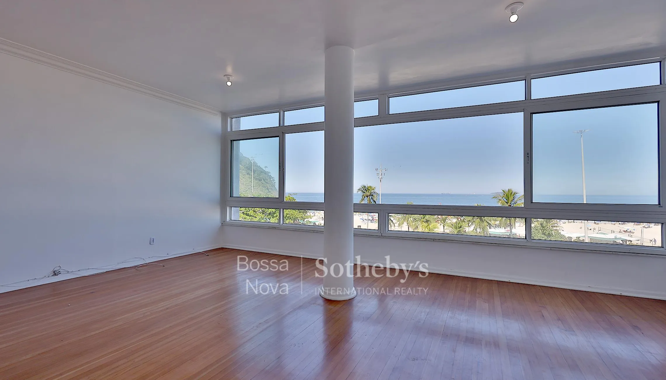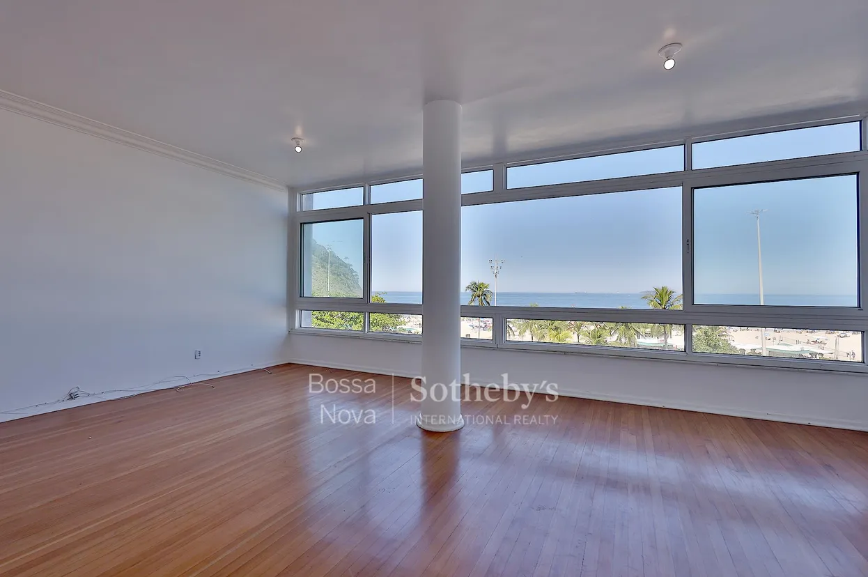 Imóvel claro, arejado e reformado em prédio tradicional e bem localizado junto à praia, com porteiro 24 horas. É composto por sala em dois ambientes com vista 180º do Leme ao Posto 6, dois banheiros sociais, três quartos de fundos com armários, sendo dois deles com vista agradável para a copa das árvores, cozinha planejada, pequena área de serviço e dependência de funcionários tipo suíte. Todo o apartamento tem janelas antirruído. Não há vaga de garagem, mas conta com farta disponibilidade de vagas em frente ao condomínio.