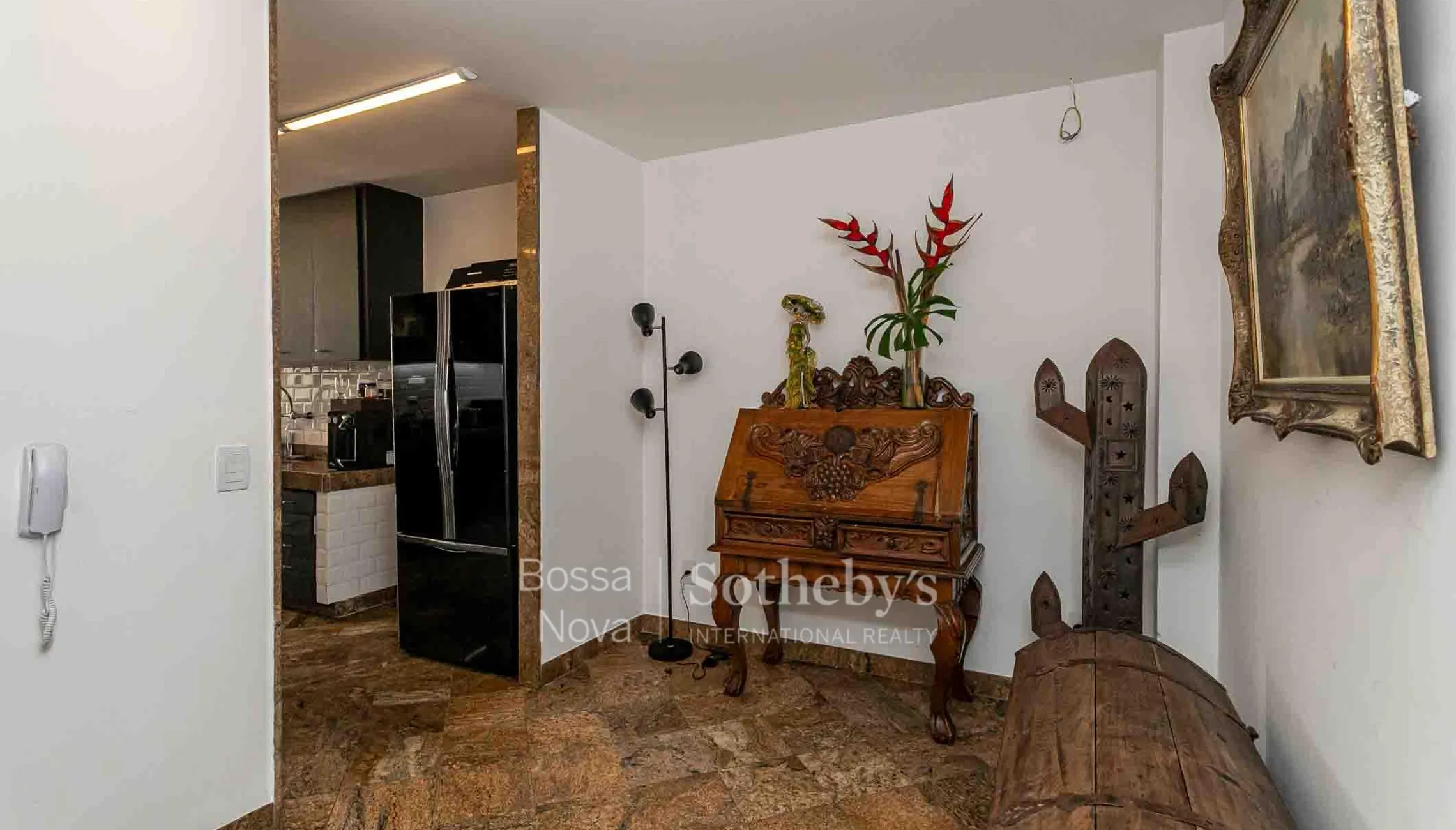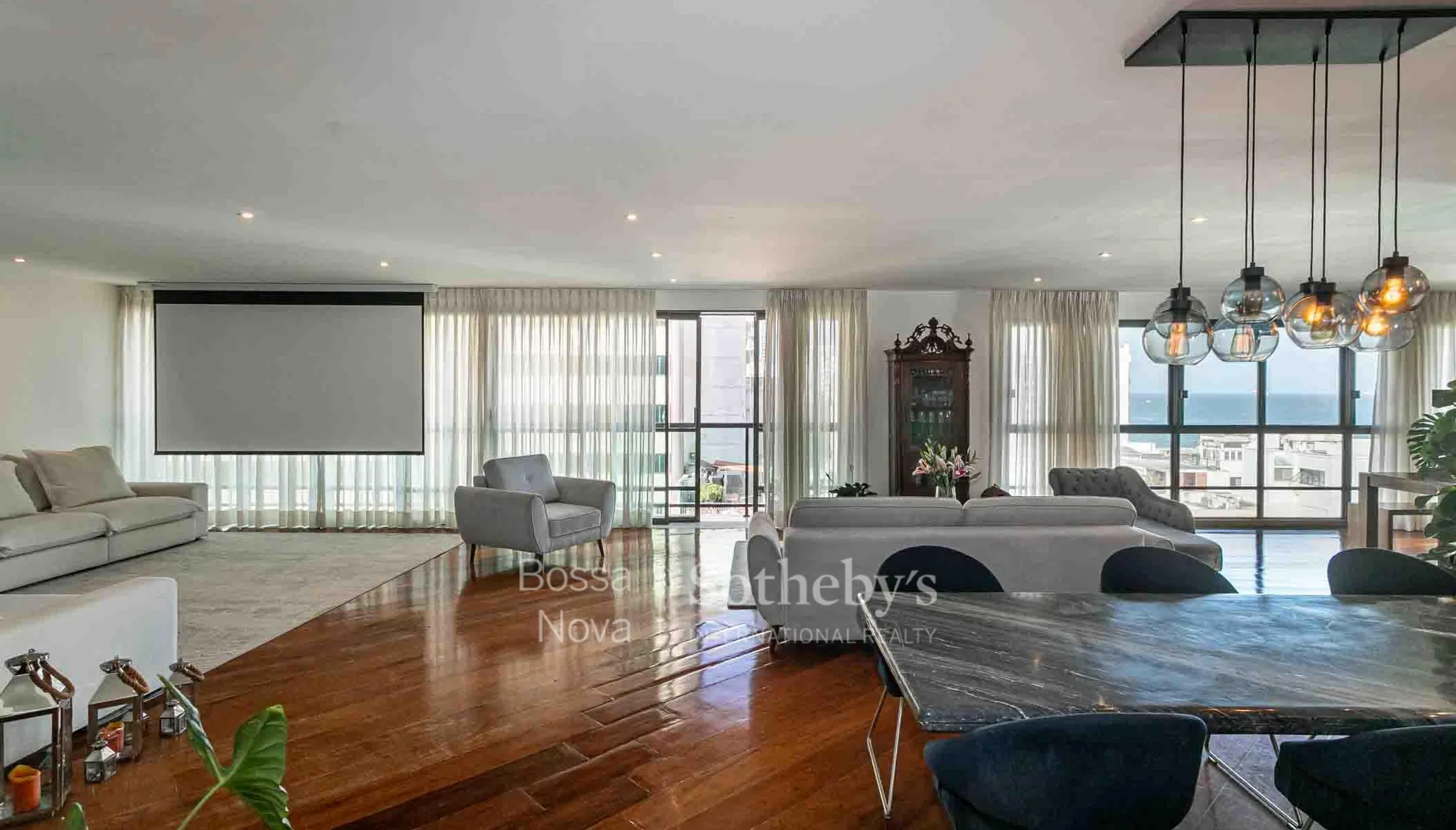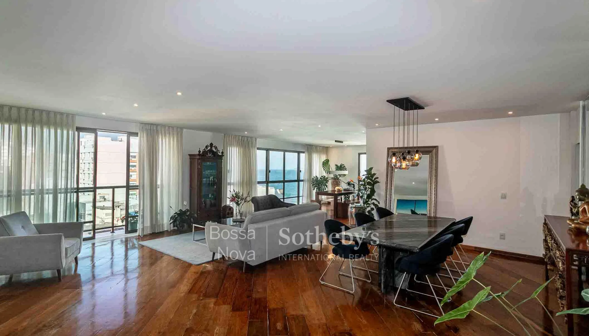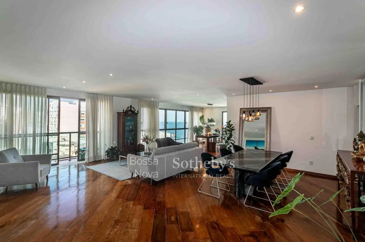Apartamento em andar alto, claro e arejado, com planta circular e vista para o mar. A área social é composta por sala ampla com três ambientes, sacada e lavabo. Originalmente com quatro dormitórios, atualmente possui três, sendo uma suíte master dupla com closet e vista para o mar, além de um banheiro social. A área de serviço inclui copa, cozinha, dependência de funcionária e banheiro de apoio. O imóvel dispõe de três vagas de garagem escrituradas. O edifício oferece portaria 24 horas.