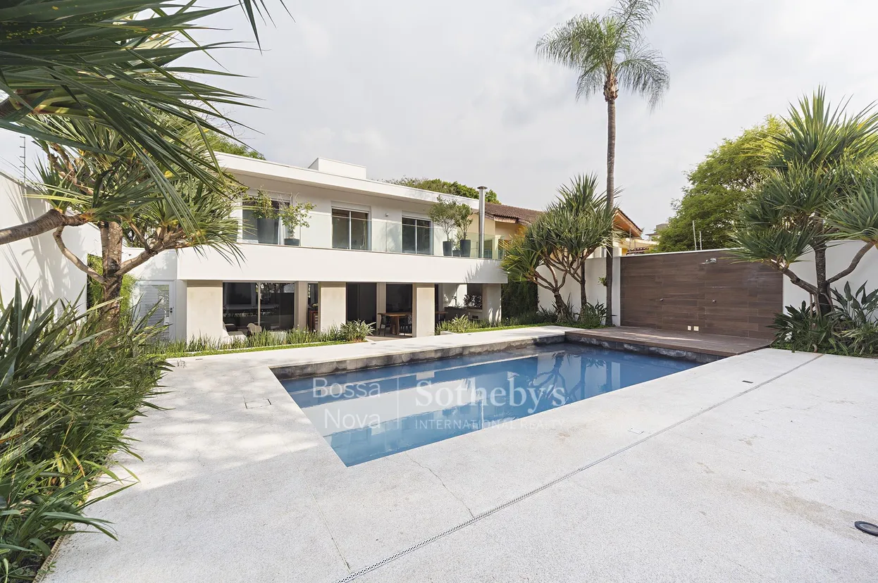 Casa em rua tranquila, distribuída em três pavimentos que combinam conforto, funcionalidade e integração. No andar superior estão quatro dormitórios, sendo a suíte principal com closet e escritório, além de varanda e copa de apoio. A área social reúne amplos ambientes de estar, jantar e TV, todos climatizados e com piso em madeira. A cozinha equipada se integra à área de lazer, que conta com piscina, espaço gourmet com churrasqueira e vestiários. No nível inferior, há garagem para até cinco veículos, lavanderia, dois dormitórios e banheiros de serviço, além de depósitos. O imóvel oferece recursos de sustentabilidade e eficiência, com sistema de energia solar, aquecimento de água por múltiplas fontes e isolamento térmico e acústico. Conta ainda com segurança completa, incluindo monitoramento por câmeras, cerca elétrica e portão automatizado.