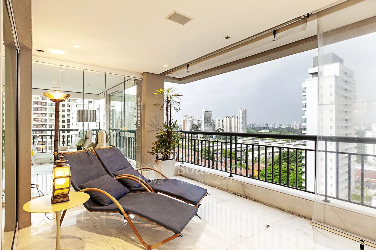 Apartamento reformado localizado em andar alto, com vista aberta e permanente para o Parque Ibirapuera e para o entorno arborizado da região. A área social apresenta living que integra sala de estar e sala de jantar, além de duas varandas, sendo uma delas configurada como varanda gourmet. A cozinha conta com copa e boa circulação para o uso cotidiano. A área íntima dispõe de duas suítes, com planta que permite reversão para a configuração original de três suítes. A suíte principal apresenta dimensões generosas e banheiro com banheira. O apartamento possui marcenaria planejada em todos os ambientes. A unidade conta com quatro vagas de garagem e depósito. O edifício oferece uma unidade por andar, além de infraestrutura com bicicletário, portaria blindada e área de lazer composta por piscina aquecida, sauna, playground, salão de festas e salão de jogos. Disponível para locação mobiliado.