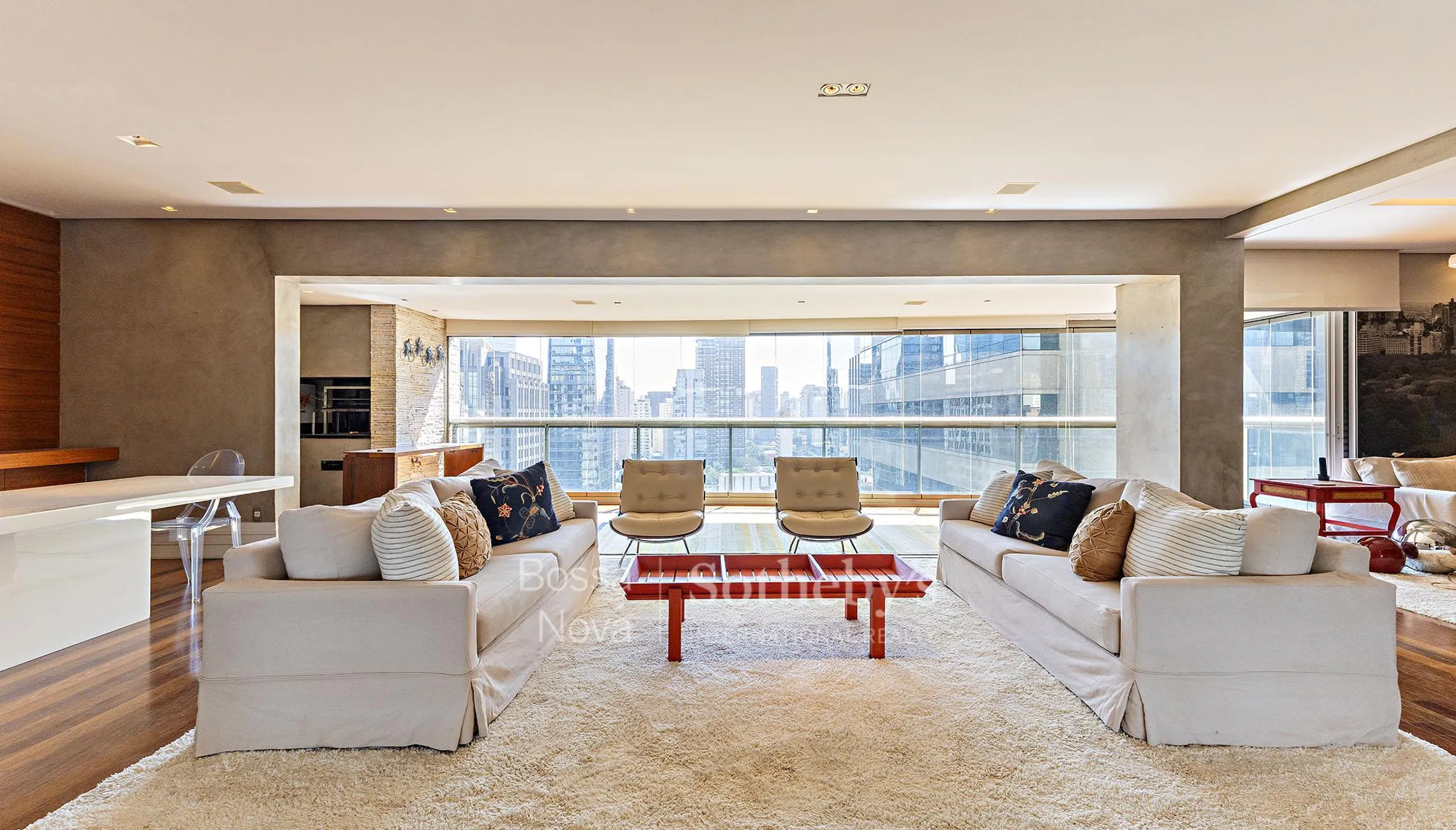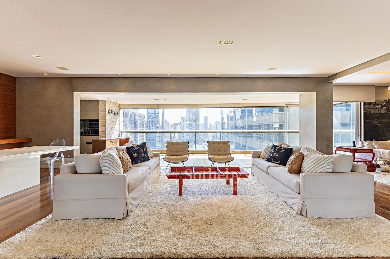 Apartamento mobiliado situado em andar alto no Itaim, em rua de perfil residencial com acesso conveniente à Faria Lima, ao Shopping Iguatemi JK e ao Parque do Povo. O living amplo integra três ambientes, incluindo salas de TV, visitas e jantar, conectados à varanda envidraçada com área gourmet, favorecendo luminosidade e vista urbana. O apartamento dispõe de ar-condicionado em todos os ambientes, lavabo e escritório. A área íntima oferece três suítes, sendo a principal com closet e varanda. A cozinha e a copa se conectam à área de serviço e à dependência de funcionária, com marcenaria planejada. O condomínio apresenta infraestrutura de lazer abrangente, com salão de festas, academia, piscina coberta e aquecida, saunas seca e úmida, sala de massagem, quadra de squash, quadra poliesportiva, playground e brinquedoteca, além de segurança vinte e quatro horas. O imóvel conta com quatro vagas de garagem.
