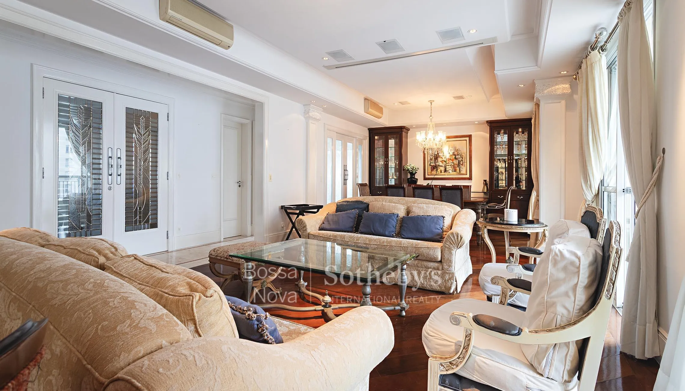 Em condomínio de inspiração neoclássica situado em rua arborizada, este apartamento mobiliado apresenta ambientes amplos com ótima luminosidade. A área social reúne estar, jantar, bar e terraço envidraçado, além de cozinha, despensa e sala de almoço. A área íntima dispõe de três suítes e escritório, sendo a suíte principal com walk in closet e banheiros Sr. e Sra. O projeto conta com sistemas de som e iluminação, armários planejados, ar condicionado e banheiros em mármore travertino. O condomínio oferece piscina coberta, playground, sauna, fitness, quadra poliesportiva e salão de festas, e o apartamento possui quatro vagas.