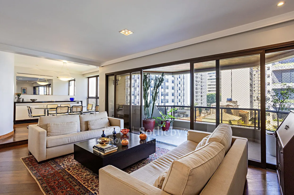 Apartamento em edifício de uma unidade por andar, situado na região do Jardim Paulista com fácil acesso às conveniências da Pamplona. O hall de entrada e o lavabo apresentam acabamento em mármore, criando uma chegada elegante à área social, que reúne um living espaçoso com varanda, sala de jantar integrada e ambiente destinado a home theater, valorizados pela luminosidade natural e pela ventilação constante. A área íntima dispõe de três suítes, sendo a principal com varanda. A cozinha conta com copa e se conecta à área de serviço, que inclui banheiro e quarto destinados ao apoio. O condomínio oferece piscina recentemente renovada, salão de festas e gerador full. O apartamento possui três vagas e depósito.