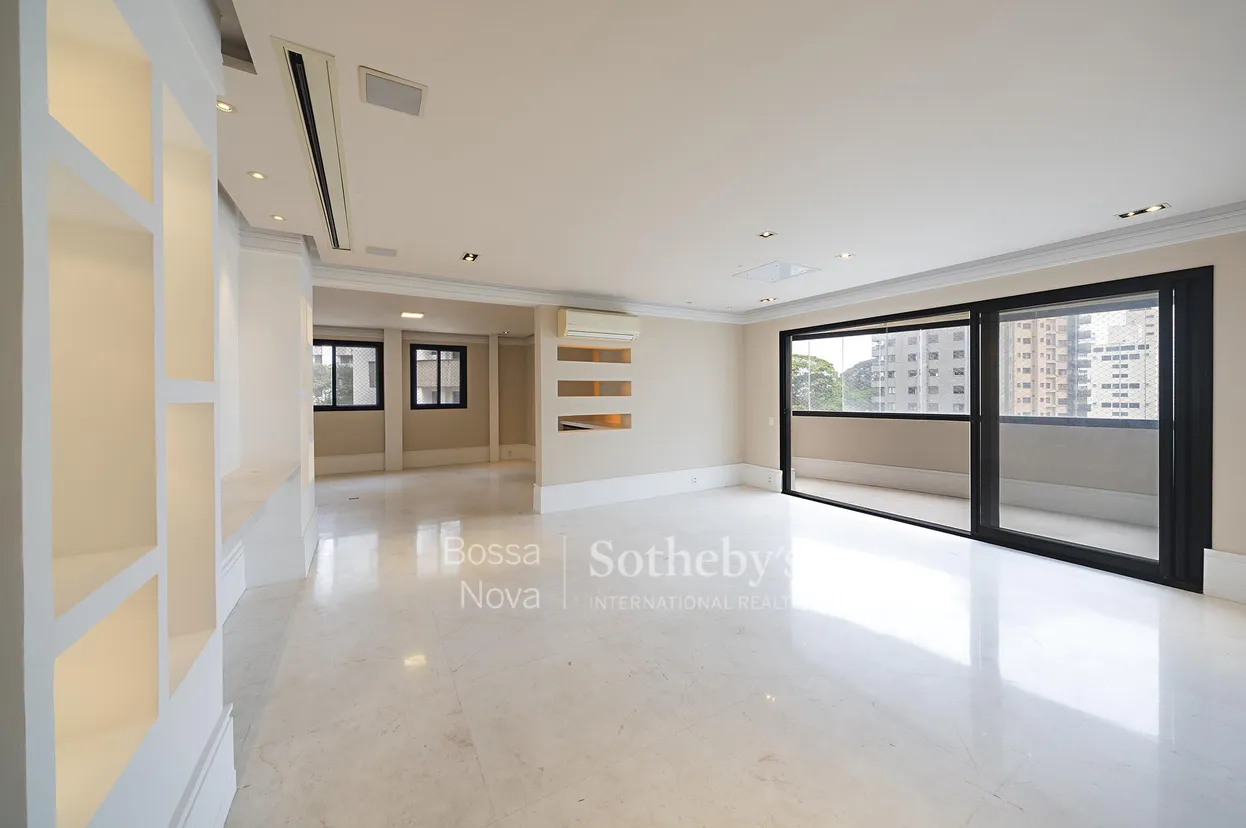 Localizado em uma rua tranquila da região nobre de Moema, fora da rota, este apartamento ocupa andar exclusivo em edifício com lazer completo, proporcionando privacidade e conforto. O hall social, o living, o lavabo e a ampla varanda são revestidos em mármore, criando uma atmosfera sofisticada. A área social é composta por um living amplo, iluminado, integrado à sala de jantar e à varanda envidraçada, além de uma espaçosa sala de almoço com despensa e cozinha planejada. O imóvel dispõe ainda de grande louceiro e, na área de serviço, na parte destinada à lavanderia, conta com dormitório e banheiro de empregada. Na área íntima, são três suítes, sendo a master com banheiro e walk-in closet senhor e senhora, além de sala íntima que originalmente correspondia à quarta suíte, facilmente reversível, pois a infraestrutura hidráulica foi preservada. Conta com três portas blindadas, localizadas na área de serviço, no acesso à área íntima e na suíte master. O apartamento tem ar-condicionado em todos os ambientes, inclusive na cozinha. Dispõe de quatro vagas de garagem mais depósito.