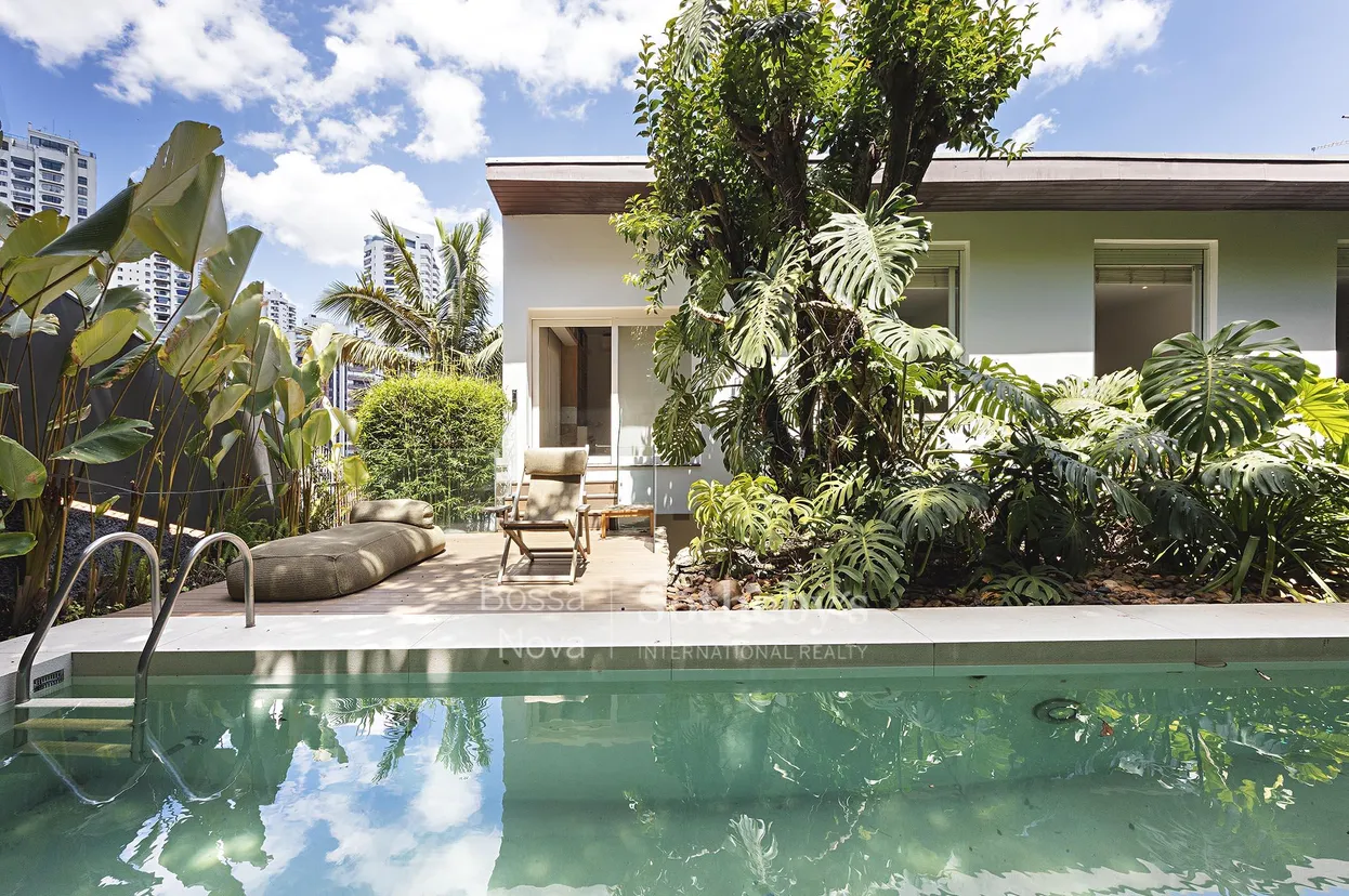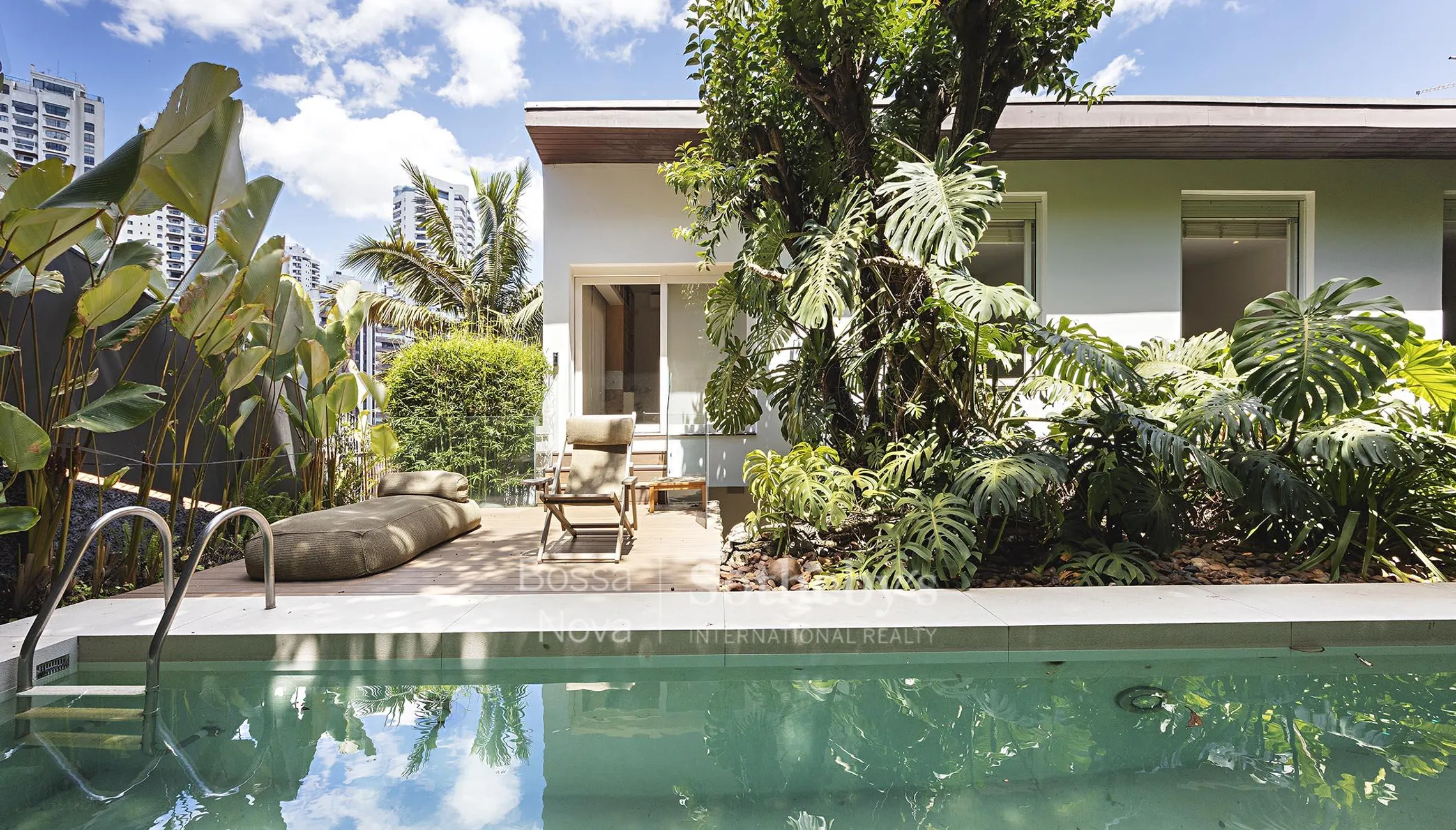 Localizada em uma rua estritamente residencial do Pacaembu, com acesso facilitado às comodidades de Higienópolis e Perdizes, esta residência modernista assinada por Vila Nova Artigas foi restaurada pelo arquiteto Arthur Casas, unindo sofisticação e autenticidade arquitetônica. A casa se destaca pelo generoso recuo frontal com paisagismo assinado, e fachada elevada sustentada por colunas. Possui duas entradas: uma por rampa com escada de pedras e outra entrada lateral para pedestres. O endereço conta com guarita e segurança 24 horas. São três pavimentos conectados por elevador original restaurado. No pavimento intermediário, o living integrado abriga ambientes de estar, jantar e TV, com lareira e janelas amplas que proporcionam iluminação natural e vista para Higienópolis. A sala de almoço se conecta à cozinha por uma abertura com bancada de mármore. A cozinha é equipada com marcenaria branca e eletrodomésticos embutidos. Ainda neste andar, há um lavabo revestido em mármore Carrara e área de serviço com despensa. A área externa conta com piscina aquecida em raia envolta por paisagismo com jabuticabeira, acessível tanto pelo living quanto pelo pavimento superior. No último andar, estão três dormitórios voltados para os fundos, sendo uma suíte com walk-in closet, banheira, ducha com vista e iluminação natural por claraboia. Há ainda dois dormitórios amplos, banheiro completo e rouparia no corredor. Um escritório com varanda e acesso direto ao deck da piscina complementa o pavimento. A casa conta com placas solares, ar-condicionado nos dormitórios e acabamentos como piso em taco-palito em toda a área íntima e social. Um exemplar de arquitetura modernista preservado, com toques contemporâneos que valorizam o conforto e o design.
