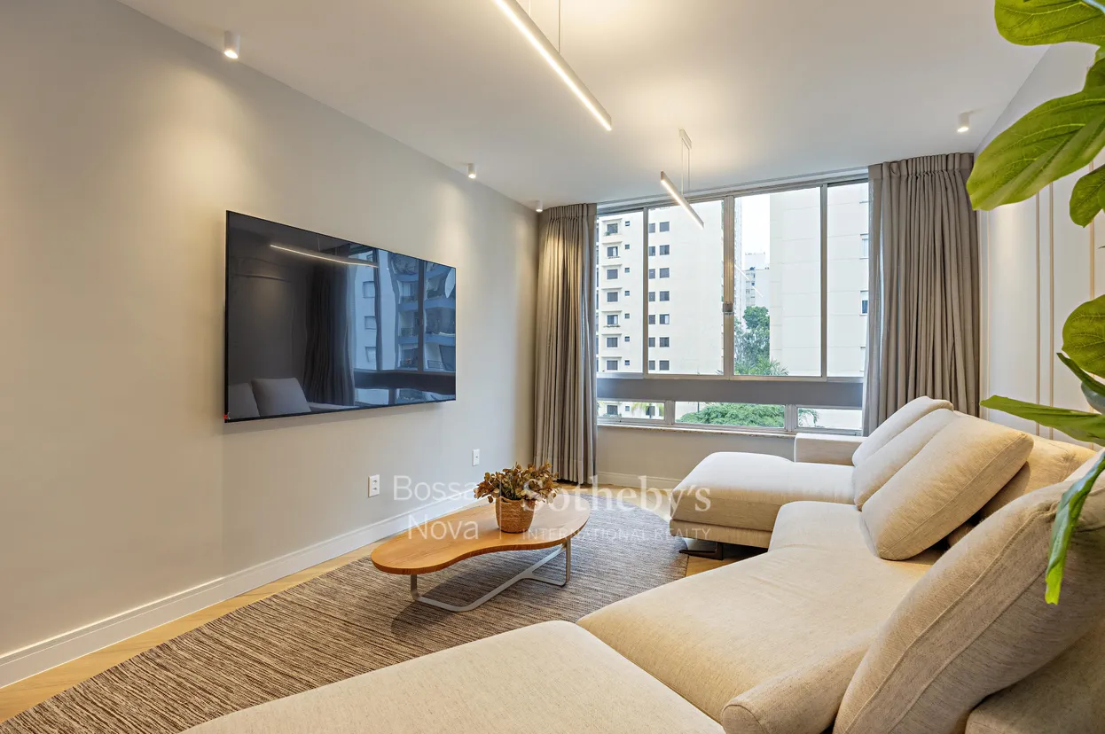 Apartamento com planta funcional, que se destaca pela excelente entrada de luz natural e ventilação cruzada, favorecidas por janelas em duas orientações na área social. O imóvel passou por reforma completa nas instalações elétrica e hidráulica, além de receber marcenaria planejada em todos os ambientes. O projeto inclui iluminação em LED com luminárias contemporâneas, revestimentos de acabamento selecionado, espelhos e box instalados. A cozinha conta com cooktop e forno embutidos, integrada à proposta prática do espaço. O apartamento dispõe ainda de infraestrutura preparada para instalação de sistema de ar-condicionado nos dormitórios e na sala, compondo uma solução organizada e atualizada para o dia a dia.