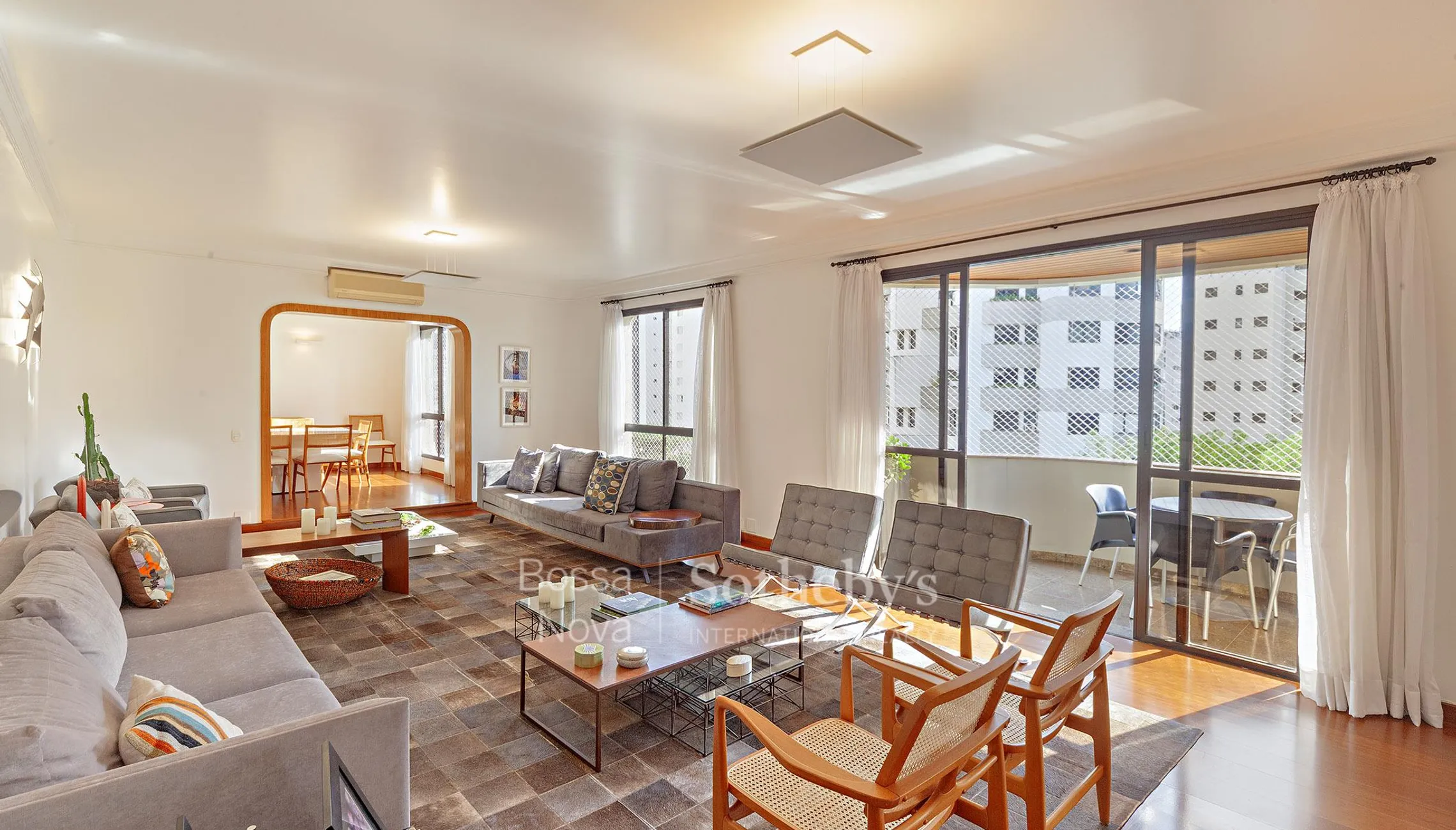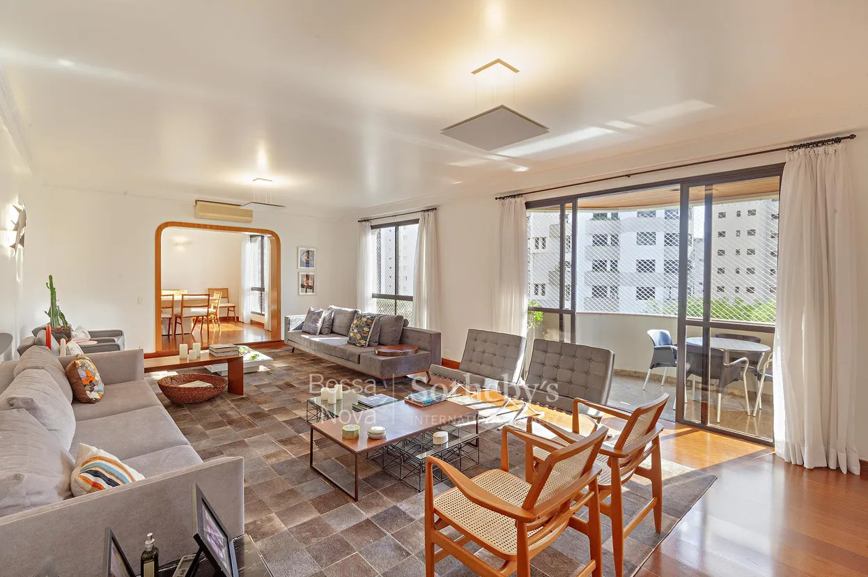 Próximo ao Parque Ibirapuera e à Praça Pereira Coutinho, este apartamento se destaca pela vista livre e pela excelente iluminação natural. O living com janelas piso-teto integra dois ambientes de estar, terraço e sala de jantar, além de um escritório. Na área íntima, todas as suítes contam com terraço, sendo a master composta por dois walk-in closets e banheiro sr. e sra., originalmente duas suítes, facilmente reversível. Há ainda uma sala multifuncional, atualmente utilizada como sala de TV. A cozinha conecta-se à sala de almoço, com possibilidade de integração, e o imóvel conta também com depósito privativo na garagem. O edifício é bem conservado, com jardim, playground, salão de festas e academia.