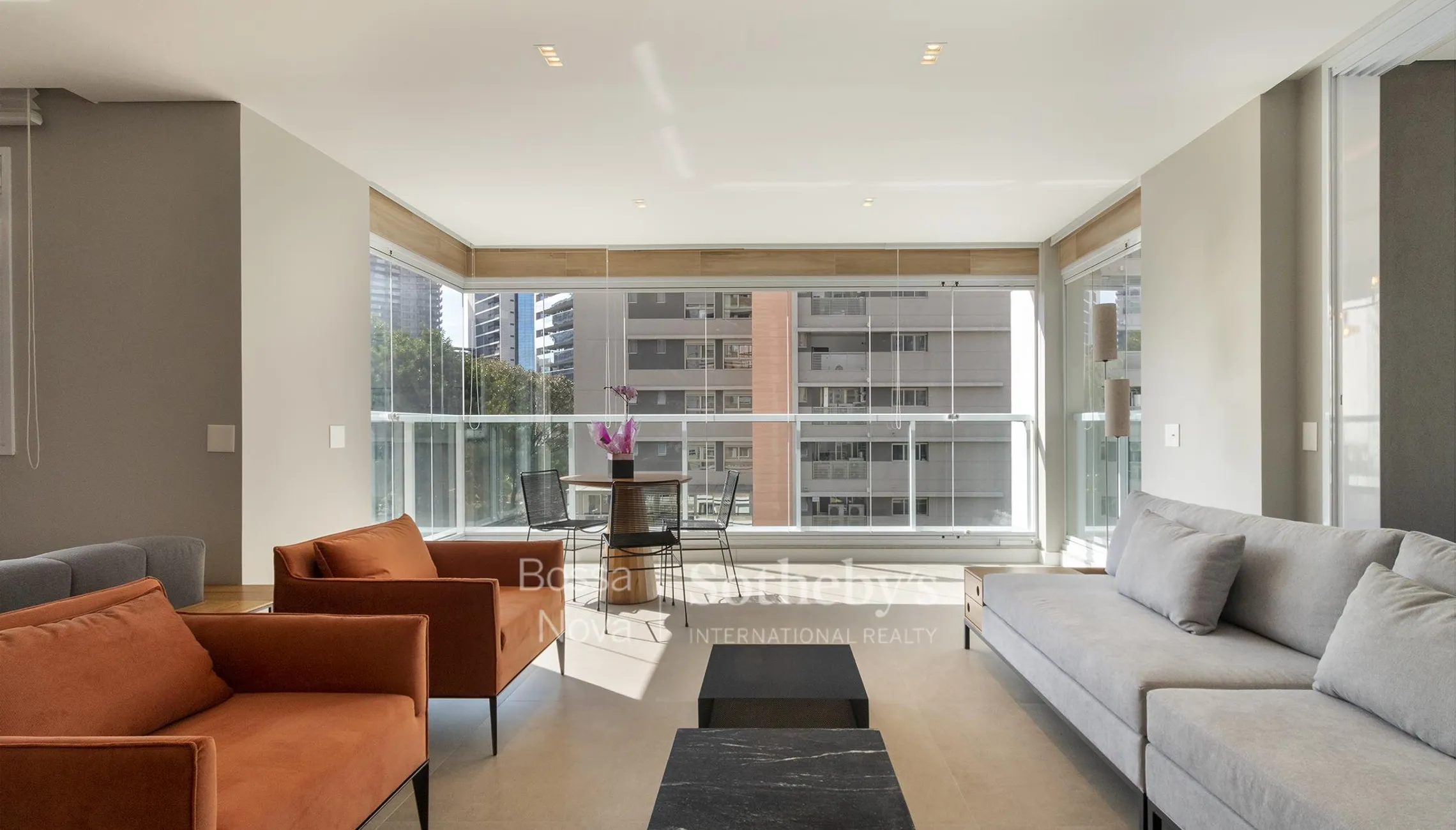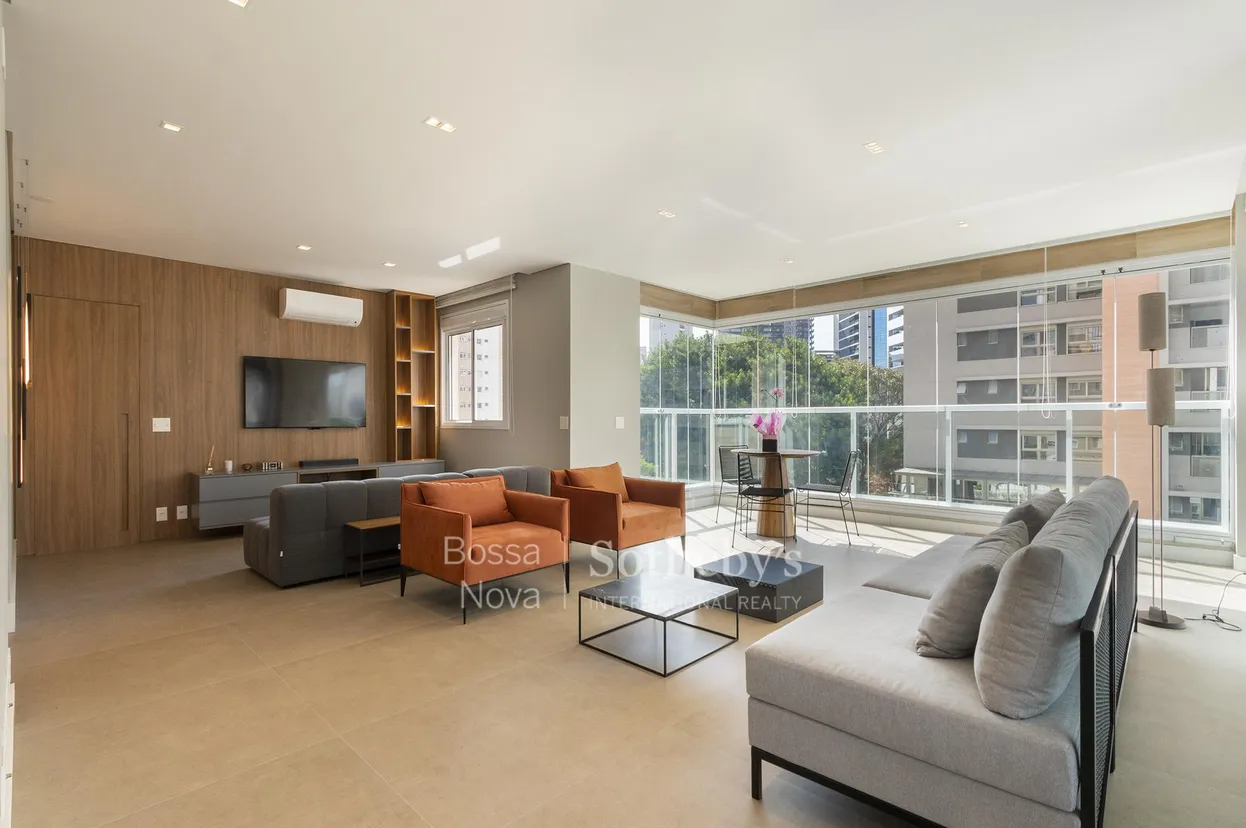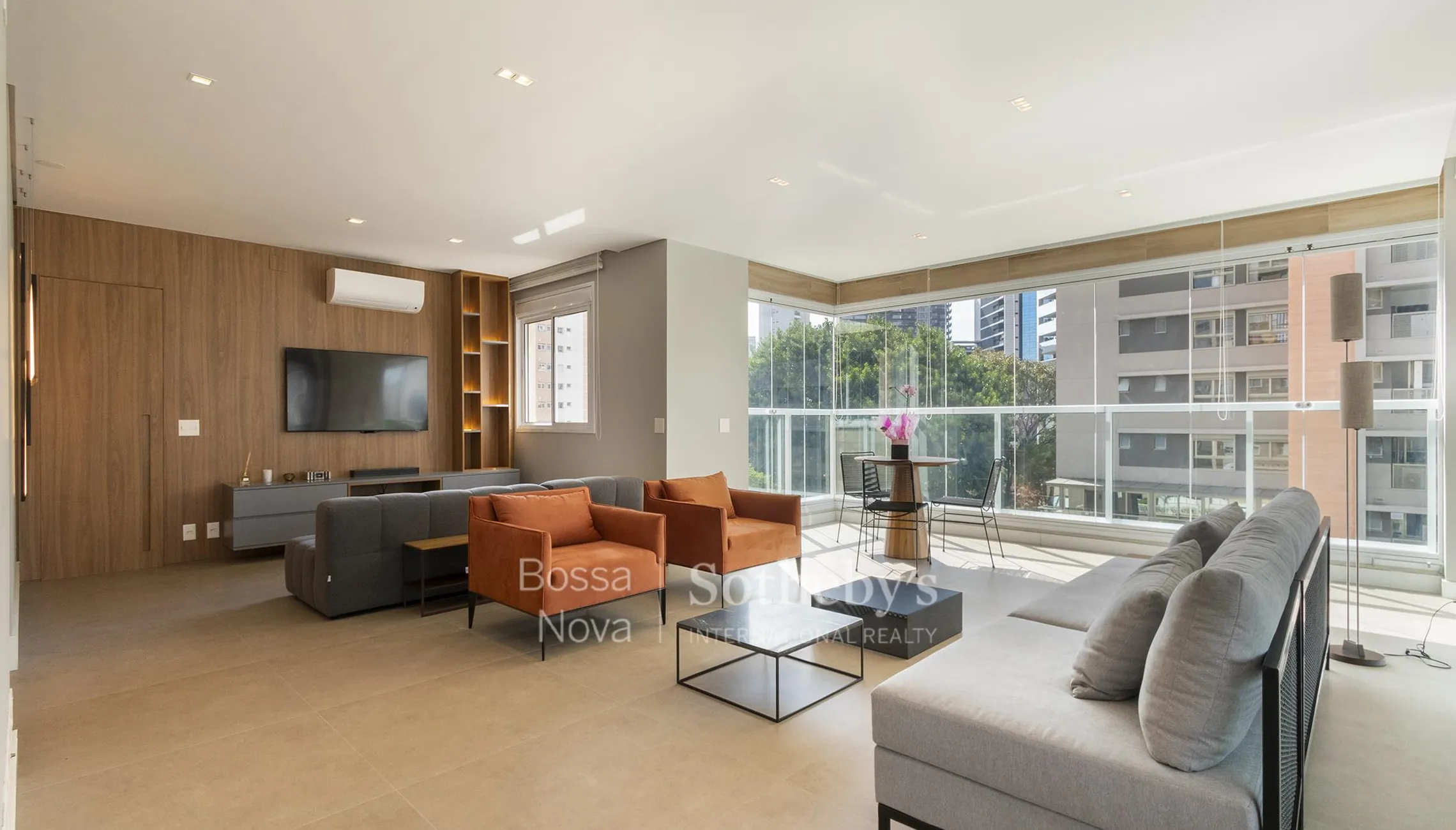 Em localização estratégica próxima à Avenida Faria Lima, este apartamento se destaca por seu projeto contemporâneo e integração dos ambientes. O acesso se dá por hall privativo, que leva a um living claro e ventilado com dois terraços, sendo um deles gourmet com churrasqueira. A cozinha é equipada e integrada à área social, e o imóvel conta ainda com lavabo e hall de serviço com porta blindada. Na área íntima, são duas suítes com persianas elétricas e roupeiro no corredor. Entre os diferenciais técnicos estão ar-condicionado Daikin em todos os ambientes, aspiração central e armários Kitchens. O condomínio oferece piscina de raia, academia e brinquedoteca.