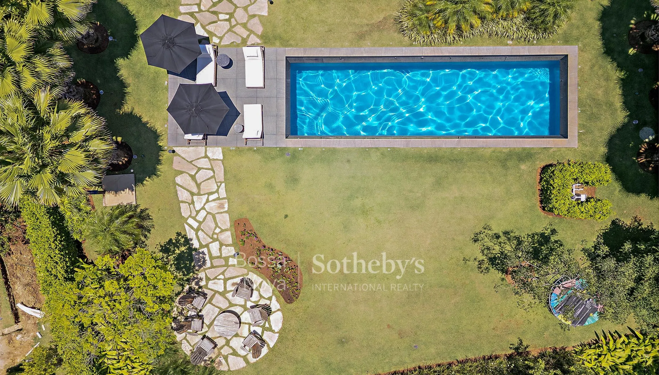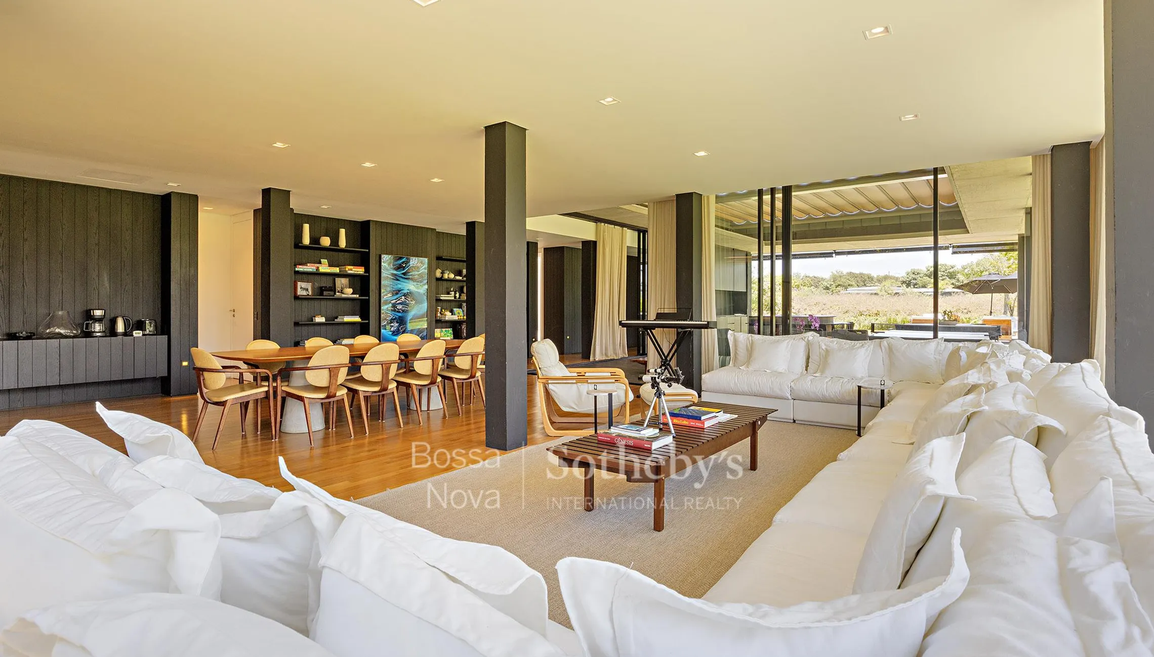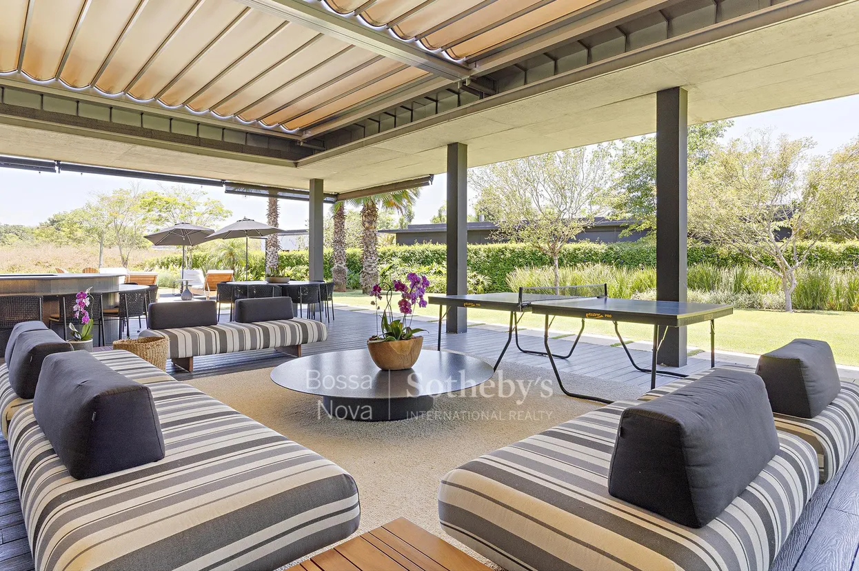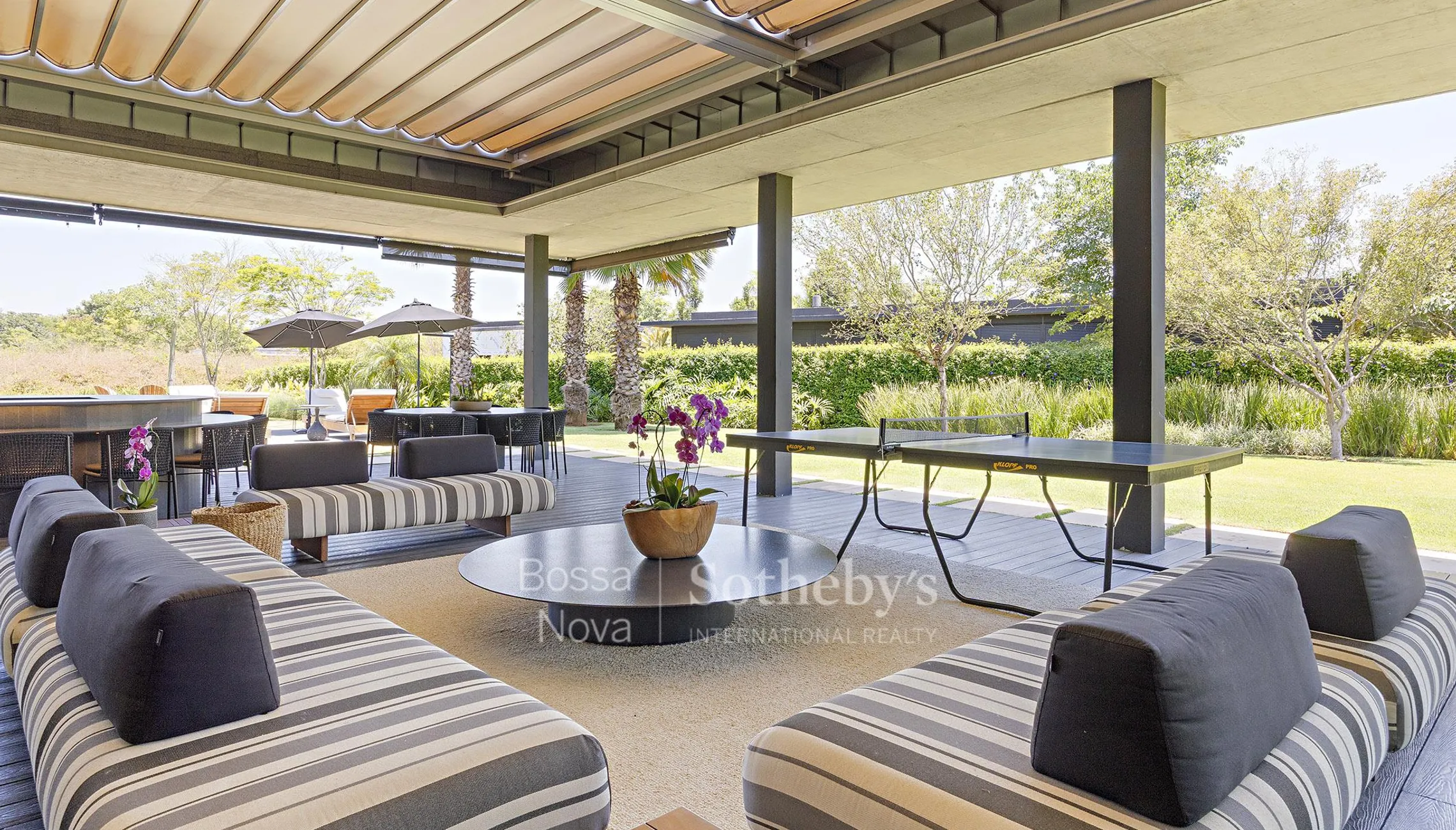 Em um dos residenciais da Fazenda Boa Vista, esta Sport House térrea valoriza a integração entre arquitetura e natureza, com projeto envidraçado que se abre para o paisagismo de um terreno de 2.400 metros quadrados. São 457 metros quadrados de área construída, complementados por um deck de 100 metros quadrados com sistema de cobertura retrátil, onde se encontram a área gourmet com churrasqueira e o espaço de estar junto à piscina. A área social reúne living iluminado, sala de jantar, sala de TV e cozinha integrada com ilha, equipada com eletrodomésticos Gorenje e marcenaria em inox. A planta contempla cinco suítes, todas mobiliadas, além de dependência para funcionário. O imóvel oferece sistema de automação, energia solar e estacionamento coberto para quatro carros. A venda inclui todo o mobiliário e itens de decoração.