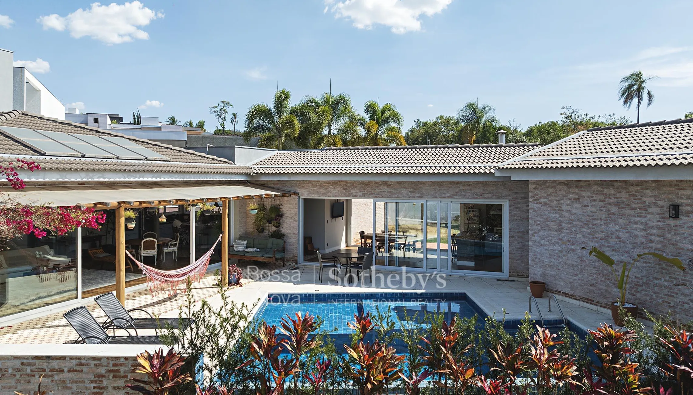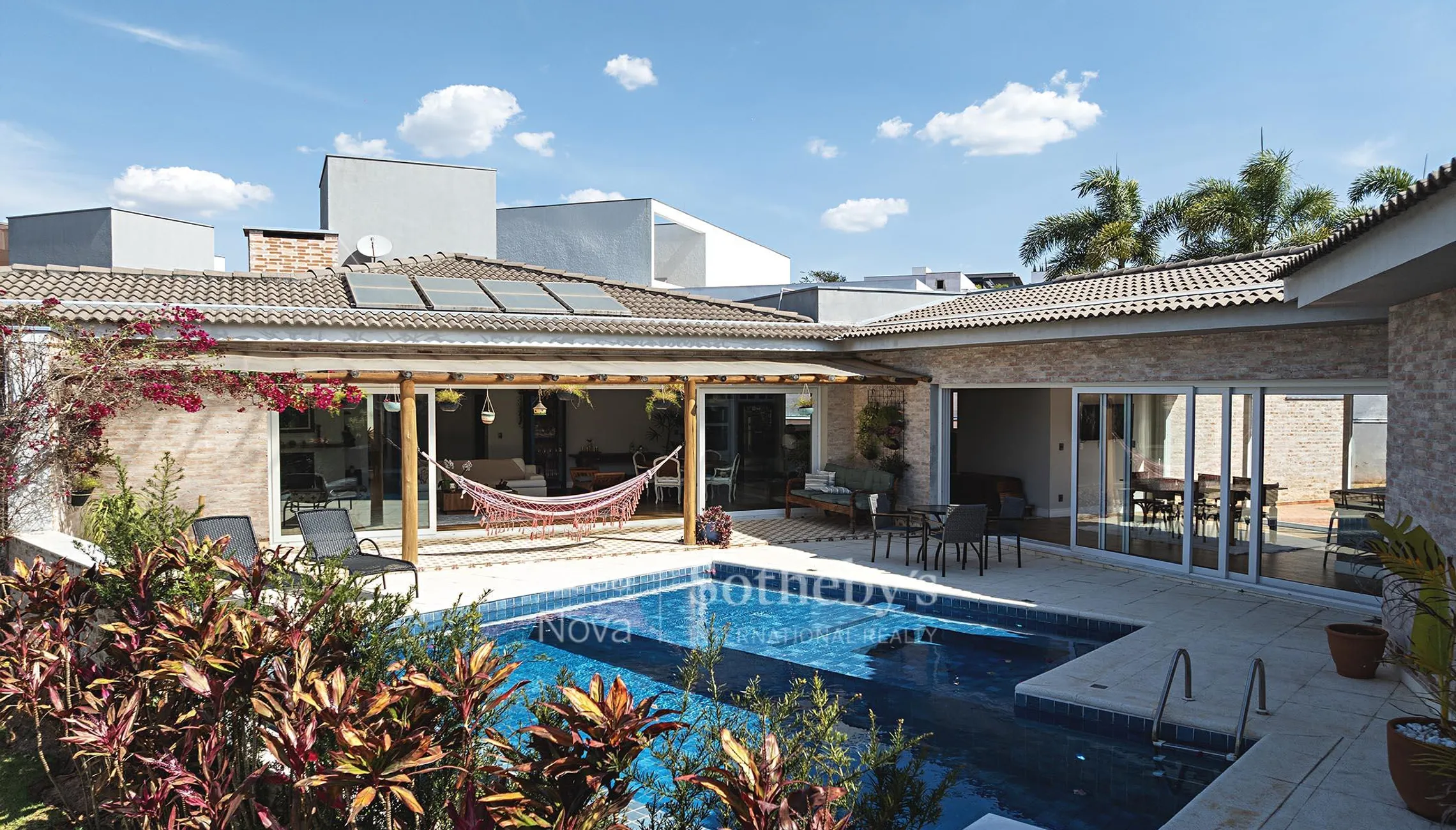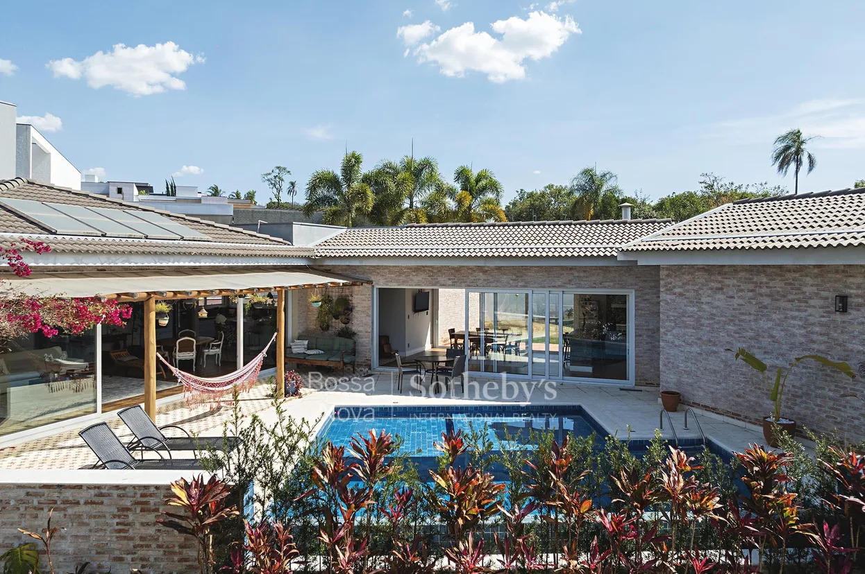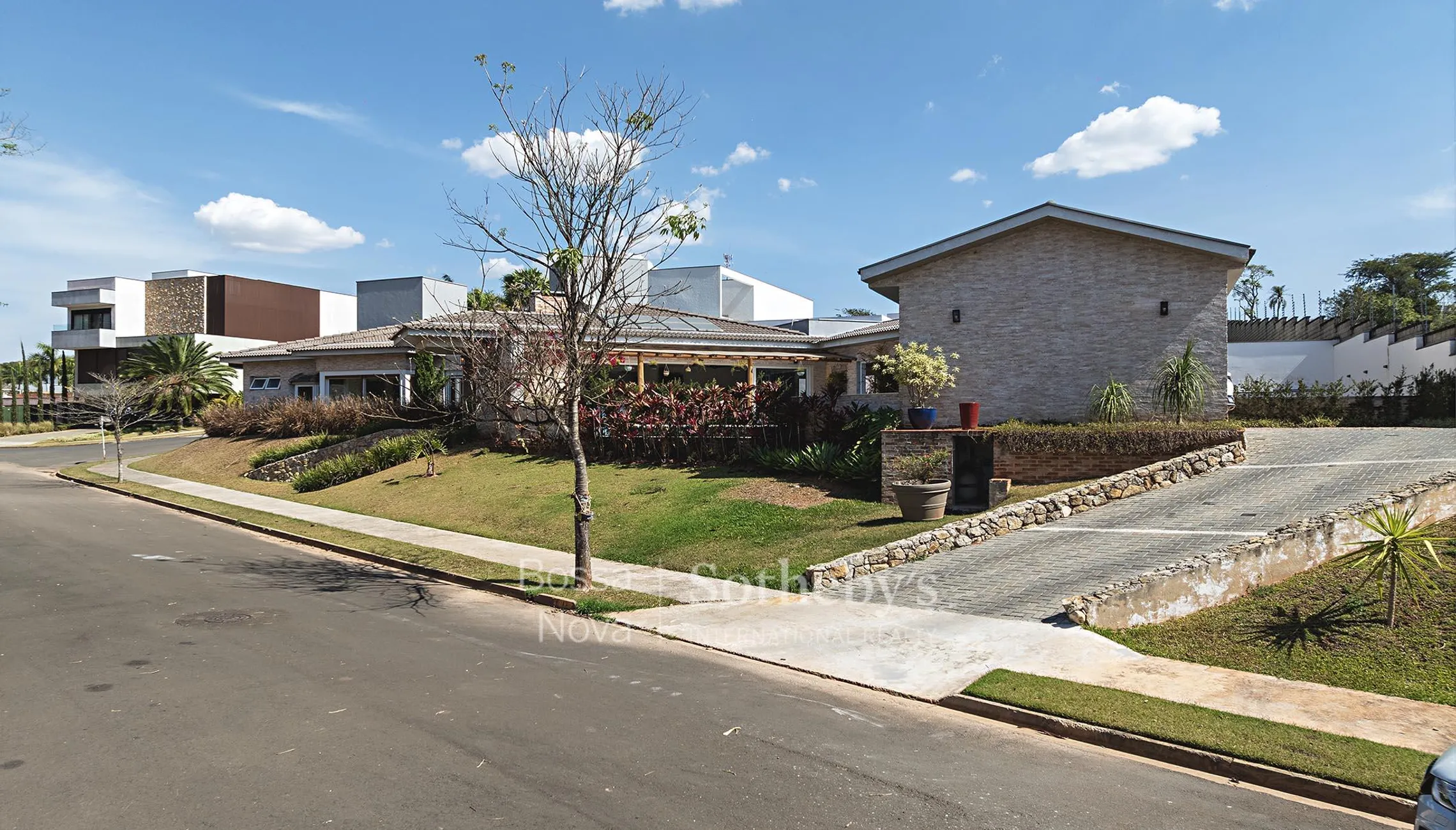 Casa térrea de esquina com vista aberta para o bosque. A área social é composta por sala com lareira e espaço gourmet integrado à piscina climatizada. A planta inclui escritório e três suítes, sendo a principal com closet. Localizada em condomínio com infraestrutura de lazer completa, oferece clube, quadras, trilha ecológica, lagos e áreas verdes, além de segurança 24 horas.