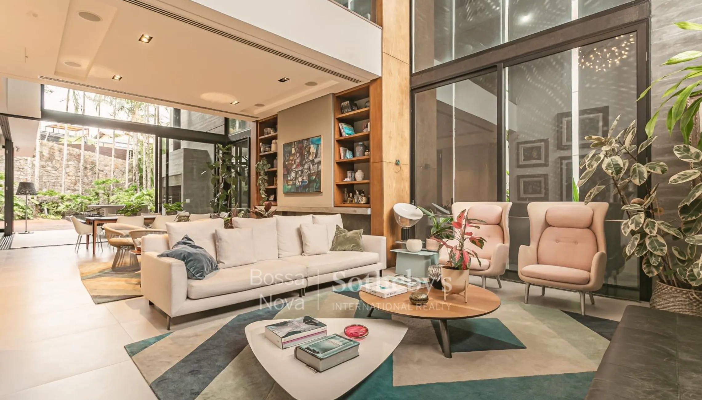 O living com lareira, a cozinha e a sala de jantar são totalmente integrados à área externa, que conta com jardim e piscina.