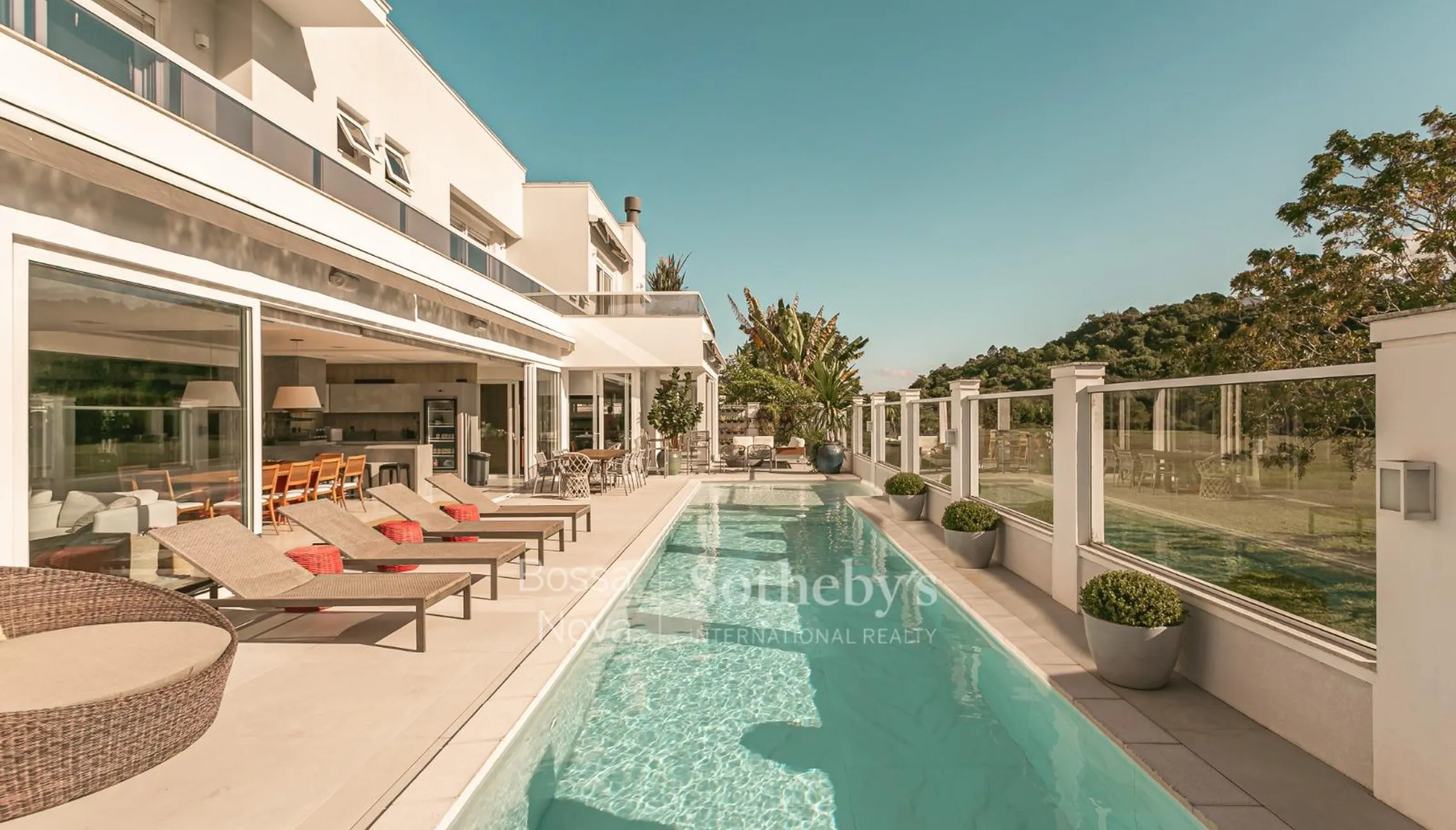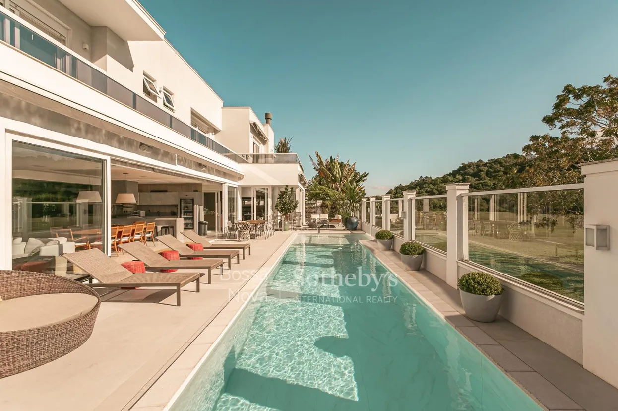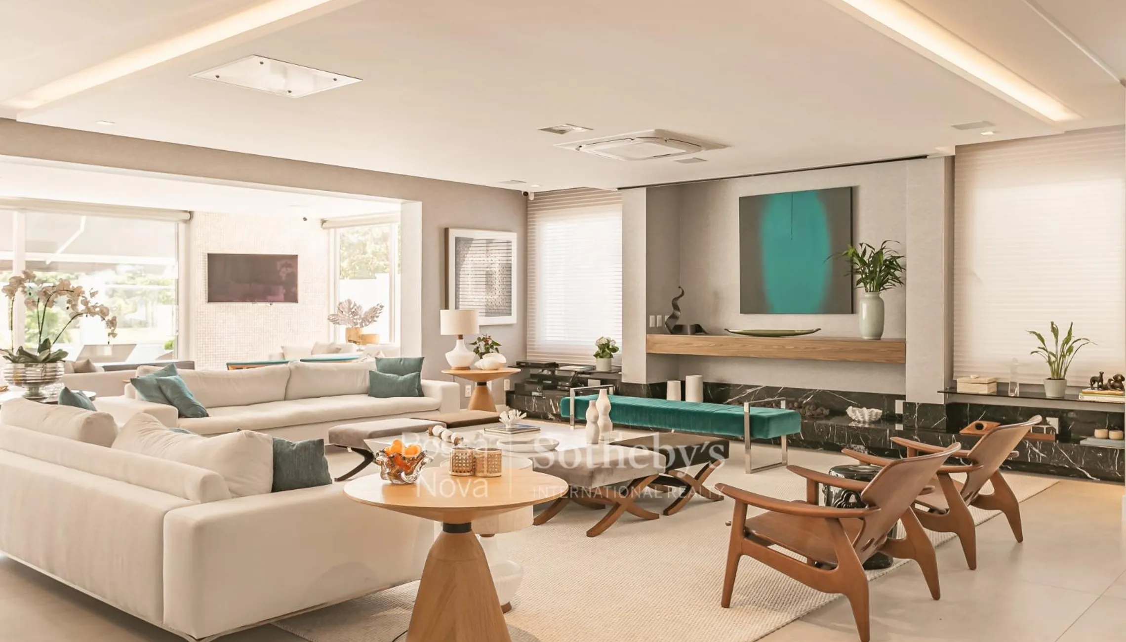 Localizada em condomínio fechado, esta residência oferece planta bem distribuída com integração entre os espaços sociais e vista aberta para a área verde. No pavimento térreo, os ambientes incluem hall de entrada, home office reversível para suíte, sala de TV, estar com lareira, jantar, bar com mesa de jogos, além de ampla cozinha conectada à varanda com espaço gourmet e piscina aquecida. Área de serviço, academia e garagem completam esse nível. No andar superior, há uma sala de cinema e cinco suítes, todas com sacada. Quatro delas possuem closet, incluindo a suíte principal, que conta com banheira e espaço beleza. A casa está mobiliada, climatizada e automatizada, com sistema de energia solar e fotovoltaico. Os ambientes são amplos, bem iluminados e ventilados.