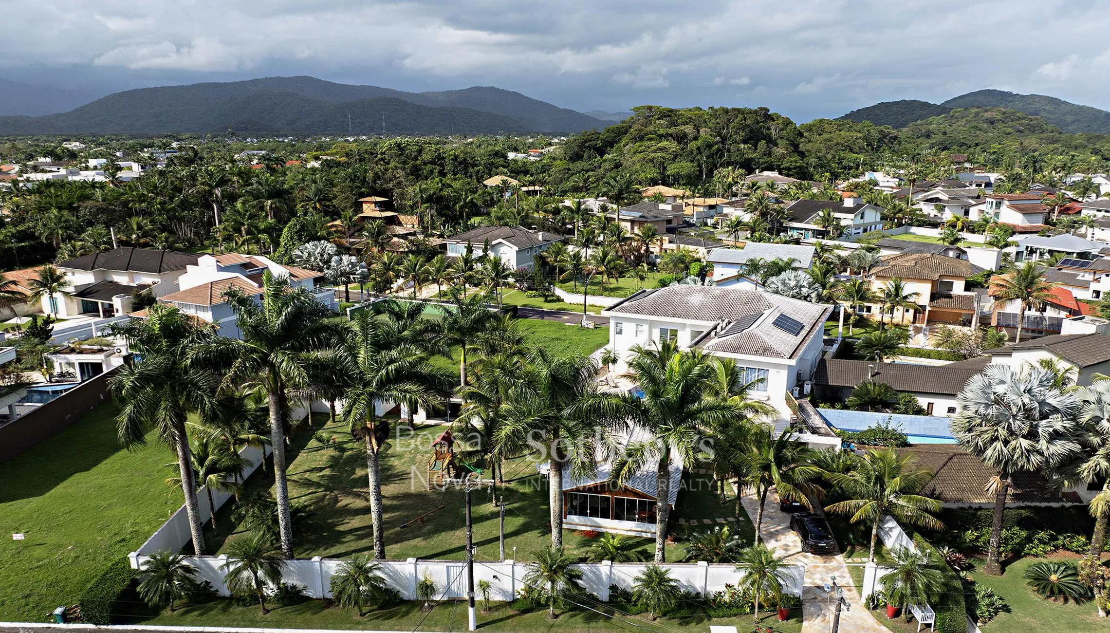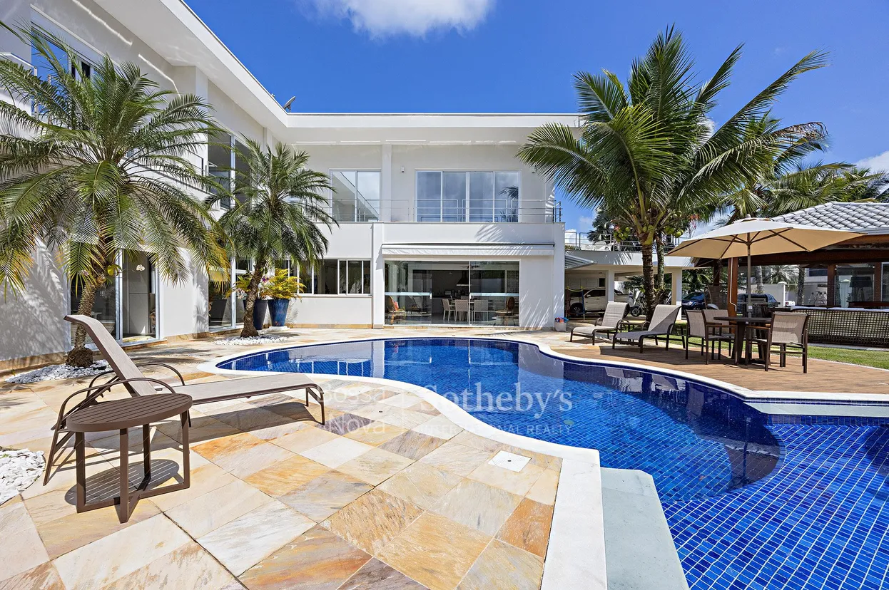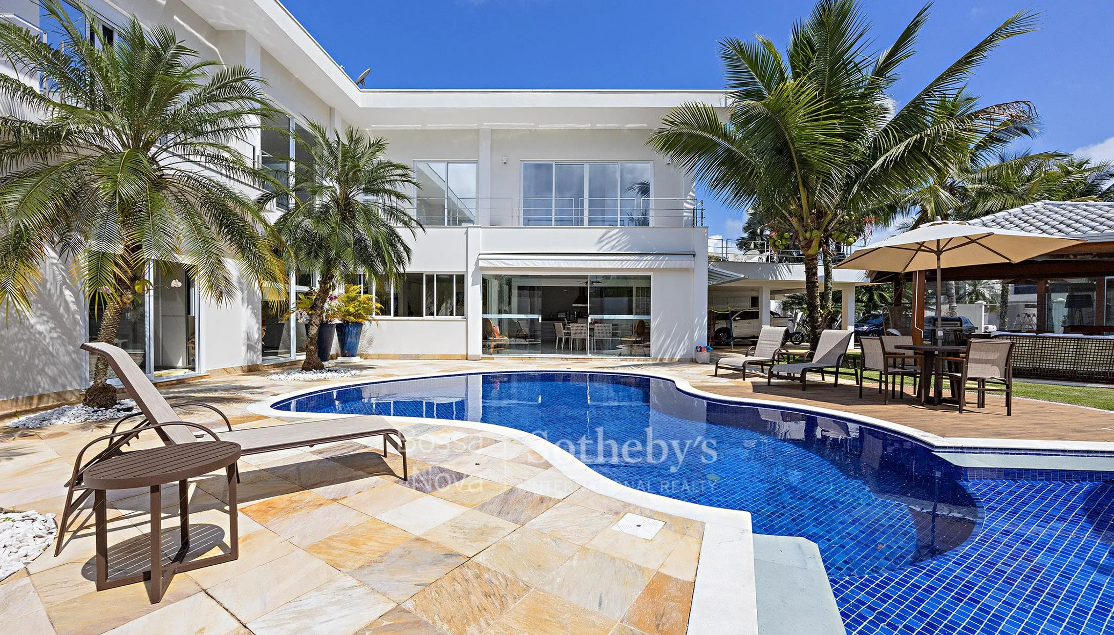 Banhada pela luz do sol ao longo de todo o dia, esta residência em condomínio fechado proporciona uma atmosfera acolhedora, unindo bem-estar, lazer e sofisticação. Com uma reforma contemporânea, os ambientes são amplos, iluminados e bem ventilados. O living com pé-direito duplo se integra à sala de jantar e ao espaço gourmet, equipado com forno de pizza e churrasqueira. No mesmo piso, há três suítes, lavabo, cozinha, despensa e área de serviço com lavanderia e banheiro para funcionário. No mezanino do piso superior, encontram-se a sala íntima e o home theater com acesso a um terraço externo aberto, além de outras três suítes, todas com walking closet. A suíte master se destaca pelo amplo banheiro com pia dupla e banheira de hidromassagem. Além da casa principal, o amplo terreno abriga duas construções adicionais que se conectam ao jardim com coqueiros. Um bangalô oferece espaço para academia, enquanto um salão de festas conta com lounge bar, chopeira e mesa de snooker. Para momentos de lazer, a propriedade conta ainda com piscina com banheiro de apoio e playground. A casa está equipada com monitoramento por câmeras, ar-condicionado em todos os ambientes, bomba compressora de água, sistema de aquecimento solar com boiler elétrico e gerador para suprir eventuais quedas de energia. O condomínio oferece serviço de praia, playground, campo de futebol society, projeto para quadra de beach tênis e segurança 24 horas, garantindo conforto e exclusividade para toda a família.