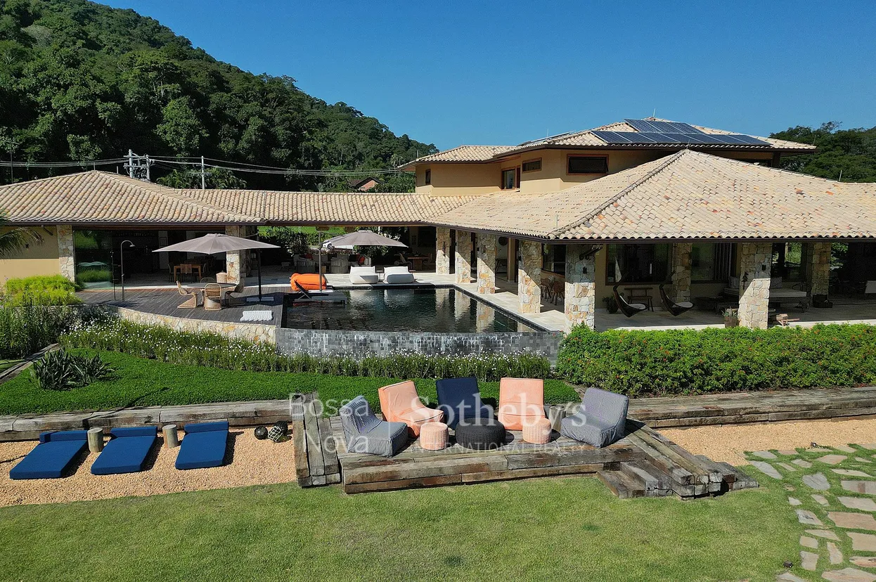 Raridade em condomínio de luxo, reformada e ampliada, com projeto de George Barthel e paisagismo da Landscape. A casa duplex tem 80 m de frente para o canal, garantindo privacidade e segurança. No térreo, ambientes integrados incluem living para dois ambientes, varanda, área gourmet com churrasqueira, hidromassagem aquecida, sauna, escritório, home theater, duas suítes, lavabo, copa e cozinha, área de serviço, lavanderia e dependência com quatro quartos e banheiro. A área de lazer possui lounge, salão de jogos, bar, academia, piscina, três suítes para hóspedes e quadra poliesportiva. Na frente, há um deck para lancha de até 50 pés. No andar superior, a suíte máster tem vista para o canal e mais quatro suítes. A casa tem placas solares e seis vagas, sendo duas cobertas. O condomínio oferece infraestrutura completa com aeroporto, heliponto, fazendinha, marina, trilhas, praia e hotel.