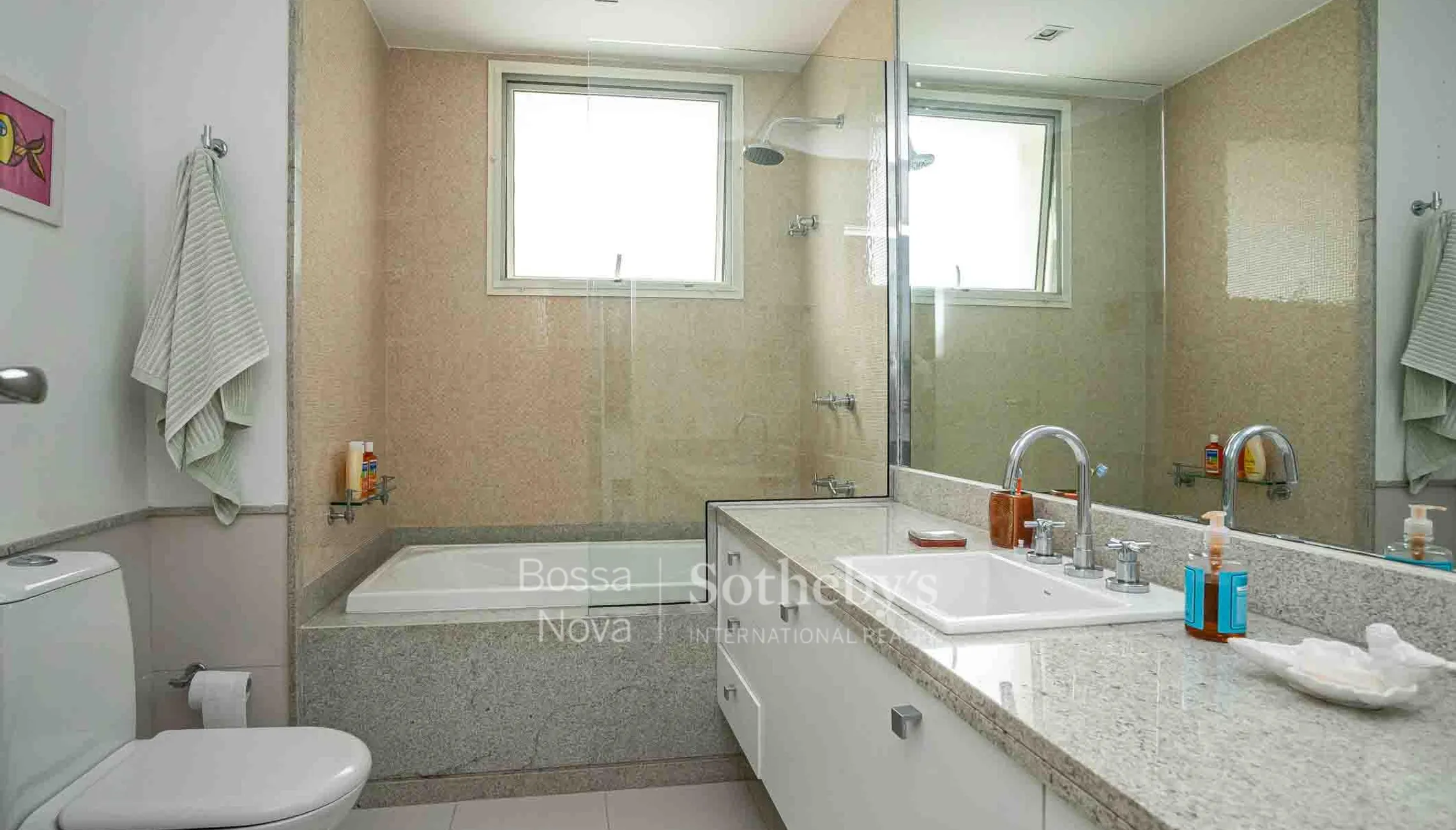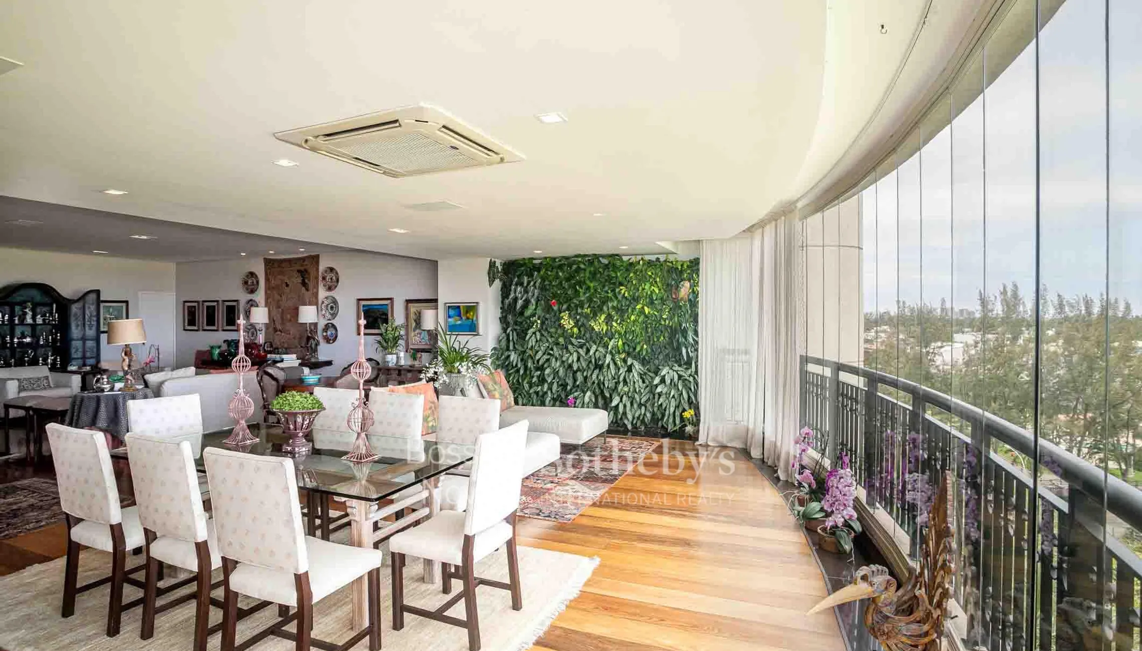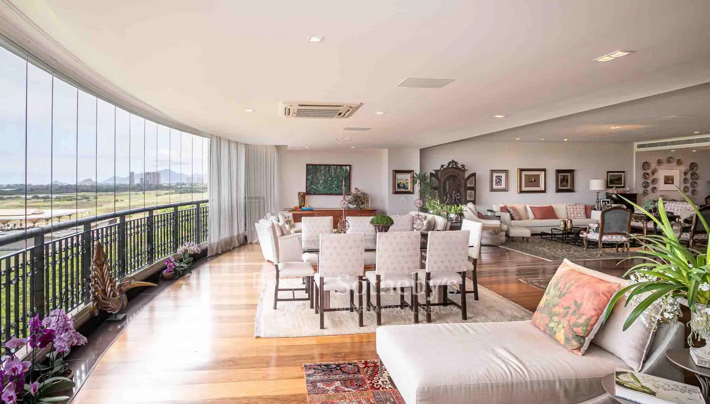 Apartamento no condomínio Riserva Uno, na Barra da Tijuca, com 550 m² e vista livre para o campo de golfe. A área social é composta por amplo living em tábuas corridas, distribuído em seis ambientes e conectado à sala de jantar independente, além de lavabo. Originalmente com cinco suítes, o imóvel atualmente dispõe de quatro, sendo a principal com dois banheiros e varanda privativa. Uma das suítes foi transformada em sala íntima separada da área social, ideal para leitura ou entretenimento. Todos os banheiros possuem ventilação e iluminação natural. A cozinha planejada é moderna e funcional, com ilha central, despensa, roupeiro e lavanderia independente.