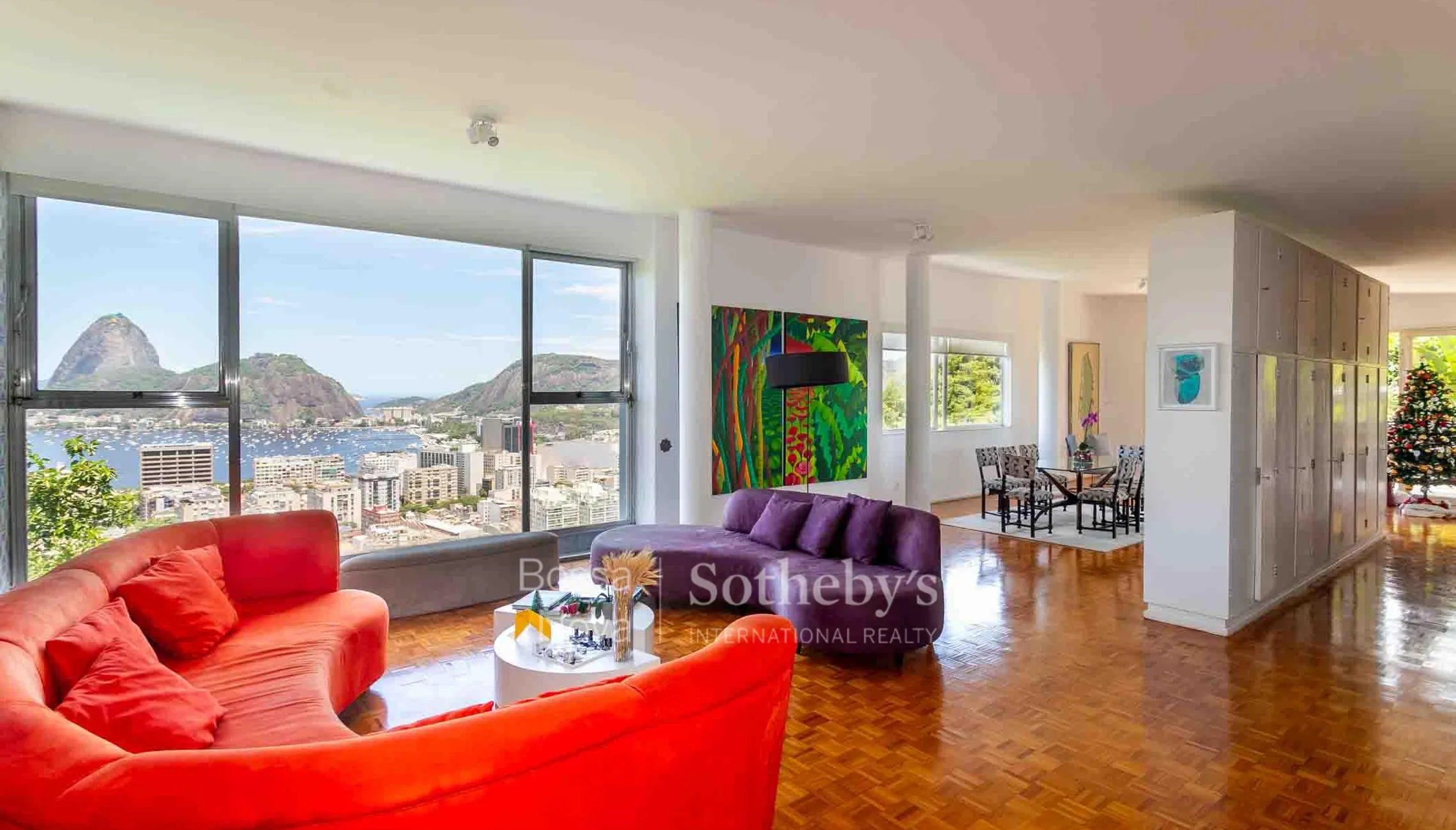 Esta cobertura duplex está localizada em Botafogo e oferece vista aberta e permanente para a Baía de Guanabara e o Pão de Açúcar, com pé-direito elevado e ambientes amplos integrados à paisagem. Distribuído em dois pavimentos, o imóvel conta com escada em madeira e elevador privativo, além de salas bem dimensionadas, lavabo e cozinha funcional. A área íntima dispõe de seis dormitórios com closets, incluindo uma suíte principal, garantindo boa distribuição e privacidade entre os ambientes. O condomínio oferece infraestrutura de lazer com piscina, sauna a vapor, churrasqueira, áreas de convivência e sistema de segurança. O imóvel conta ainda com quatro vagas de garagem e está inserido em entorno arborizado, próximo a escolas, clubes e centros esportivos.