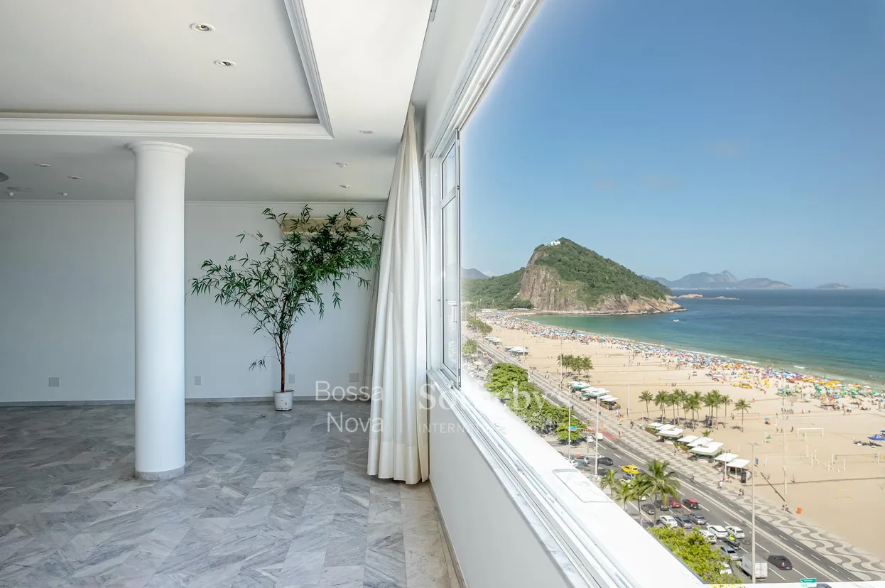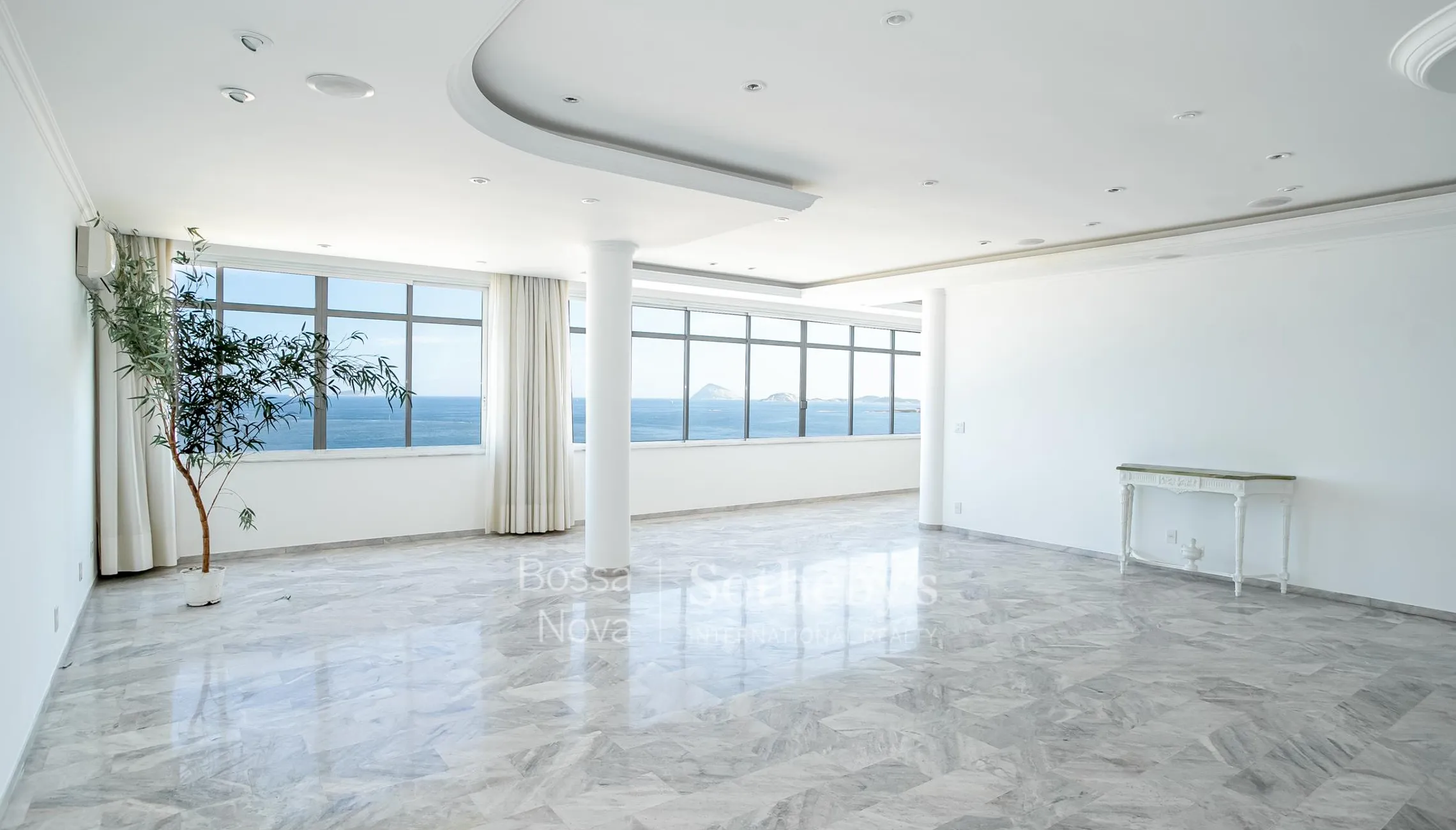 Excelente cobertura, localizada em prédio clássico com 1 apartamento por andar. São 561 m², divididos em dois andares, com vista frontal mar. Piso em mármore carrara na sala e escada. Sala em três ambientes, lavabo e escritório. Copa-cozinha e uma dependência completa de funcionários. No segundo piso possui um amplo salão, cozinha de apoio, lavabo, três quartos, sendo uma suíte com closet e uma despensa, mais dois quartos sendo uma suíte com closet e banheiro com hidromassagem. Terraço com bancada e churrasqueira. Piscina com cachoeira. São duas vagas na escritura e portaria 24hs.