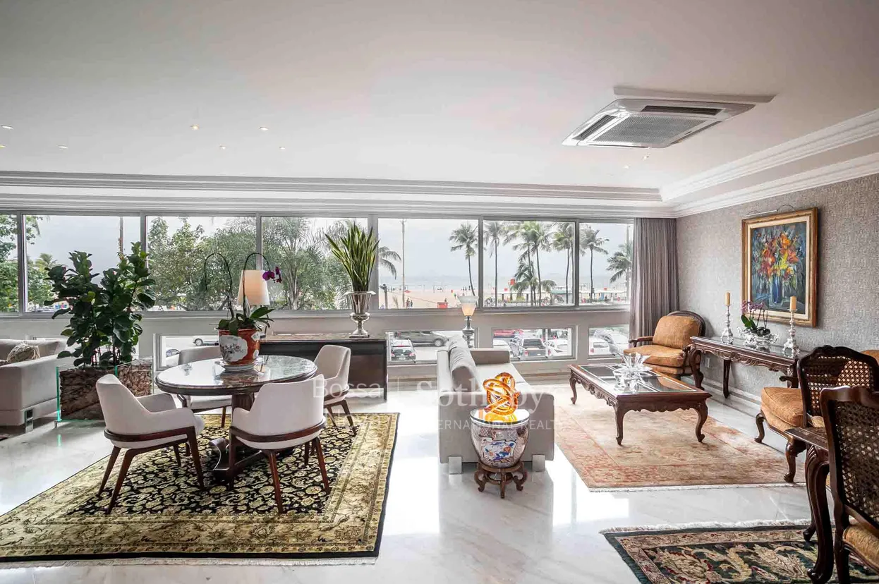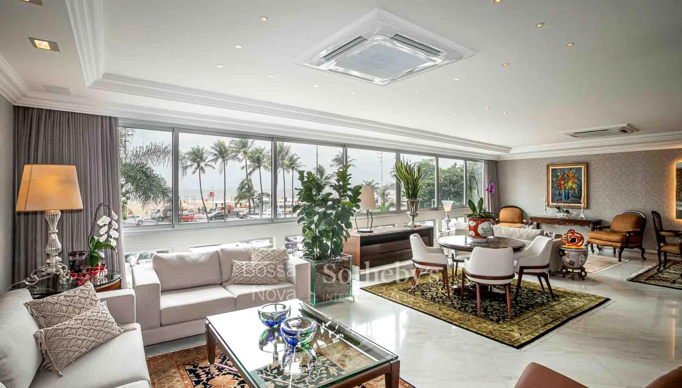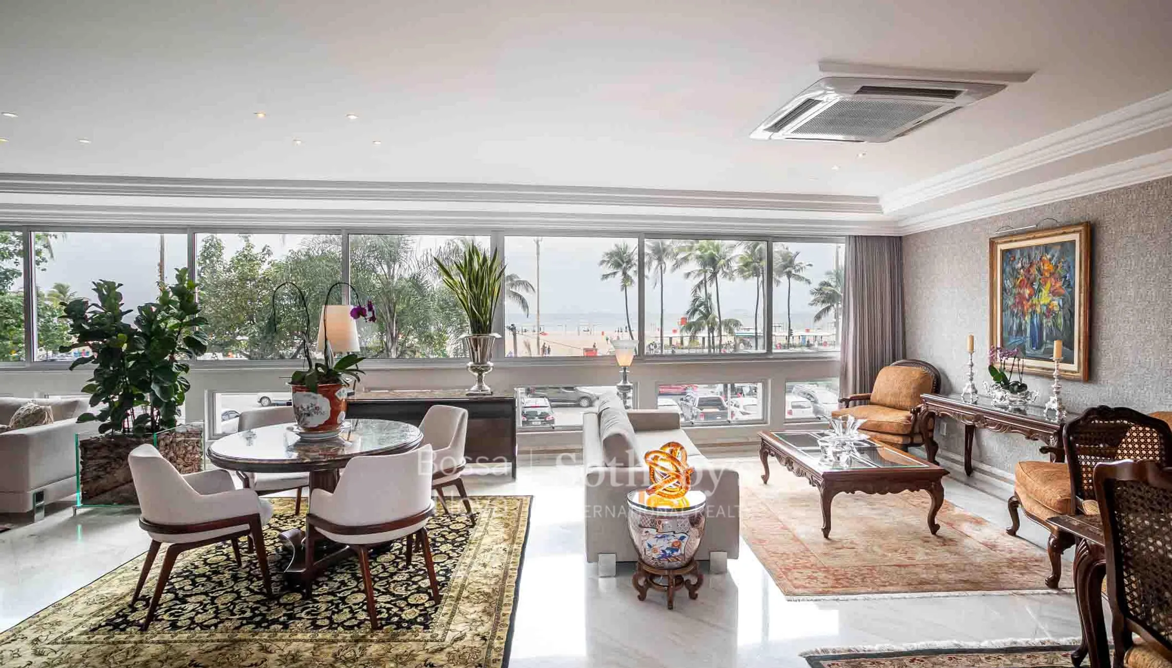 Apartamento de frente para a praia de Copacabana, com vista ampla e permanente para o mar. Bem localizado, possui hall privativo e planta generosa, com living para três ambientes integrando salas de estar, jantar e TV, favorecido por excelente iluminação natural. Conta ainda com lavabo, cozinha funcional, área de serviço e dependência completa. Na área íntima, estão a suíte principal com closet, dois dormitórios e banheiro social. O imóvel dispõe de uma vaga de garagem livre na escritura e portaria com segurança 24 horas, garantindo praticidade e conforto em um dos endereços mais tradicionais do Rio de Janeiro.