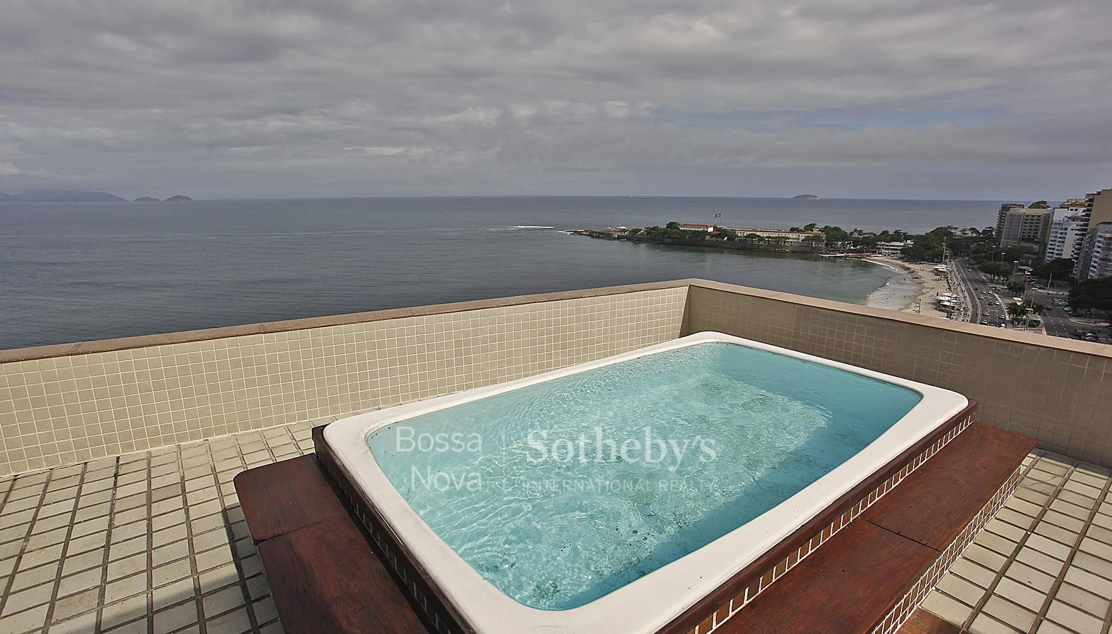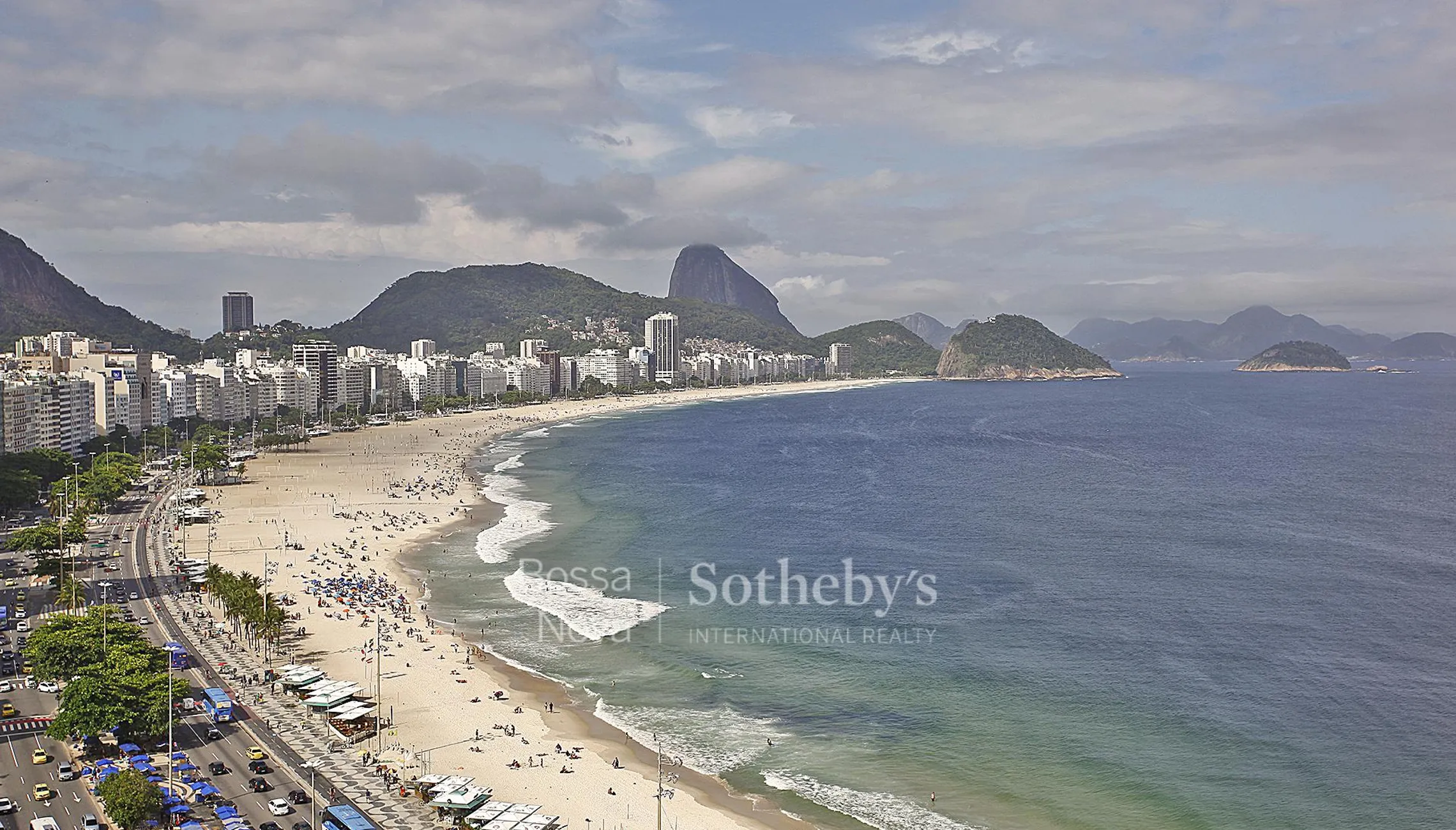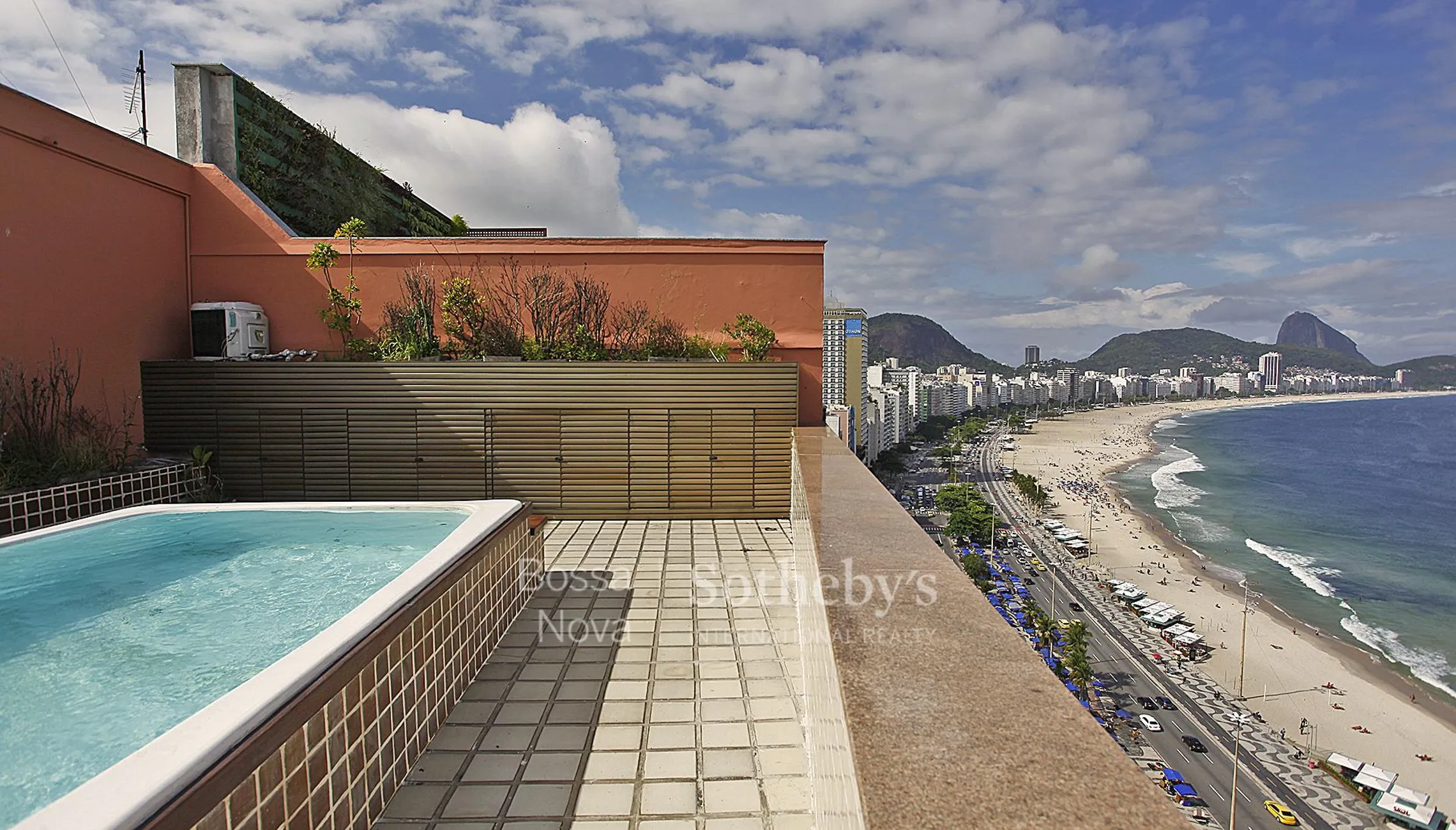Esta cobertura duplex com vista panorâmica para o mar e para o Forte de Copacabana está localizada em um dos endereços mais desejados do Rio de Janeiro. O pavimento inferior conta com living para dois ambientes voltado para o mar, escritório, lavabo, copa e cozinha planejada com área de serviço e dependência completa. Na área íntima, há um dormitório e uma suíte, ambos com armários. O pavimento superior abriga um salão de convivência com bar, armários e acesso à área externa com piscina, de onde se pode contemplar a paisagem da orla. O piso em material de fácil manutenção e o layout funcional reforçam o conforto e a praticidade desta cobertura voltada ao lazer e bem-estar.