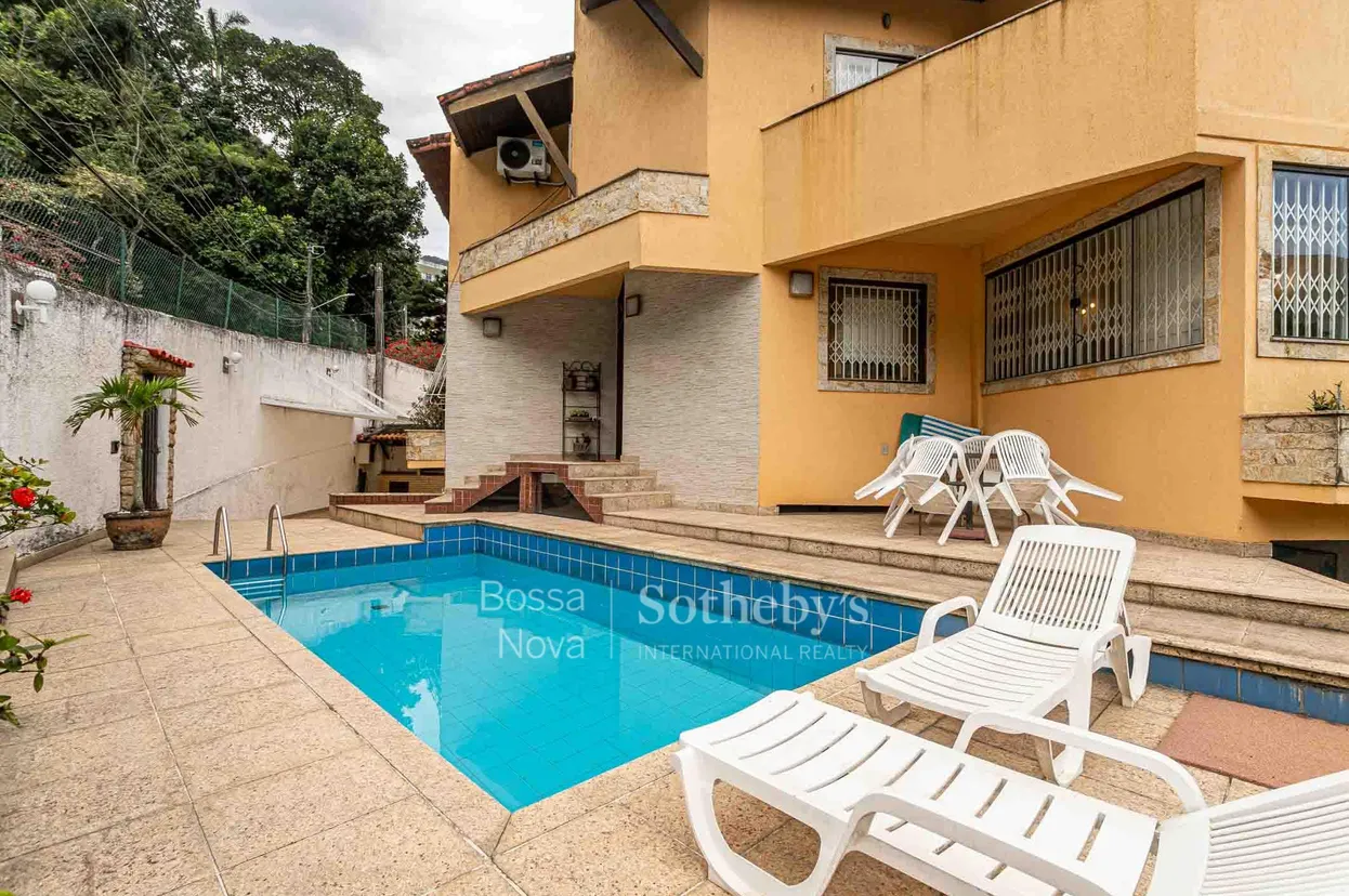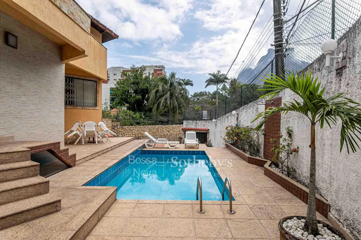 Localizada em uma rua tranquila de São Conrado, esta residência oferece planta funcional e ambientes bem distribuídos, com áreas sociais amplas e conectadas à área externa. O living para três ambientes inclui sala de jantar, bar e lavabo. A cozinha planejada é integrada à lavanderia e à área de apoio com dependência para funcionários. A área íntima conta com três dormitórios, sendo uma suíte principal com closet e dois dormitórios com sacada, além de banheiro social e home office. A área externa reúne espaço gourmet, piscina, sauna, salão de jogos e ambiente para descanso, em meio a paisagismo bem cuidado. A propriedade possui garagem para três veículos e está próxima a opções de lazer, serviços, praia e estação de metrô.