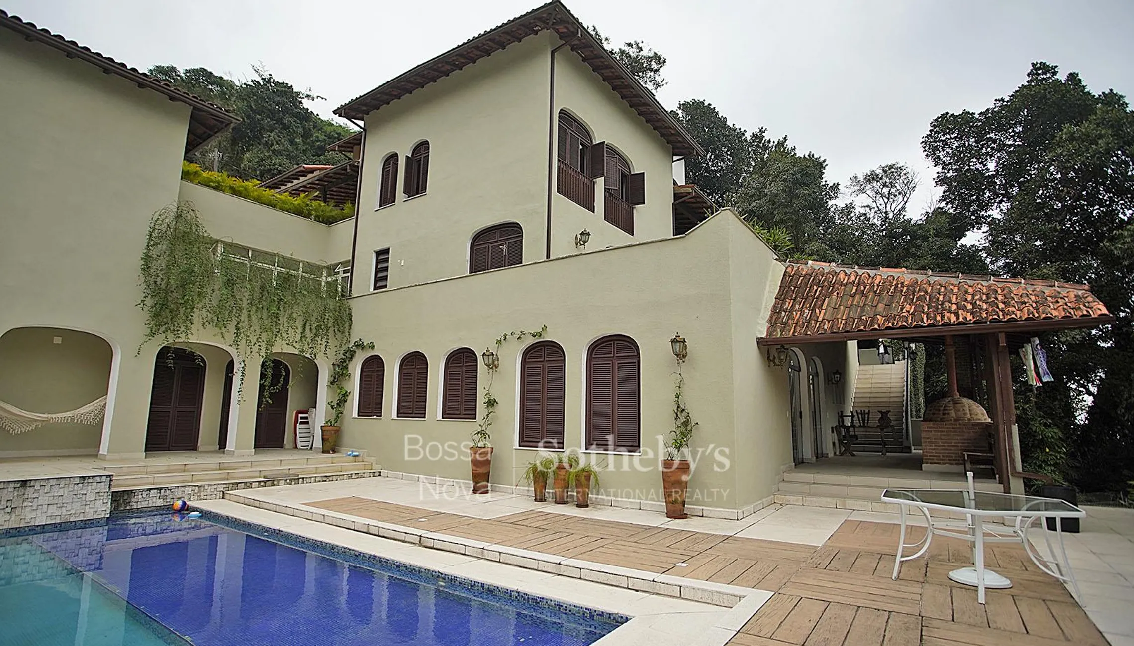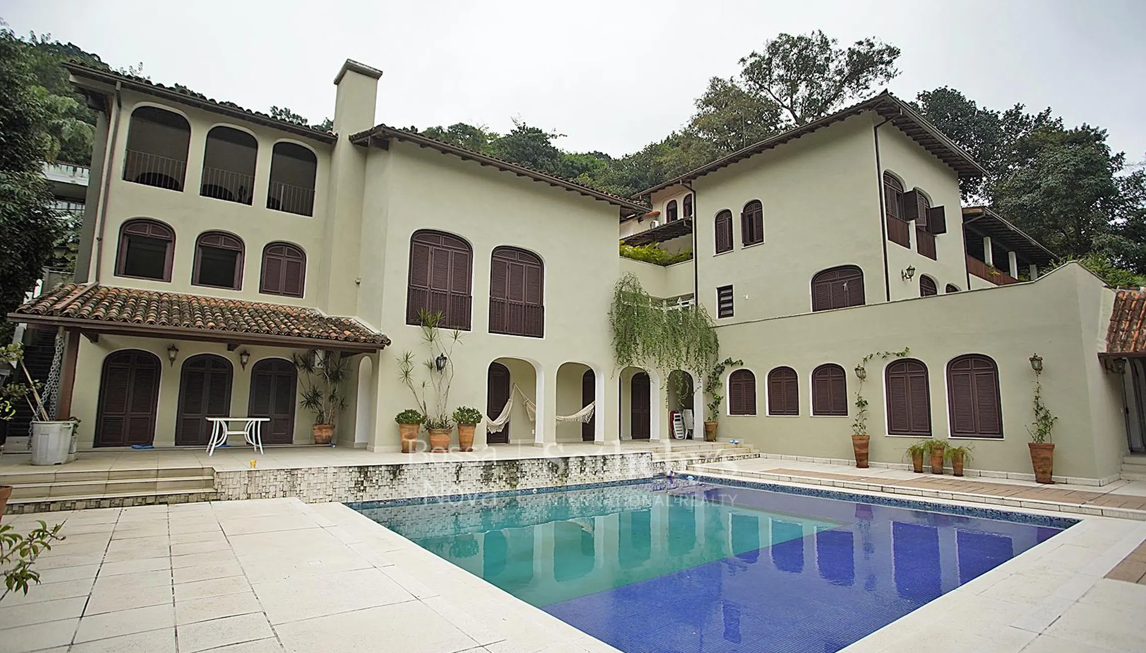Casa em condomínio fechado no alto da Gávea, duas casas independentes em único terreno, sendo que uma das casas é subdividida em duas sendo assim são três casas completas em único terreno. A primeira casa possui cinco andares, sendo um para cima e quatro para baixo. O primeiro andar possui um porão e quadra. O segundo andar dispõe de área de lazer com piscina, área coberta com forno e fogão a lenha, churrasqueira, bar, salão de jogos, sala de TV, dois banheiros completos e sauna com ducha. O terceiro andar conta com três quartos para funcionários, dois banheiros completos para funcionários, área de serviço com dois tanques, lavanderia e acesso para a segunda casa. O quarto andar está no nível da rua e dispõe de garagem, canil, horta, entrada social, lavabo, escritório, sala de estar com lareira e varanda, sala de TV com pé-direito de doze metros, sala de jantar, quarto para louças, pista de dardo, copa-cozinha e despensa. O último andar está há um nível acima da rua com quatro suítes completas sendo que uma tem varanda, uma tem banheiro com duas pias, outra com pé-direito de doze metros e a última com closet. Todas reformadas e com armários embutidos. A segunda casa fica localizada no terceiro andar da primeira casa com possibilidade de colocar um acesso externo. O primeiro andar conta com duas suítes sendo uma com closet, dois quartos e um banheiro completo. Todos os quartos têm armário embutido e acesso para a área externa onde fica a piscina. O segundo andar dispõe de um lavabo, sala de estar com lareira e pé-direito de doze metros, sala de jantar, quarto para louças, copa-cozinha, dois quartos para funcionários, banheiro completo para funcionários, área de serviço com dois tanques e entrada de serviço vindo direto da rua. E o último andar, no nível da rua, é composto pela garagem, entrada social, amplo salão com varanda e banheiro completo, pode ser considerado também uma suíte com varanda.