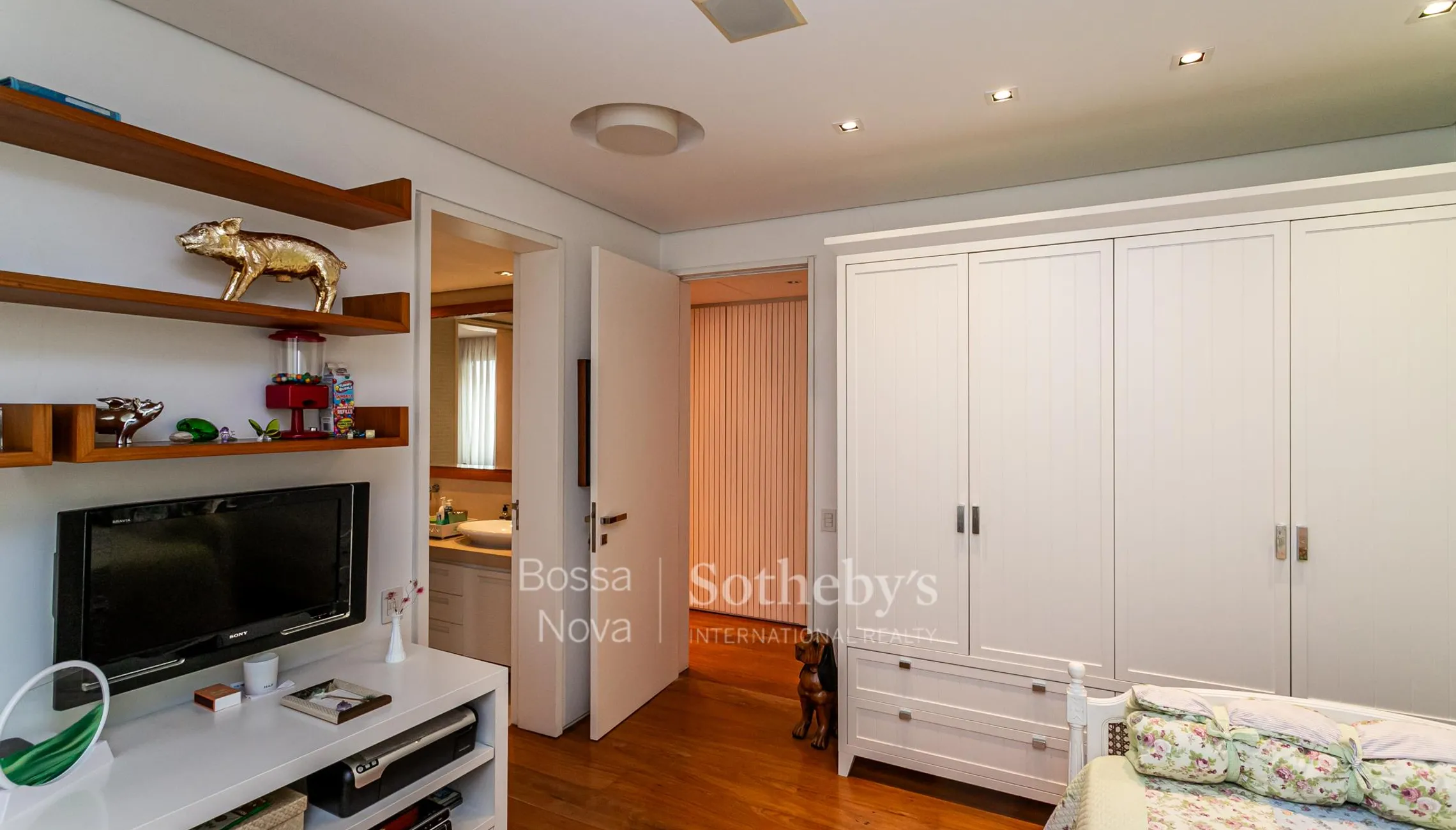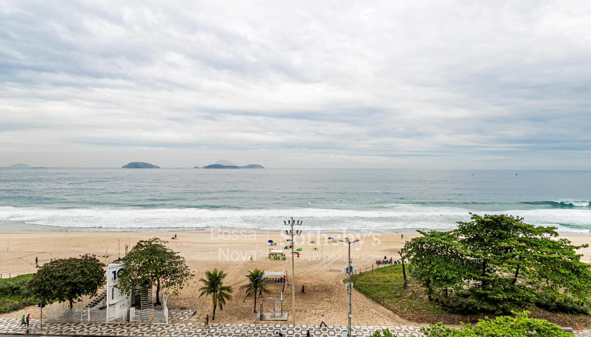 Prédio em centro de terreno, gabaritado, no quadrilátero. Excelente apartamento reformado, com projeto do arquiteto Cadas Abranches. São 330m², andar alto, com vista total para o mar. Possui esquadrias anti-ruído e piso em mármore Travertino na área social. A sala é dividida em três ambientes: estar, jantar e home theater, além de um escritório com vista para o mar. Há um lavabo. São quatro suítes, sendo uma canadense e a master com closet e vista para o mar. O piso dos quartos é em tábua corrida. A planta é circular. O apartamento possui ar condicionado central, sistema de automação, e as portas de serviço e social são blindadas. A copa-cozinha possui bancadas de Corian, ar condicionado, vista para o mar, armários da Kitchen e forno e fogão da Esmeg. Na área de serviço, há uma dependência de empregada e um banheiro de serviço. São três vagas na escritura, além de vaga para visitante, dois boxes para cada apartamento e sala de motorista. Portaria 24 horas.