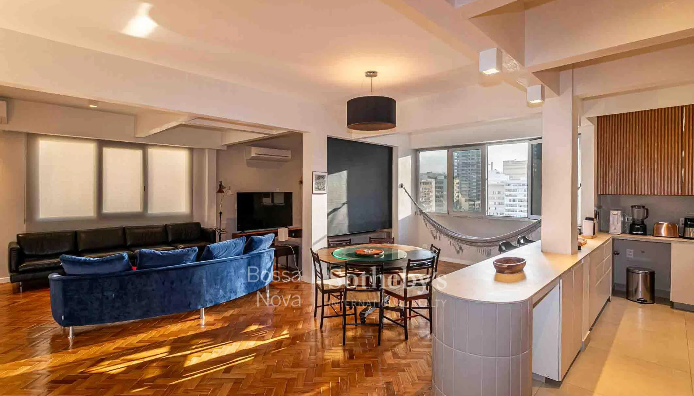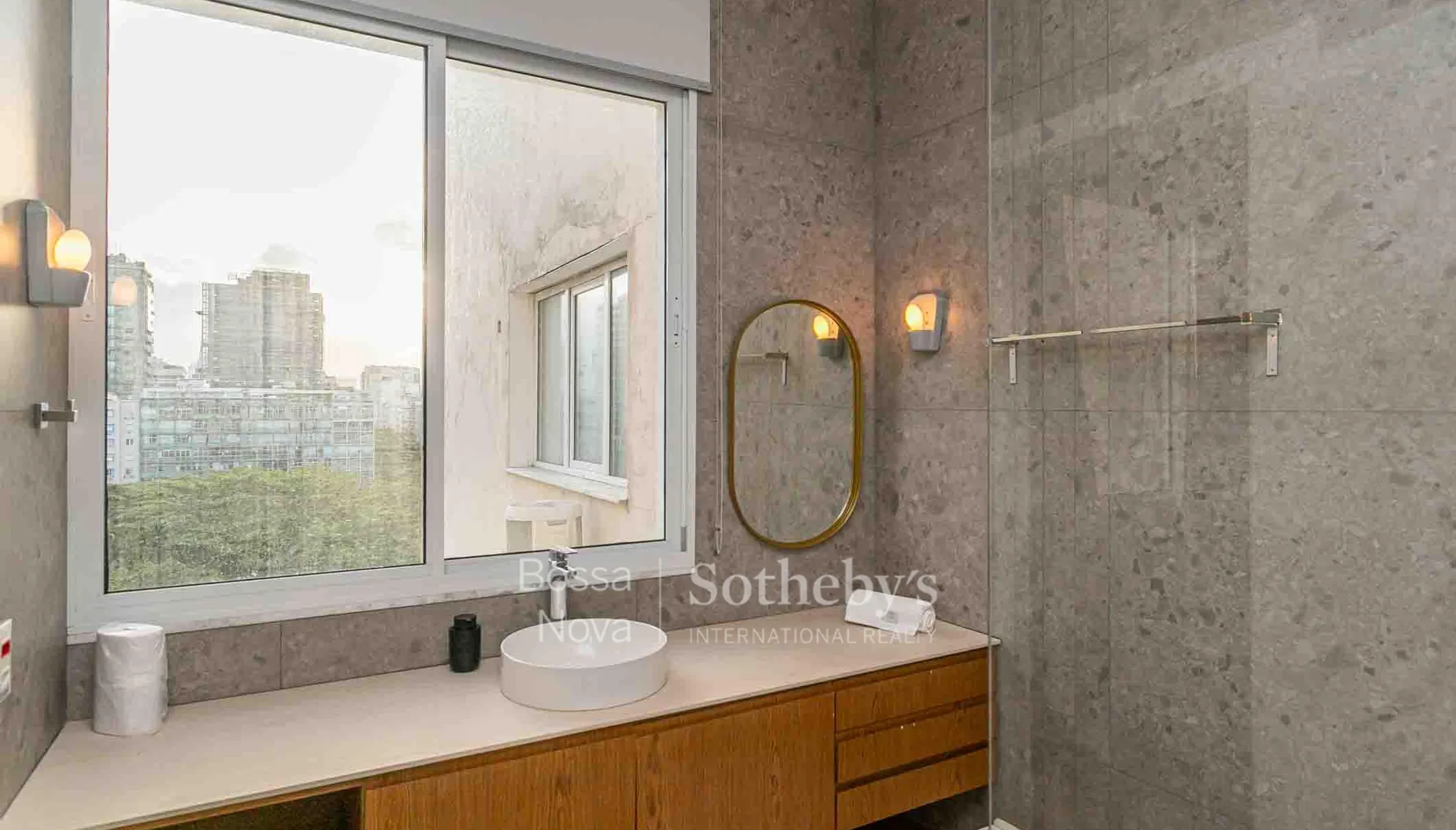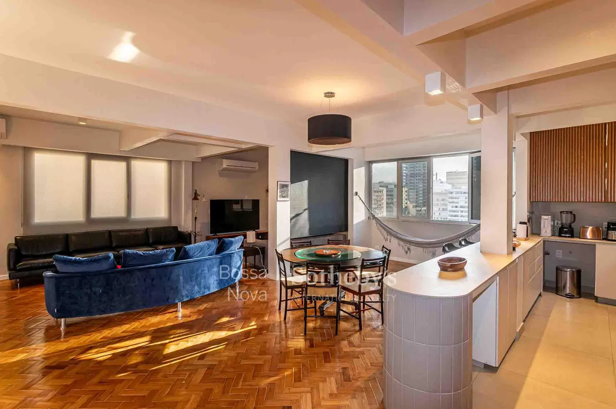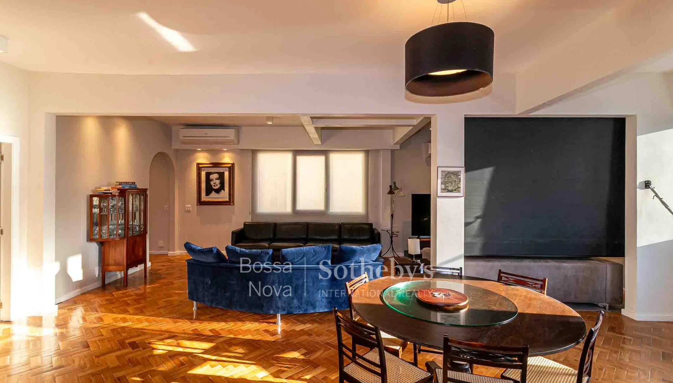 Apartamento reformado em andar alto, localizado de frente para uma praça e próximo a estações de metrô, comércio e restaurantes. Com vista privilegiada para o mar e para o Morro Dois Irmãos, seus ambientes são bem distribuídos em aproximadamente 196 metros quadrados. A área social contempla uma sala com três ambientes e piso em taco de madeira, integrada à cozinha em conceito aberto. Conta com lavabo e três suítes, todas com armários embutidos e ar-condicionado tipo split. A iluminação natural e a ventilação cruzada conferem conforto ao espaço. O edifício dispõe de portaria com funcionamento ininterrupto.