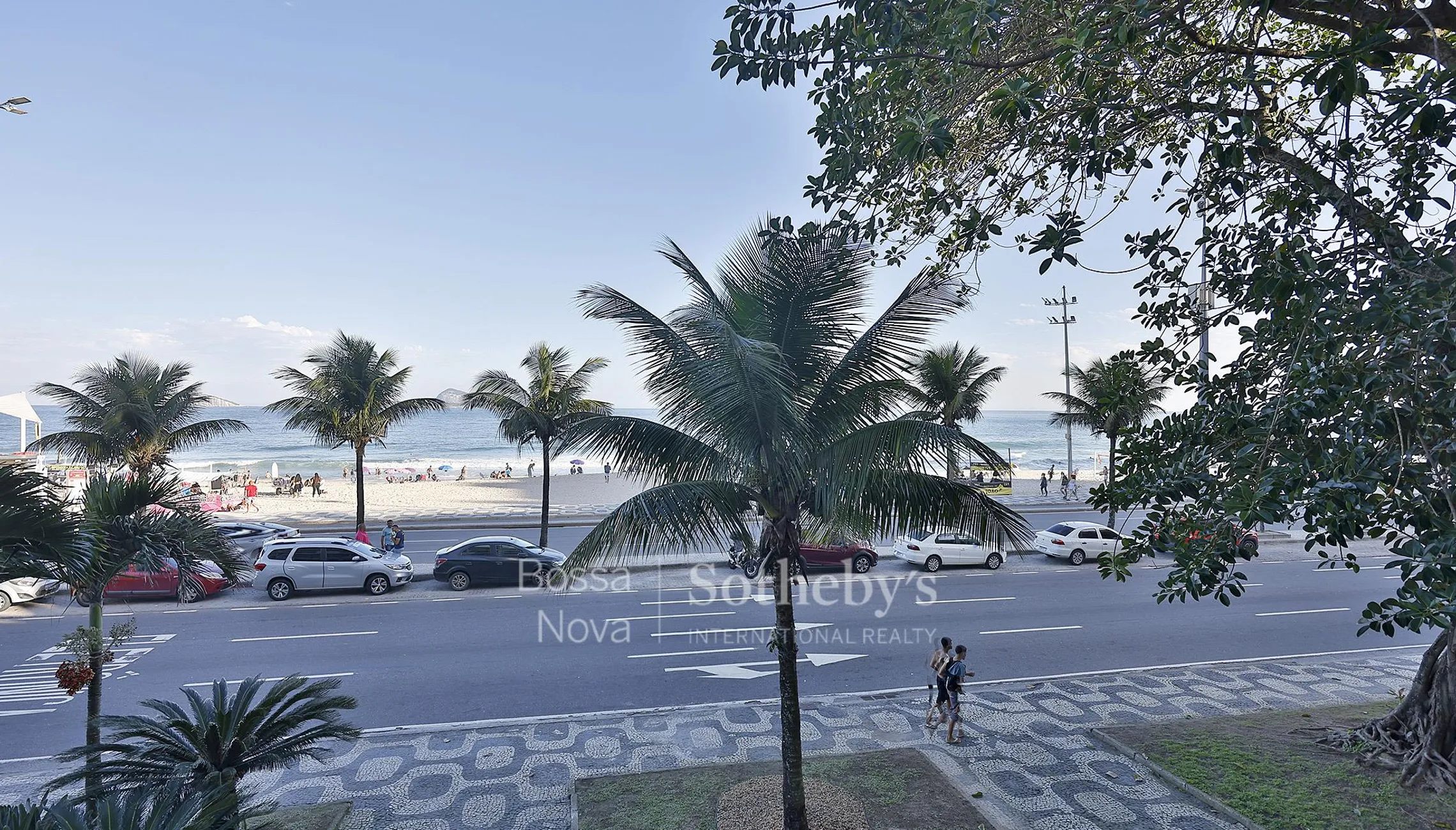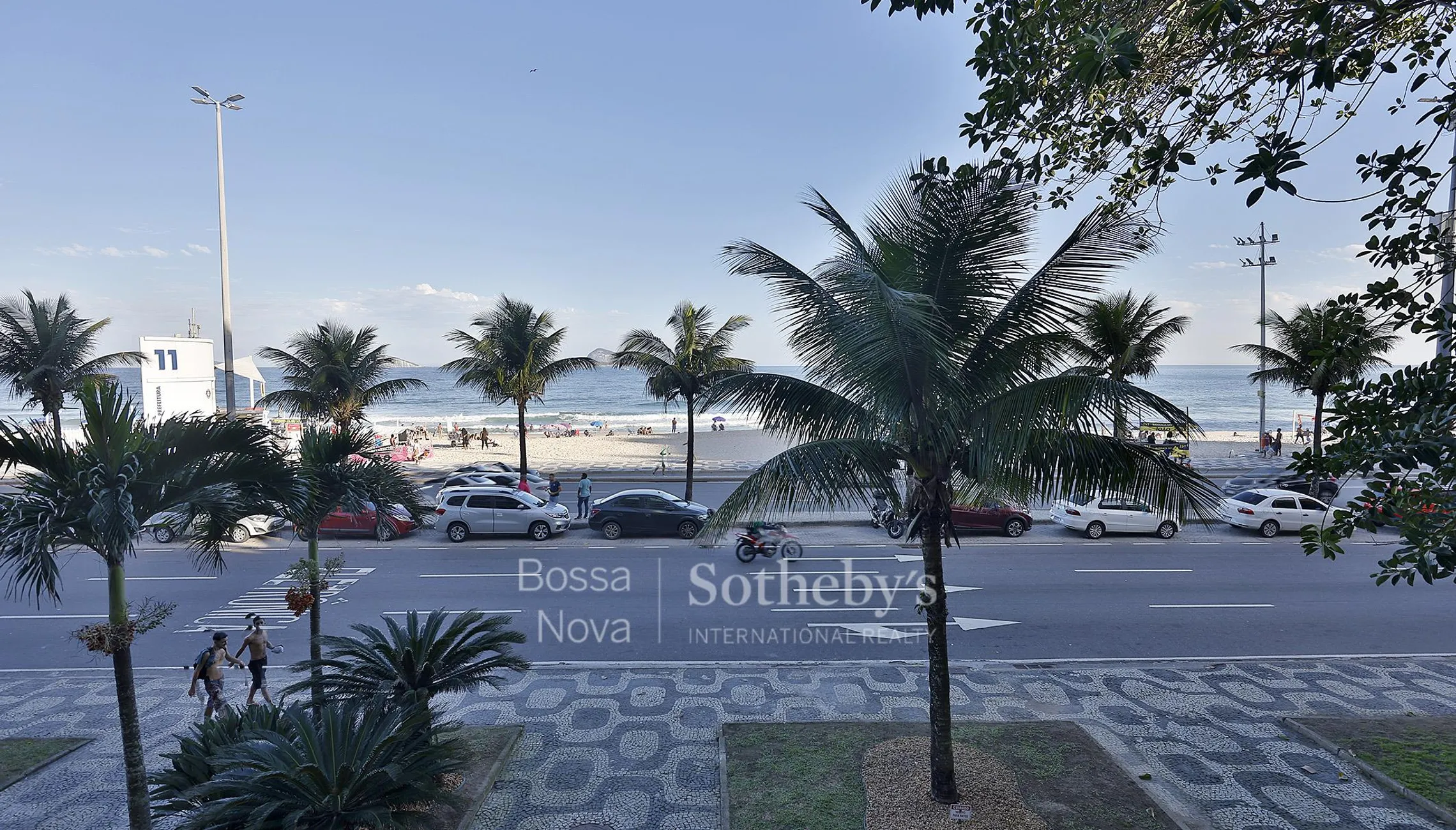 Apartamento de frente para o mar no Leblon com área externa e planta circular distribuída em sala de estar com dois ambientes, sala de jantar, lavabo, cozinha espaçosa, copa, área de serviço completa e dependência de funcionários. A área íntima conta com quatro quartos, sendo uma suíte com vista frontal para o mar e antessala; os outros três dormitórios são atendidos por dois banheiros.