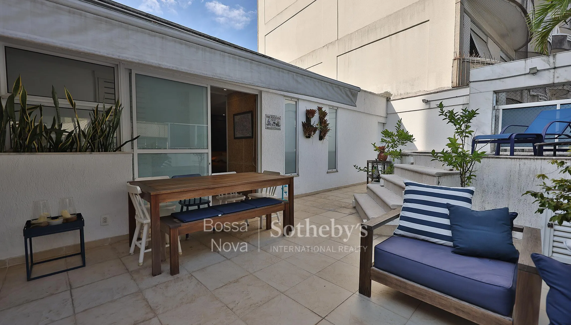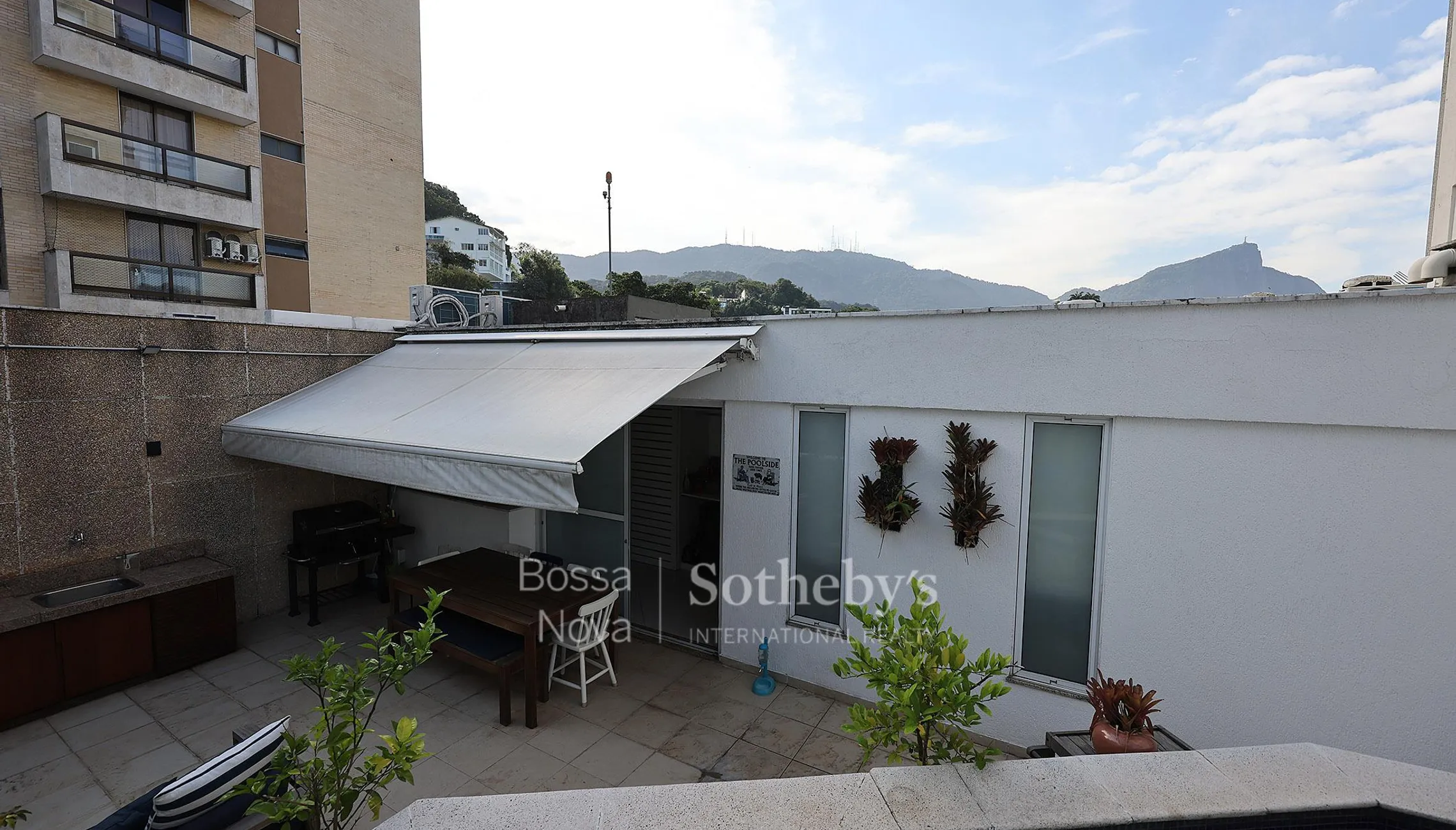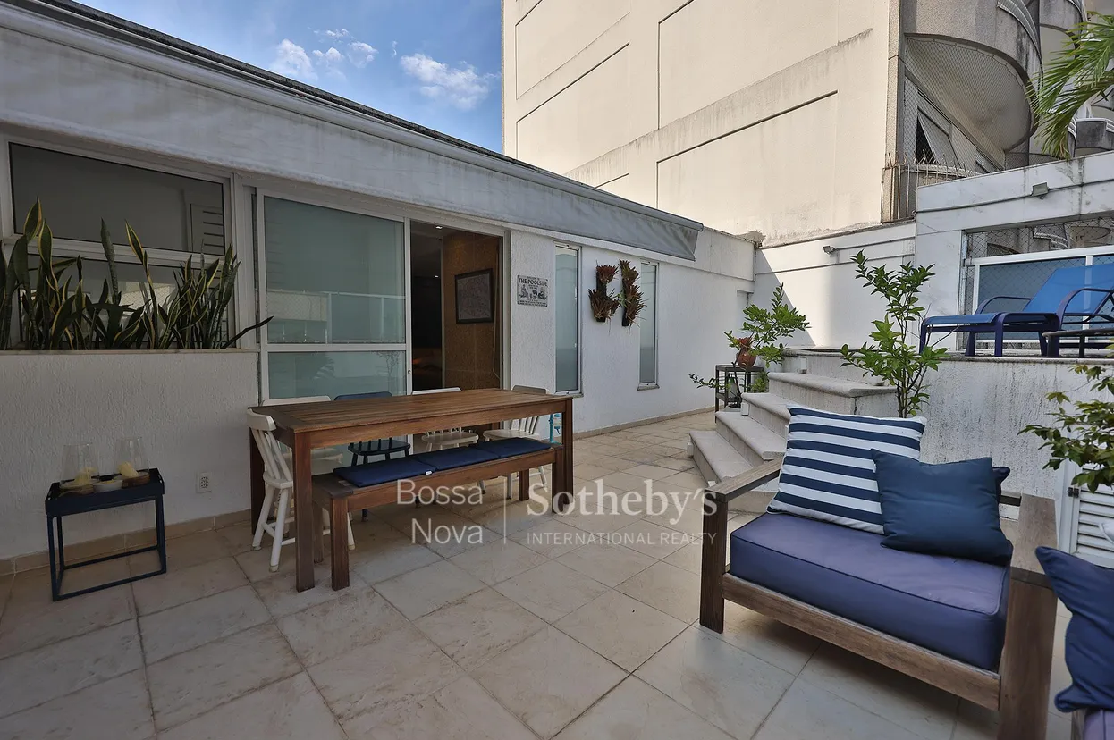 Cobertura duplex localizada na parte baixa do Alto Leblon. O primeiro pavimento é composto de sala em dois ambientes com ar-condicionado split, varanda, dois quartos com armários, sendo um deles a dependência de funcionários com banheiro que foi revertida em dormitório, banheiro social, cozinha planejada e área de serviço. O acesso ao segundo pavimento é feito por escada linear, levando ao hall com armário e à suíte master com closet. A área externa conta com piscina, chuveirão, cozinha de apoio e lavabo. Dispõe de três vagas de garagem. O prédio é novo e tem ótima apresentação, oferecendo box para guardados na garagem. Imóvel reformado por arquiteto.