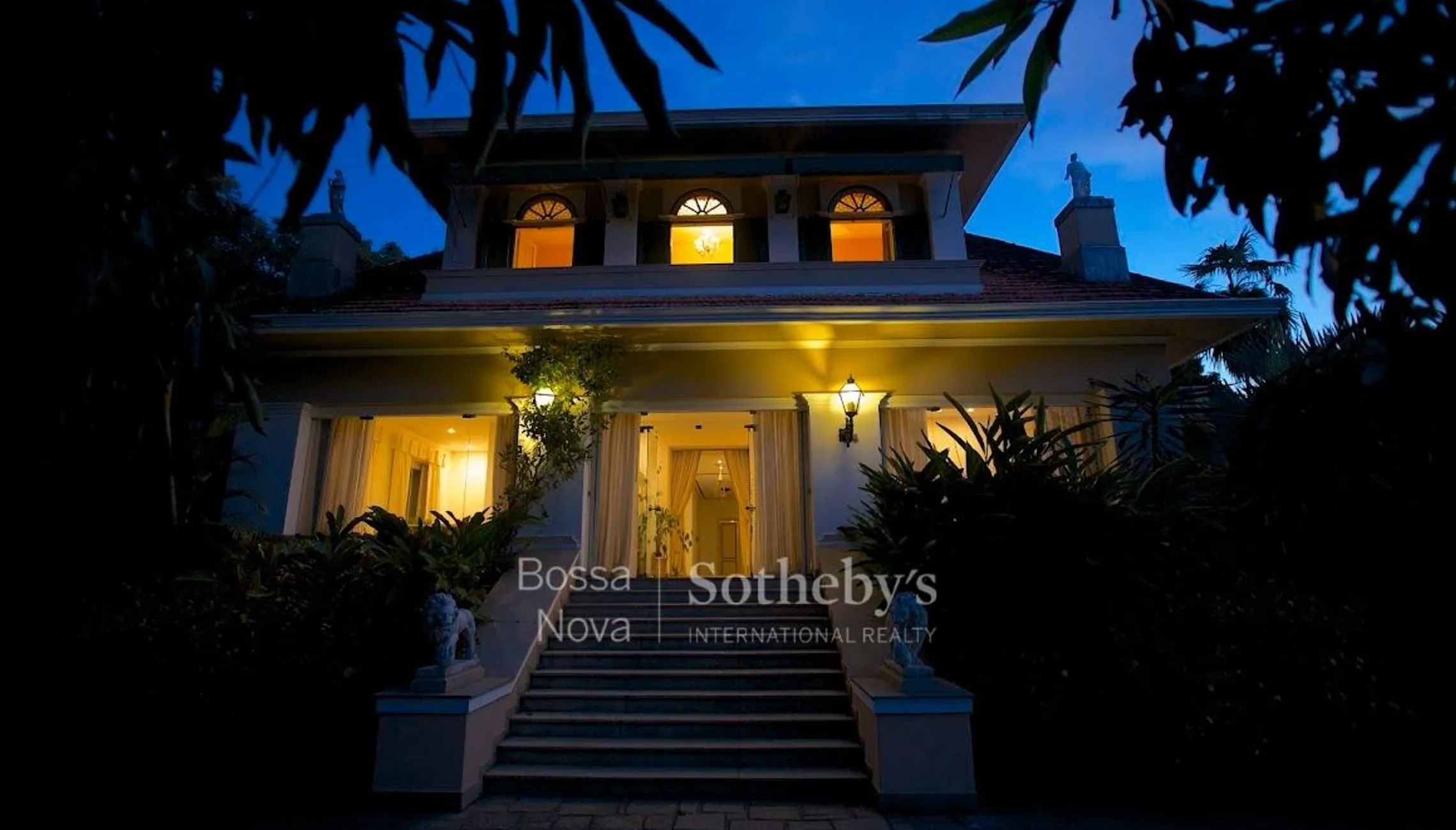 Esta residência apresenta salão principal integrado à varanda voltada para o jardim, além de jardim de inverno, espaço destinado a entretenimento e biblioteca. A área externa conta com piscina em estilo francês cercada por paisagismo, compondo a área de convivência. A área íntima oferece duas suítes principais com varanda, dois dormitórios conectados que compartilham varanda e banheiro, além de duas suítes adicionais em construção independente destinada a hóspedes. A propriedade dispõe ainda de quadra que pode ser utilizada para futebol society ou tênis, arquibancada e sistema de segurança com câmeras.