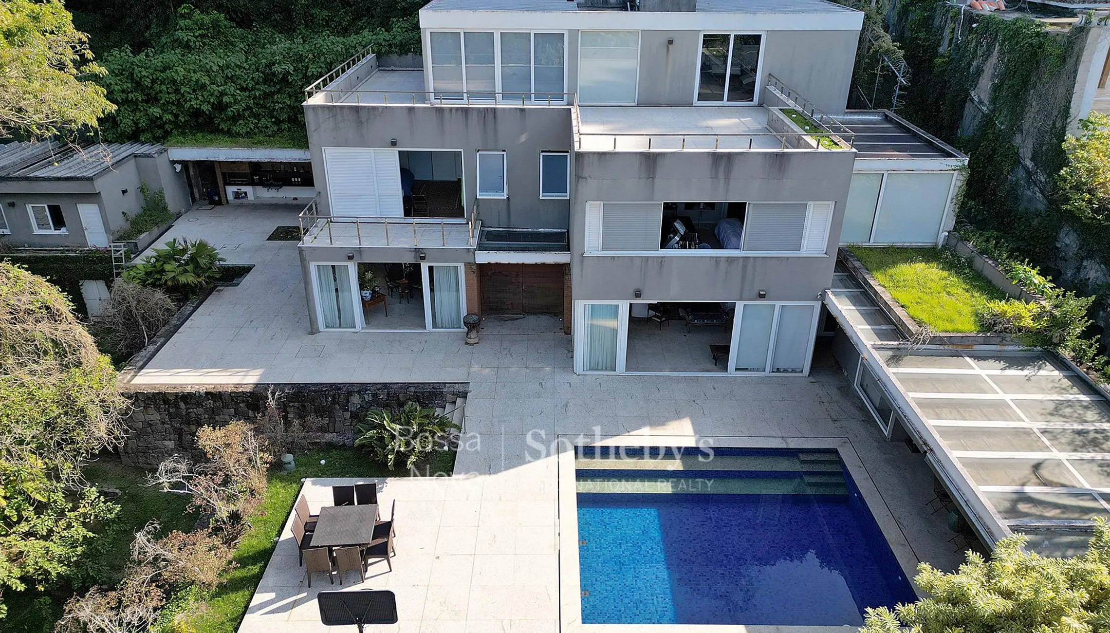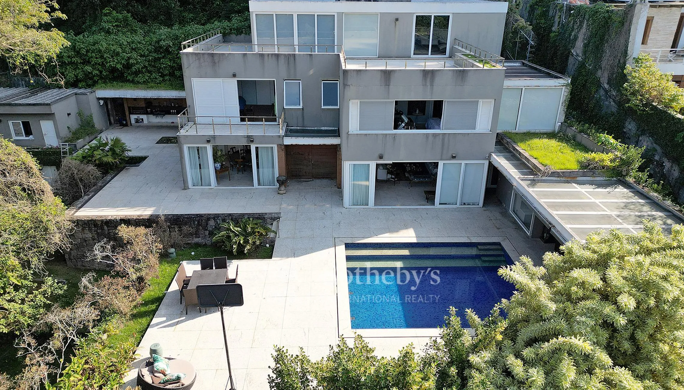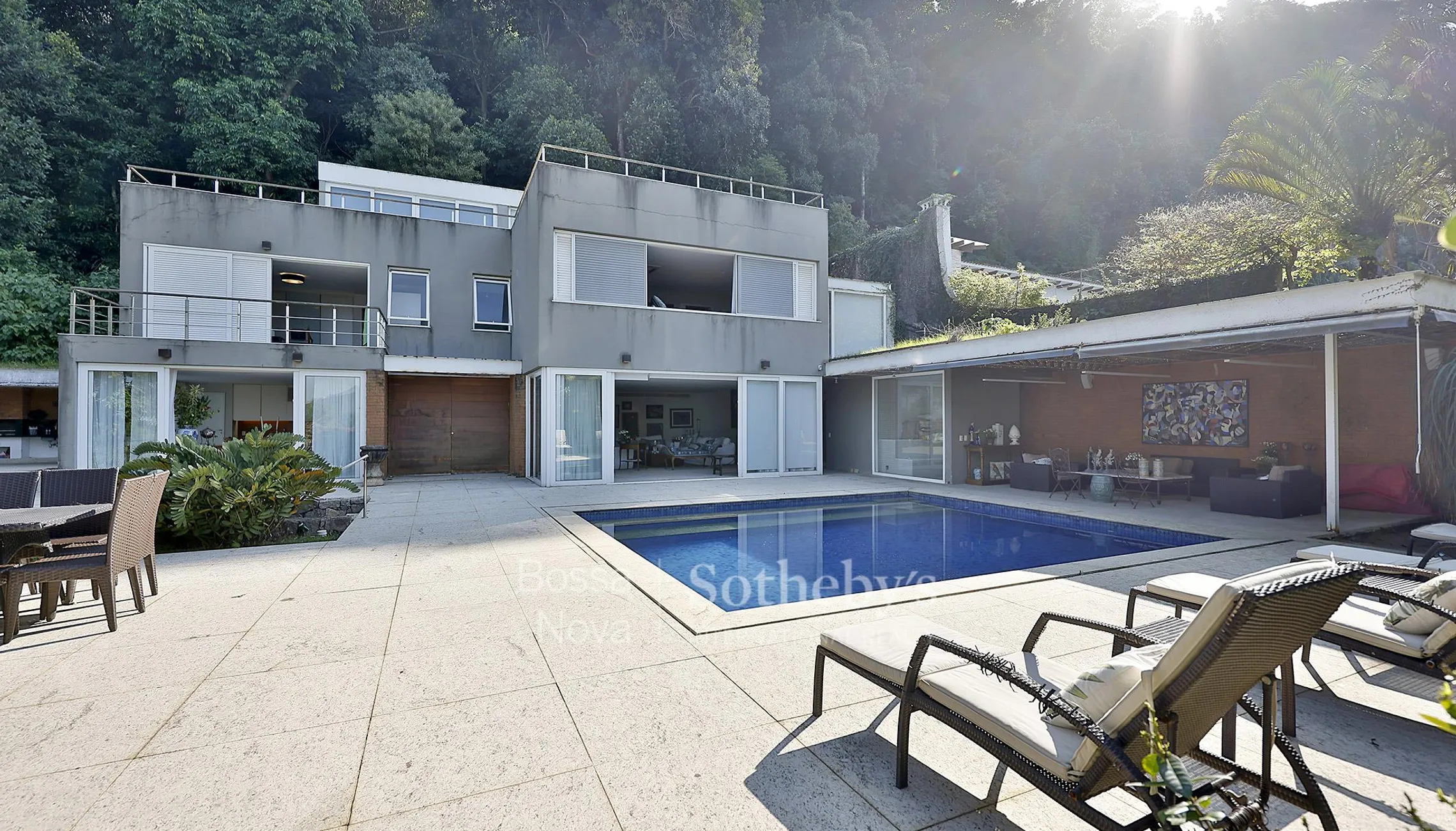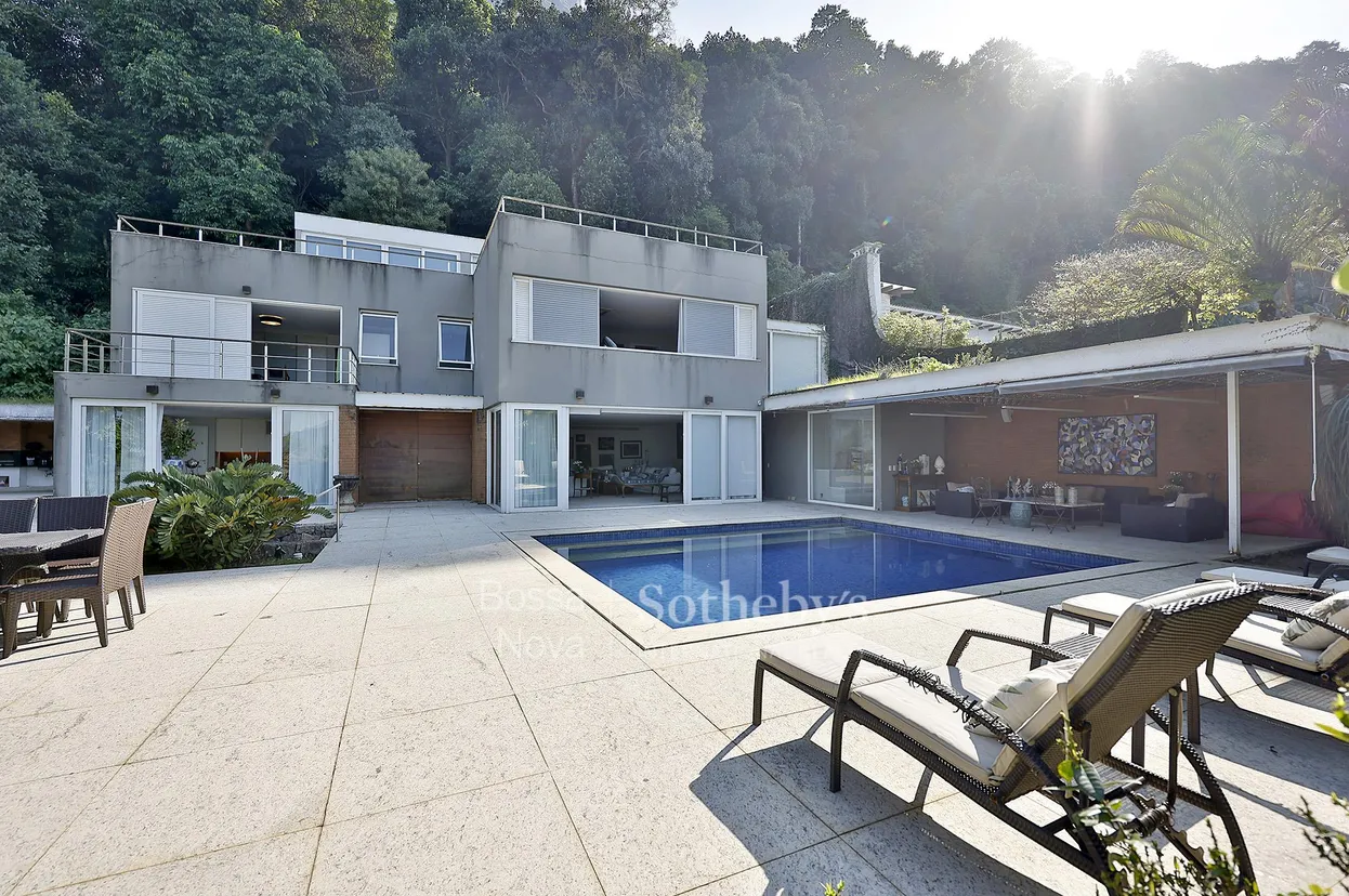 Esta propriedade fica em um condomínio de alto padrão com segurança 24 horas, aos pés da Pedra da Gávea e com vista livre para São Conrado, o mar e as ilhas. A área externa é um dos grandes destaques, com piscina revestida em piso de granito, gazebo com sofás, sauna a vapor, churrasqueira, banheiro de apoio e gramado. No primeiro piso, encontram-se hall de entrada, sala de estar, bar, sala de jantar, lavabo, elevador e cozinha com copa. No segundo piso, o piso em peroba traz elegância, e há roupeiro no corredor, suíte master com vista para o mar, escritório e walk-in closet. O andar conta ainda com home cinema, suíte frontal com armários e uma terceira suíte lateral. No terceiro piso, um amplo home theater com sala de jogos, banheiro e um terraço com vista panorâmica completam a área social. A área de serviço está localizada em uma estrutura externa e independente, com lavanderia e dependência de funcionários, incluindo sala e cozinha próprias.