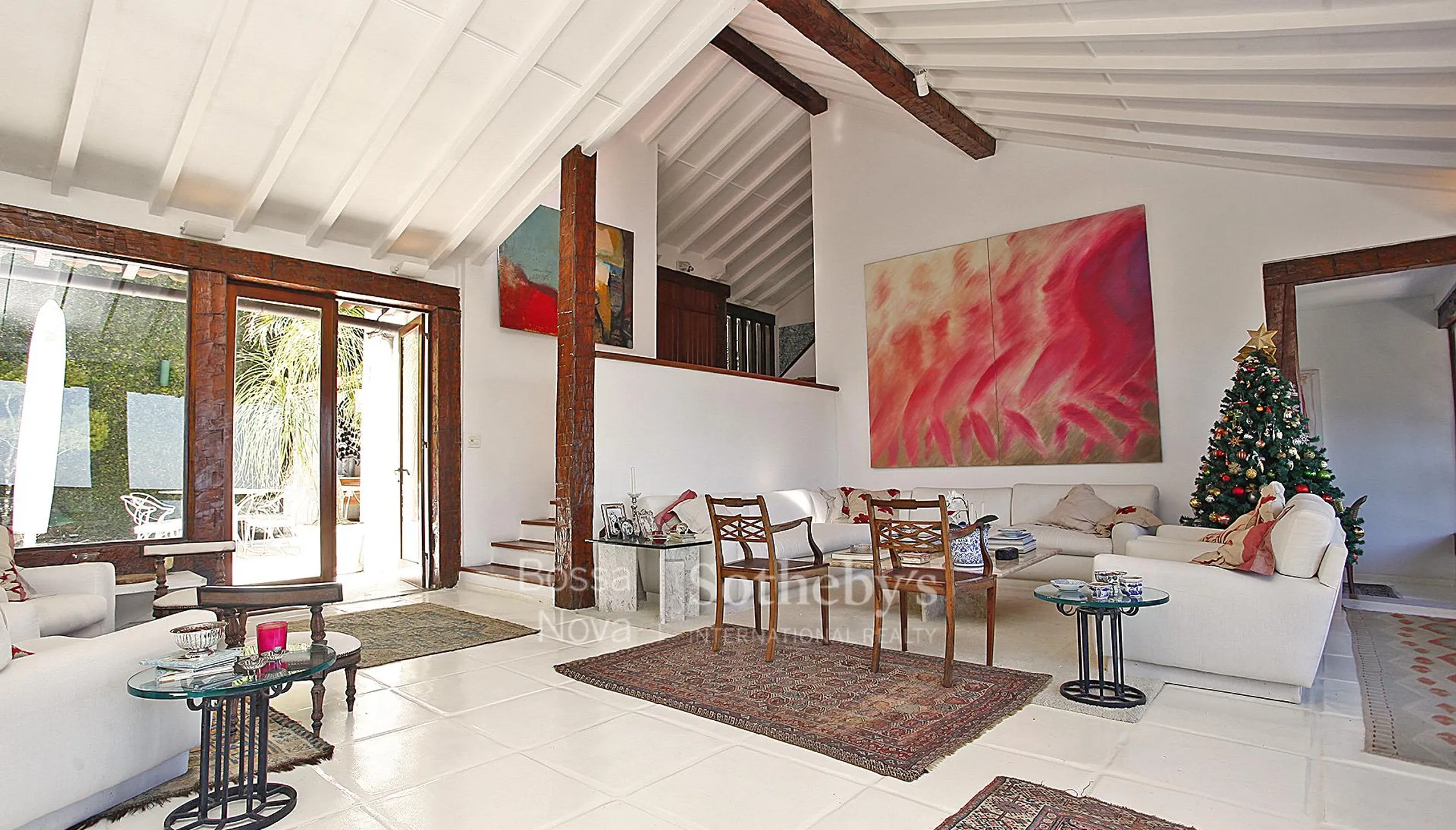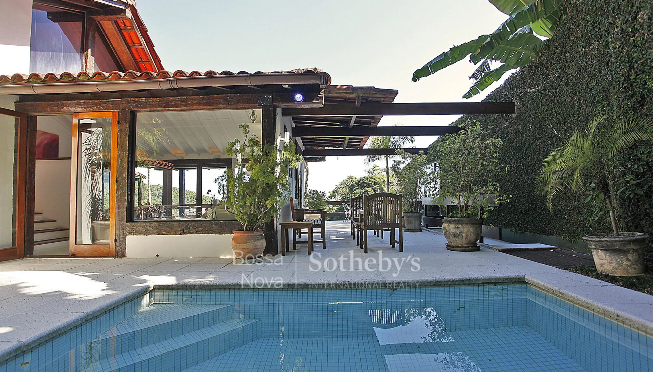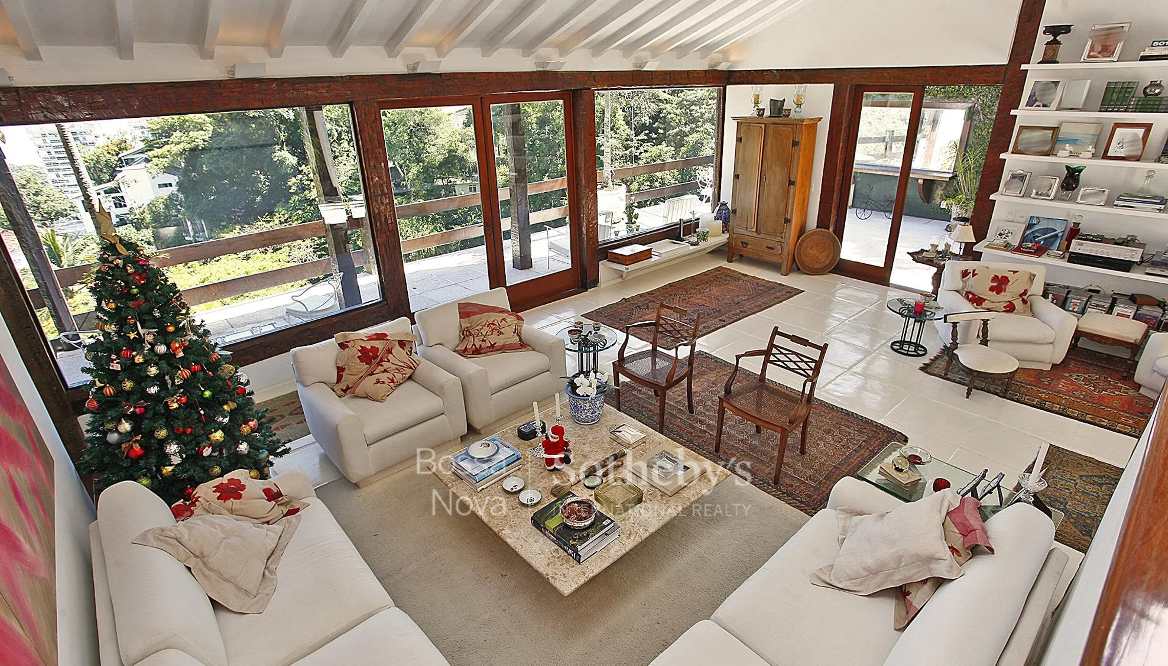 Casa distribuída em três pavimentos, com planta ampla e bem organizada. A área social apresenta sala de estar configurada em três ambientes, sala de jantar, home theater, escritório, lavabo e varanda com deck. No subsolo, há adega climatizada e acesso à área externa, que conta com jardim, piscina e um riacho natural atravessando o terreno. Um dos anexos abriga sala de jogos, sala de TV, churrasqueira, cozinha de apoio, sauna a vapor e banheiros, enquanto outro anexo dispõe de sala de ginástica e escritório. A área íntima é composta por diferentes configurações de dormitórios, incluindo suíte para hóspedes com closet e copa de apoio, duas suítes com closet atendidas por sala íntima, uma suíte com banheiro compartilhado e a suíte principal com antessala, dois banheiros e dois closets. A casa conta ainda com copa-cozinha, lavanderia e dependência de funcionários.