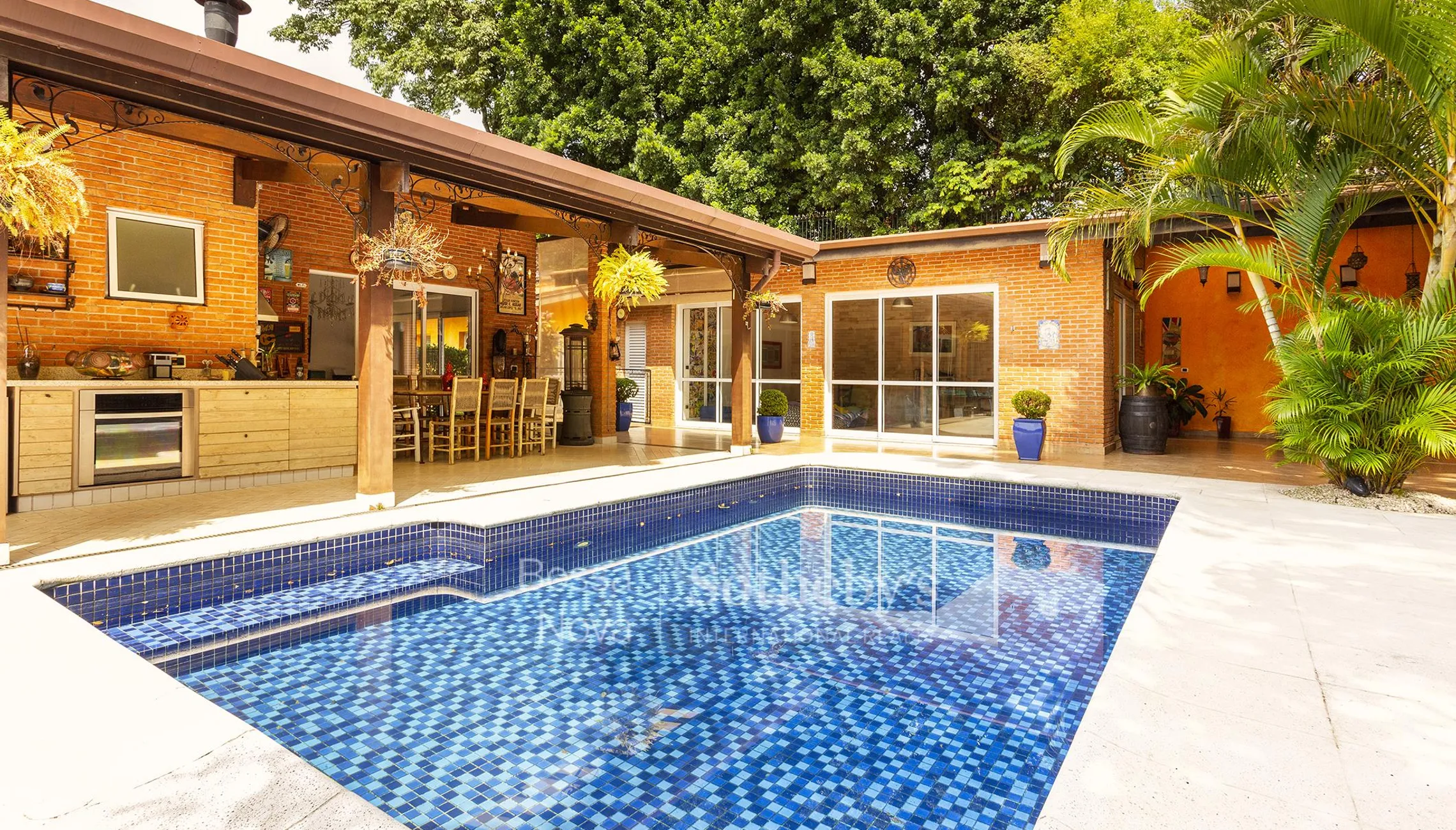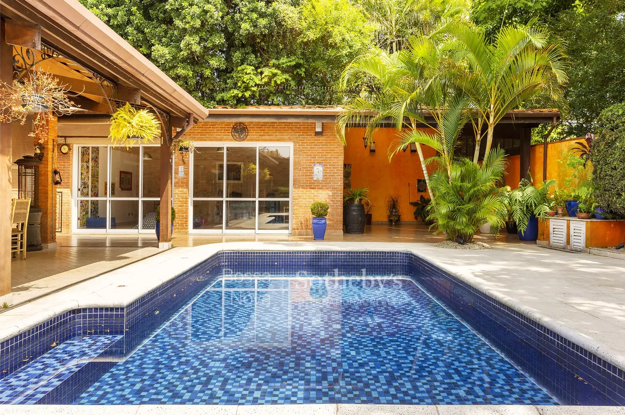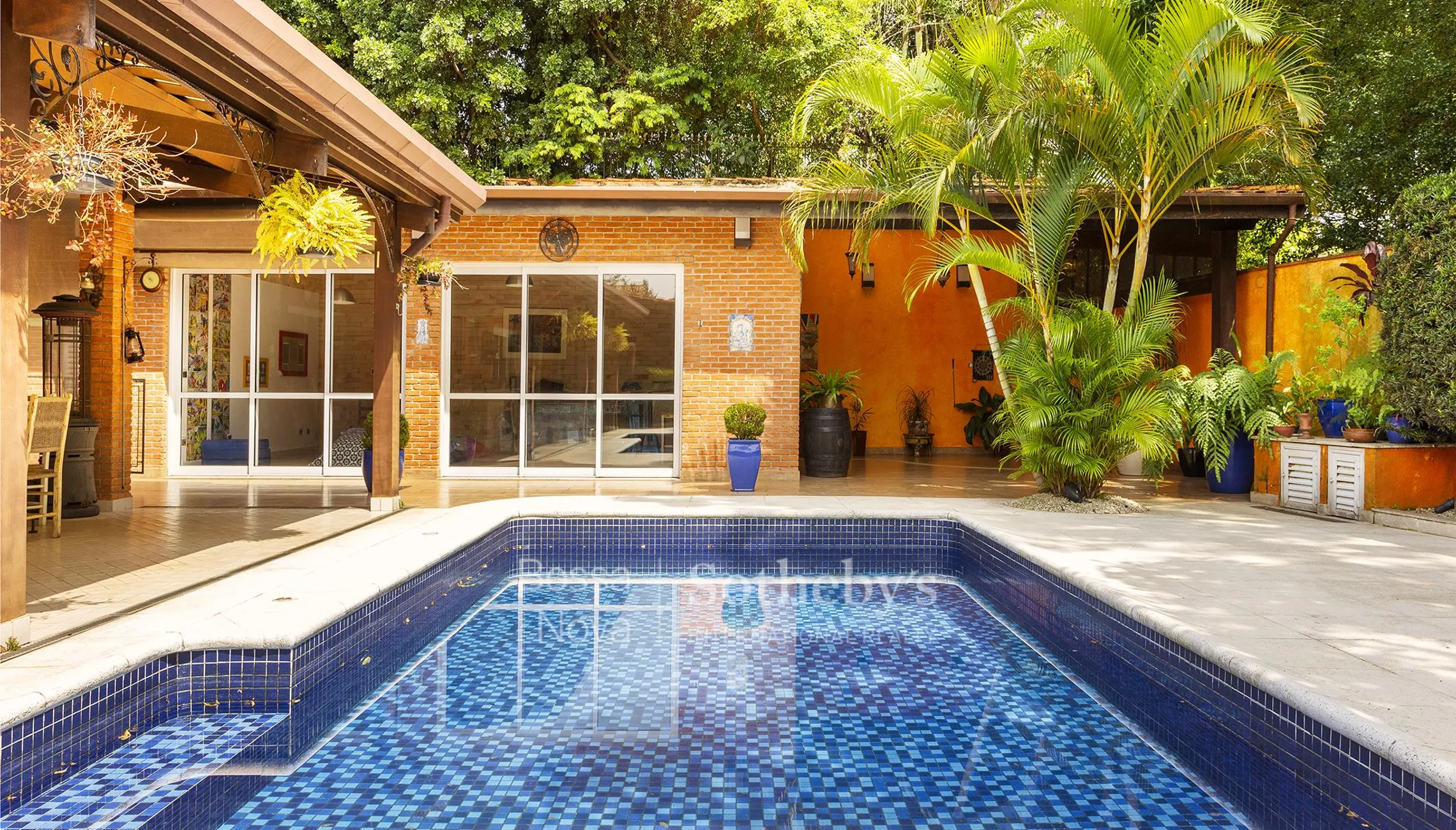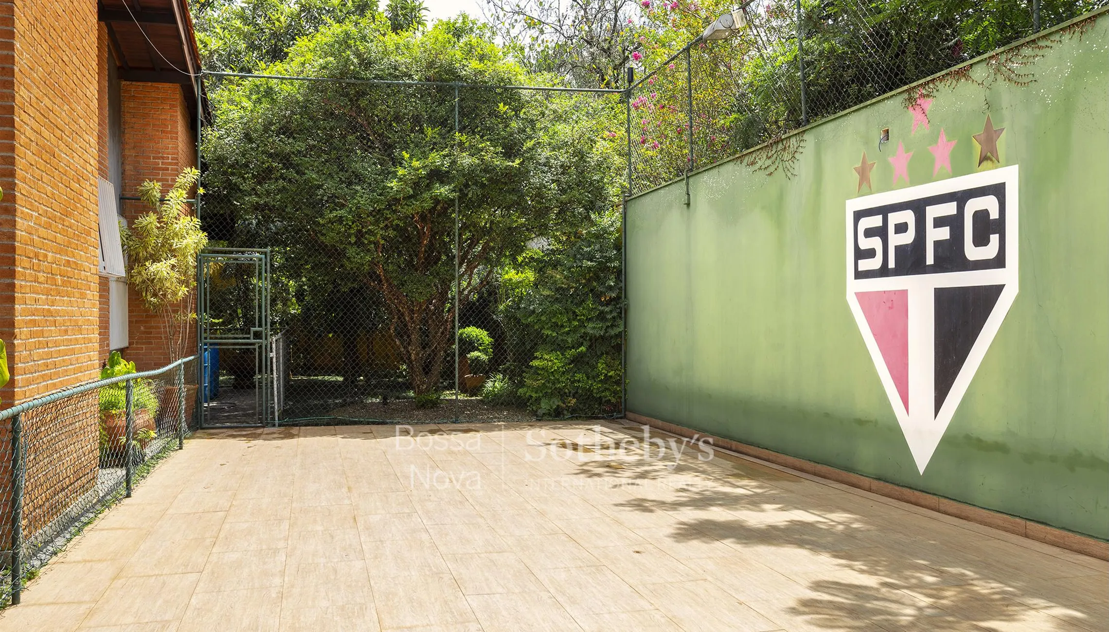 Casa térrea com muito charme, jardim, luminosidade, espaço interno e externo, com excelente localização. São quatro quartos espaçosos todos com armários, sendo duas suítes com closet e dois quartos compartilham um banheiro. Antes de chegar aos quartos há um escritório e um roupeiro e todos os ambientes são na ala oposta ao lado da piscina, dando mais privacidade. Sala de jantar ampla com muitas portas de vidro que dão vista para a piscina. Sala de estar integrada à sala de jantar. Sala de TV próxima aos quartos. Ao lado da piscina está a área gourmet, um salão de festas, sauna e uma sala externa à casa que pode ser usada como sala de massagem ou para fazer um home office. O jardim é repleto de árvores frutíferas e várias hortas e ainda conta com uma quadra poliesportiva. Muito aconchego, boa energia e espaço.