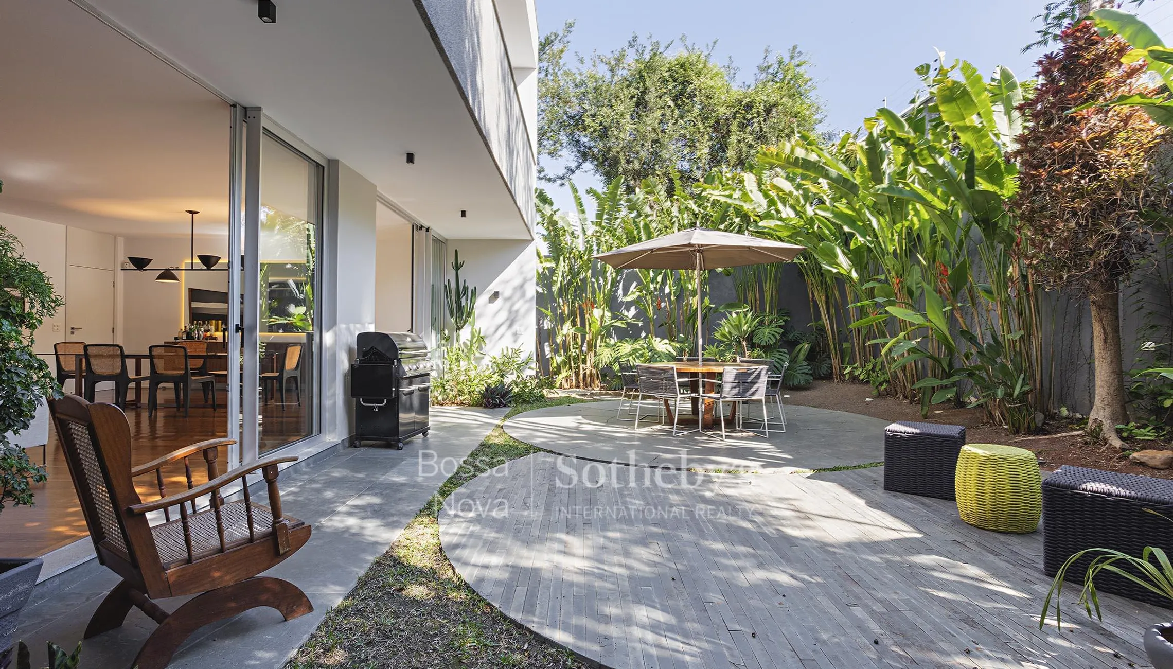 Esta residência foi completamente renovada, valorizando os ambientes amplos e bem iluminados. O piso térreo conta com living integrado para três ambientes, incluindo estar, jantar e TV, voltado para um terraço com jardim. A cozinha, com copa e marcenaria planejada, se destaca pela funcionalidade e integração com as áreas sociais. Há ainda dependências para funcionários e quatro vagas de garagem. No pavimento superior, estão quatro suítes, sendo a principal com terraço privativo. A casa possui sistema de energia fotovoltaica, ar-condicionado em todos os cômodos e acabamentos de qualidade, que reforçam o conforto e a praticidade do projeto.