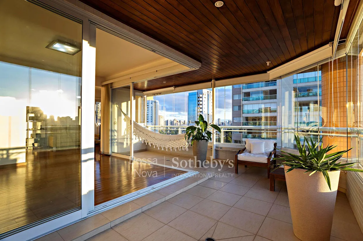 Apartamento localizado na área nobre do Brooklin, próximo de todas as facilidades do bairro, tais como restaurantes, padarias e mercados. Na área social, dispõe de living para dois ambientes, sala de jantar, varanda ensolarada e agradável, lavabo e sala de TV com vista livre. Copa e cozinha planejadas. Na área íntima, conta com quatro dormitórios, sendo três suítes com armários e um escritório. Possui quatro vagas de garagem. Lazer com piscina, academia, playground, churrasqueira e quadra.