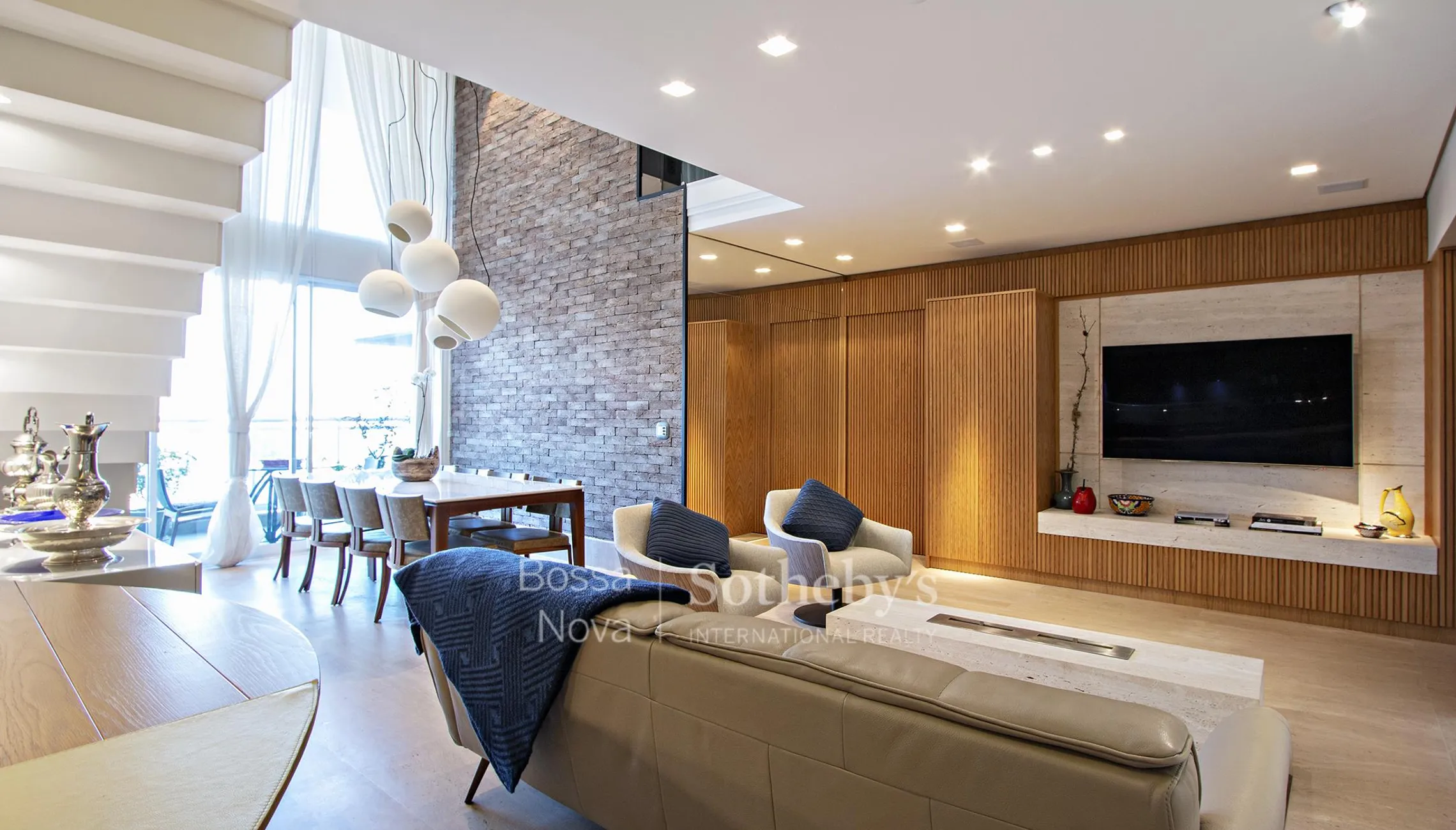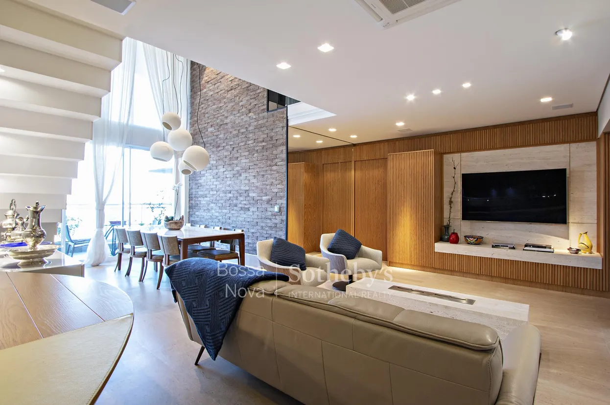 Apartamento em andar alto com projeto assinado por arquiteto, automatizado e com integração entre os ambientes sociais. O living e a sacada possuem pé-direito duplo, som ambiente e terraço gourmet com lareira a gás, com grandes esquadrias do piso ao teto que favorecem a ventilação cruzada e a entrada de luz natural. A cozinha é integrada à sala e possui porta blindada para o acesso de serviço, despensa, banheiro de funcionário e lavanderia equipada. O piso da área social é em mármore travertino romano, enquanto o piso da área íntima e do mezanino é em madeira maciça Cumaru. No mezanino de aproximadamente 25 metros quadrados, com guarda-corpo em vidro, há um espaço multiuso destinado a home theater e home office. A planta originalmente contempla quatro suítes, atualmente configuradas como três, com fácil reversão. A suíte principal dispõe de closets e banheiros senhor e senhora com banheira dupla. Todo o apartamento conta com ar-condicionado tipo inverter Fujitsu e as suítes possuem janelas antirruído. O edifício recuado, com jardim, oferece estrutura de lazer com piscina, academia bem equipada, salão de festas com espaço gourmet, brinquedoteca, spa com sala de descanso, quadra poliesportiva, quadra de squash, guarita blindada e gerador. O térreo elevado inicia-se no mezanino.