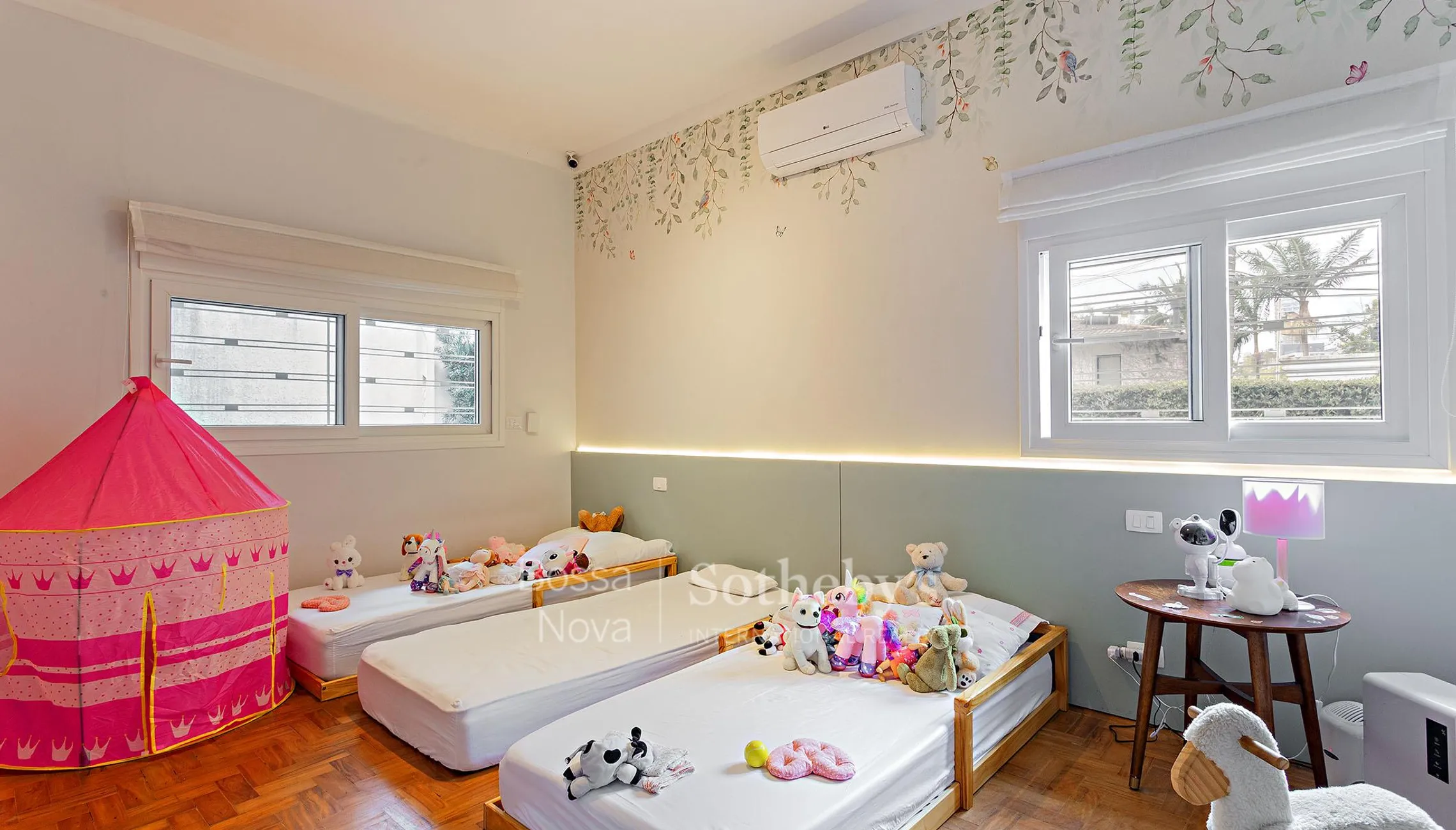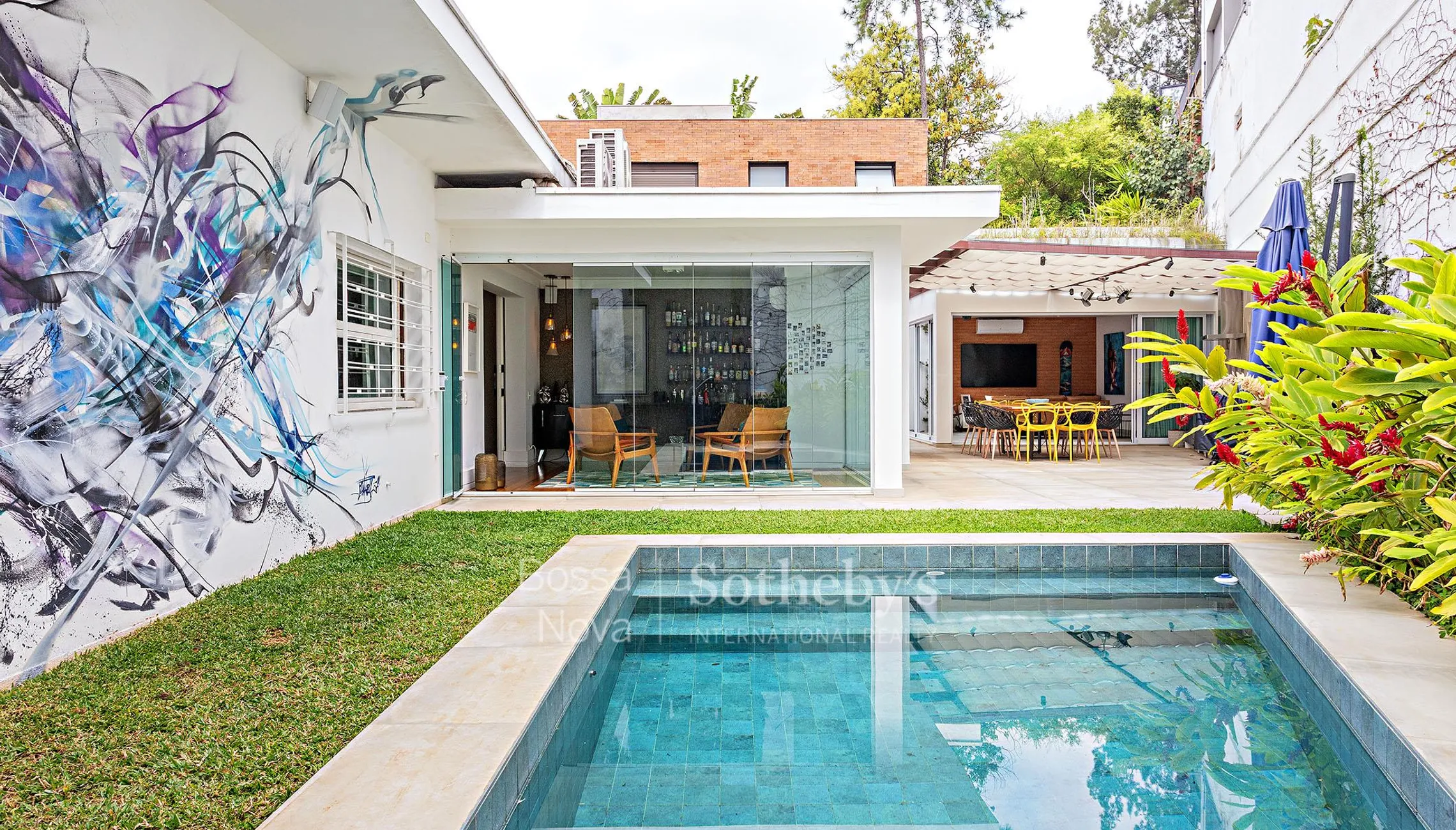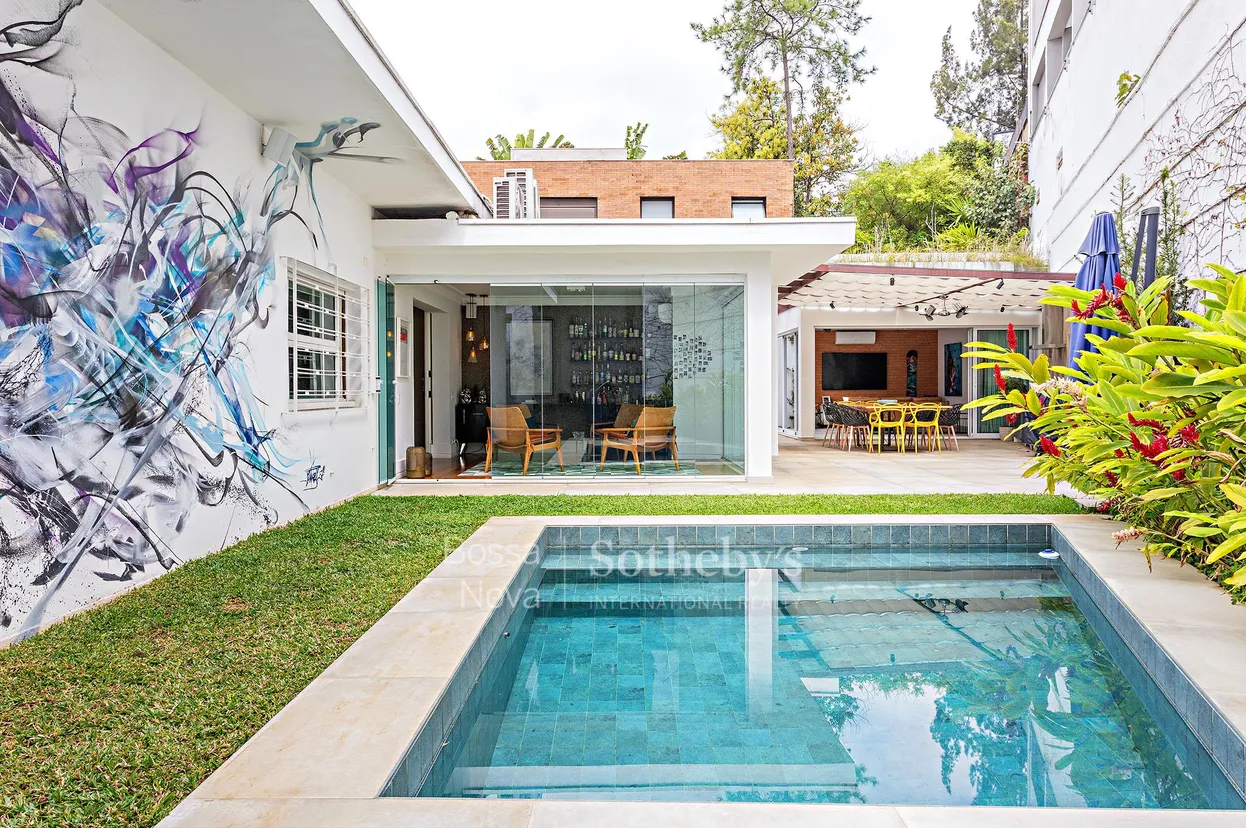 Com projeto e execução assinados por Adolpho Lindenberg, esta residência apresenta elementos clássicos reinterpretados em uma linguagem contemporânea, combinando imponência arquitetônica com funcionalidade. A casa se desenvolve em níveis semi-térreos e conta com hall de entrada marcante, com pé-direito duplo e porta em madeira maciça, que conduz a um living amplo com cinco ambientes integrados. Um terraço percorre toda a fachada posterior, conectando os espaços sociais à piscina com sauna e ao jardim de inverno, criando uma atmosfera de convivência ao ar livre. A área íntima dispõe de duas suítes, sala de TV e um ambiente multiuso atualmente utilizado como brinquedoteca. A cozinha é espaçosa e oferece fácil conexão com a área de serviço, que inclui lavanderia e dois dormitórios de apoio com banheiro. A propriedade se destaca pela assinatura de um dos nomes mais tradicionais da arquitetura brasileira e oferece uma configuração versátil, ideal para famílias que valorizam espaço, conforto e elegância atemporal.