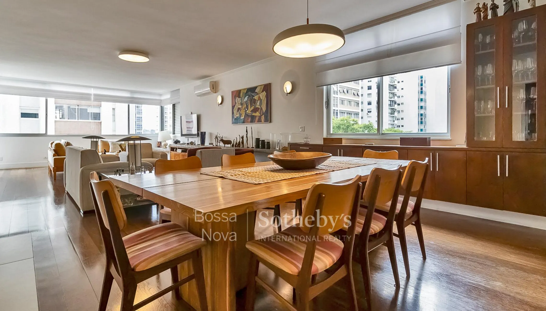 Em edifício assinado por David Libeskind, este apartamento mobiliado passou por reforma conduzida pela arquiteta Patricia Diana e apresenta planta ampla e bem distribuída. Situado em terreno de oitocentos e quarenta e seis metros quadrados, o prédio abriga unidades com duzentos e setenta metros quadrados de área útil. A sala oferece boa luminosidade, vista para áreas arborizadas do entorno e acesso a varanda lateral. A cozinha se integra ao living e conta com despensa. A área íntima reúne duas suítes sendo uma principal, além de um dormitório adicional com banheiro social. O imóvel dispõe de duas vagas de garagem, lavabo, escritório ou home theater, adega e área de serviço com banheiro. Uma opção que alia espaço, localização central e projeto arquitetônico reconhecido.