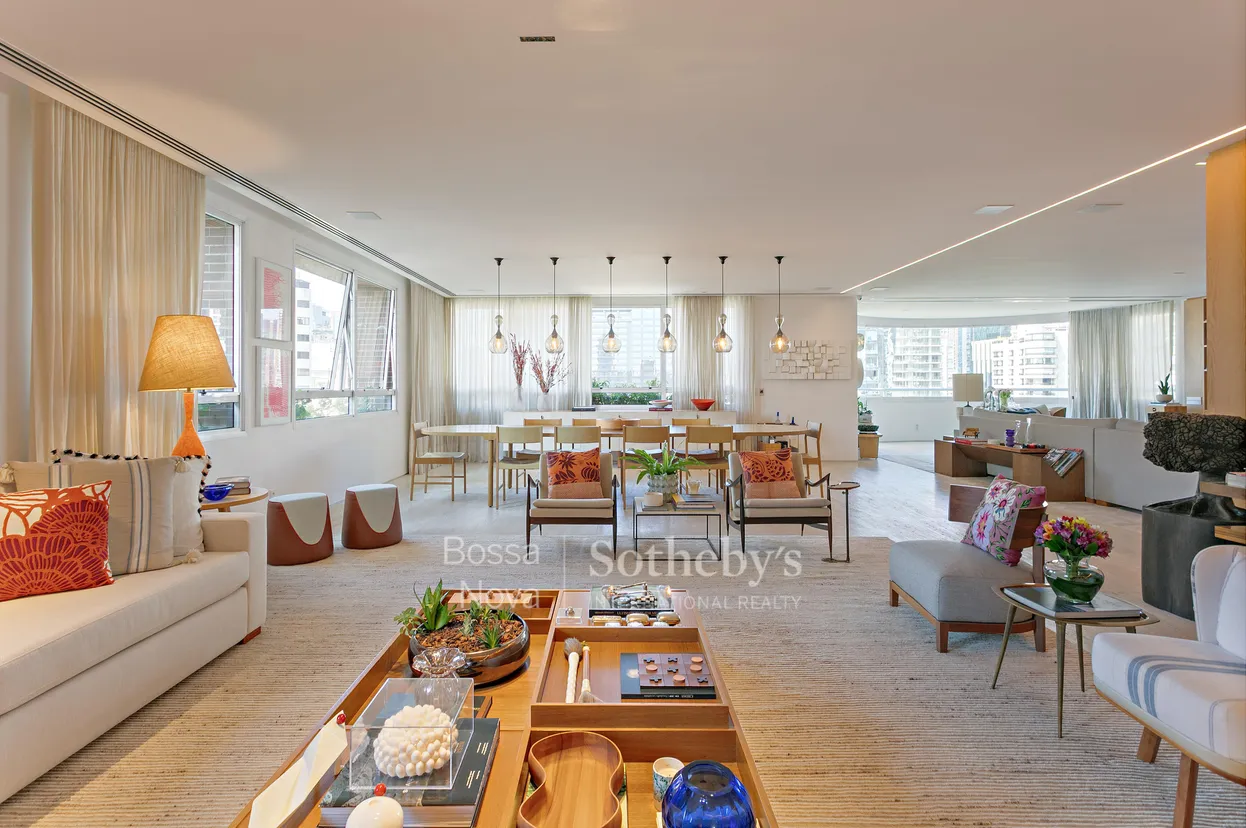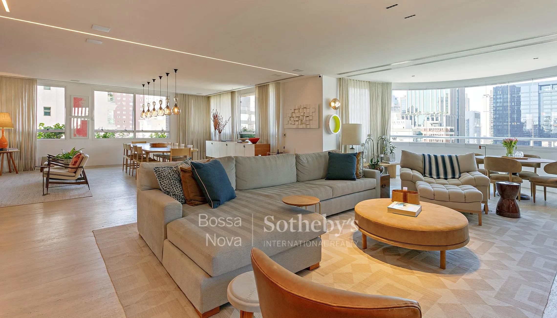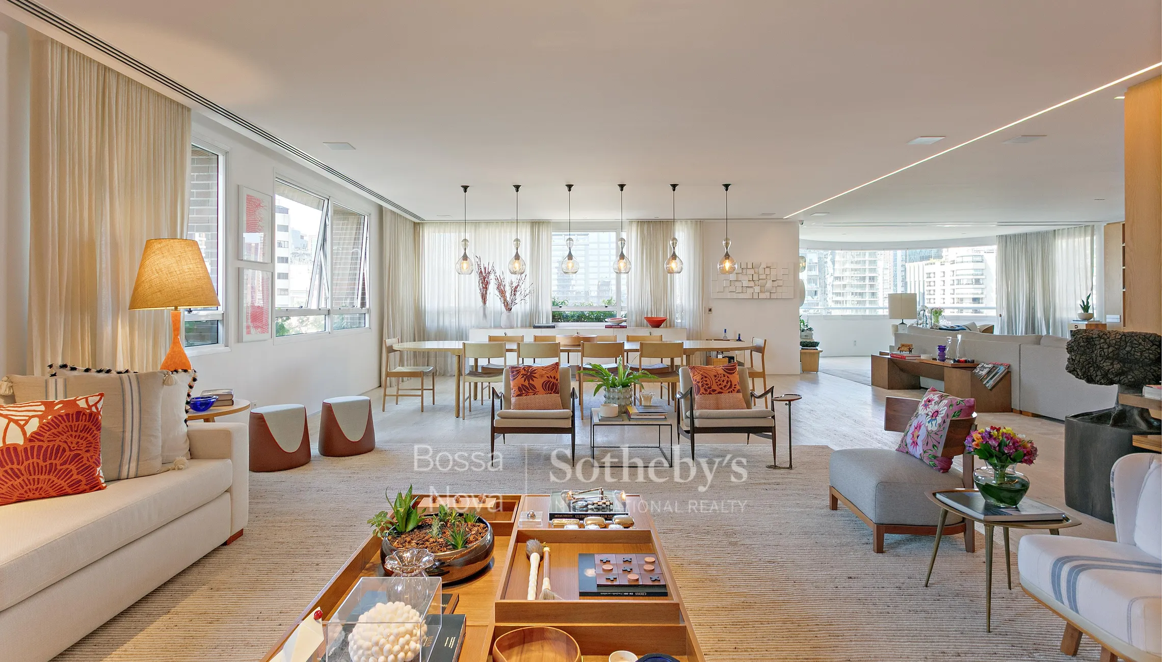O living, amplo e integrado, conecta os ambientes de estar, jantar e home theater com harmonia, formando uma atmosfera fluida e acolhedora. Conta ainda com adega para diversos rótulos e se estende à varanda com vista aberta. Os painéis em madeira da RR, aliados ao piso em mármore paginado, conferem equilíbrio e sofisticação.