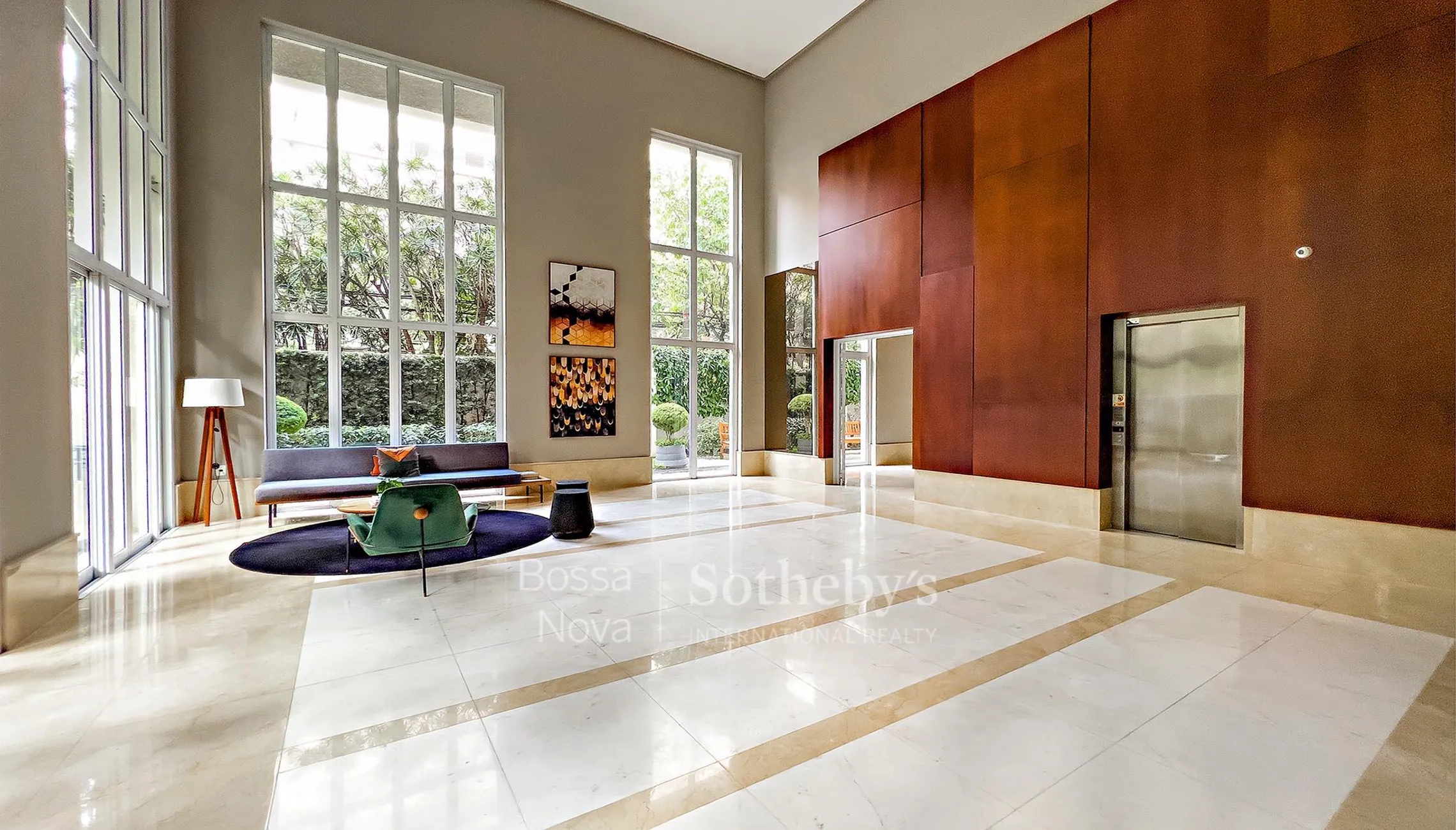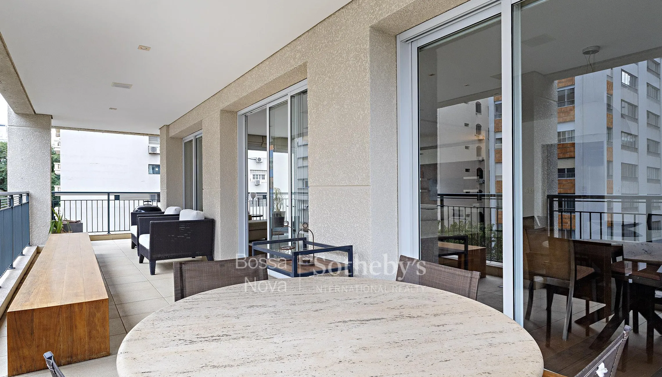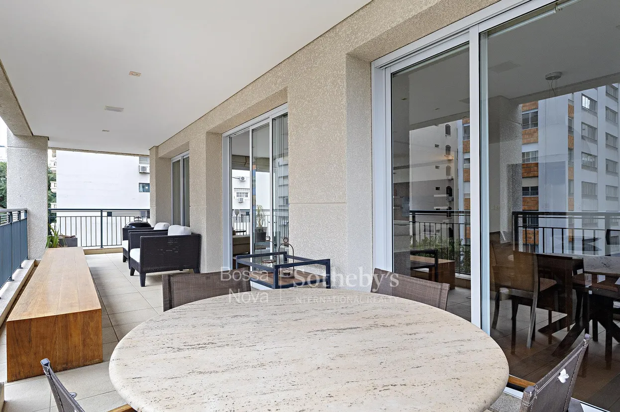 Apartamento localizado em andar alto no Jardim América, com varanda e vista aberta para os Jardins. A área social é composta por living amplo e ensolarado distribuído em três ambientes: sala de estar, sala de jantar e sala de TV. Conta com hall de entrada privativo, com apenas uma unidade por andar. A área íntima dispõe de quatro dormitórios, sendo três suítes. A cozinha com copa é funcional e equipada com armários planejados, conectada à lavanderia espaçosa e dependência de serviço. O imóvel possui acabamentos refinados, com piso em madeira e painéis laqueados.