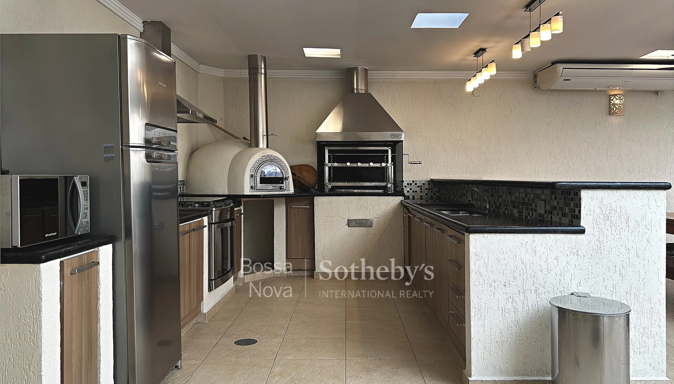 Esta cobertura triplex foi reformada e apresenta distribuição funcional, com living integrado à cozinha aberta e lavabo no pavimento principal. No nível inferior, há dois dormitórios climatizados, sendo a suíte com closet e banheiro com hidromassagem, enquanto o segundo dormitório dispõe de terraço e é atendido por banheiro no corredor. O terceiro piso reúne área social composta por sala, varanda gourmet integrada ao terraço, ambos com ar-condicionado, além de lavanderia no mesmo nível. O imóvel conta com três vagas, e a venda ocorre com porteira fechada. O condomínio oferece piscina, academia, solarium com hidromassagem, sauna, lavanderia, minimercado e serviço de limpeza diário, já incluído no valor condominial.