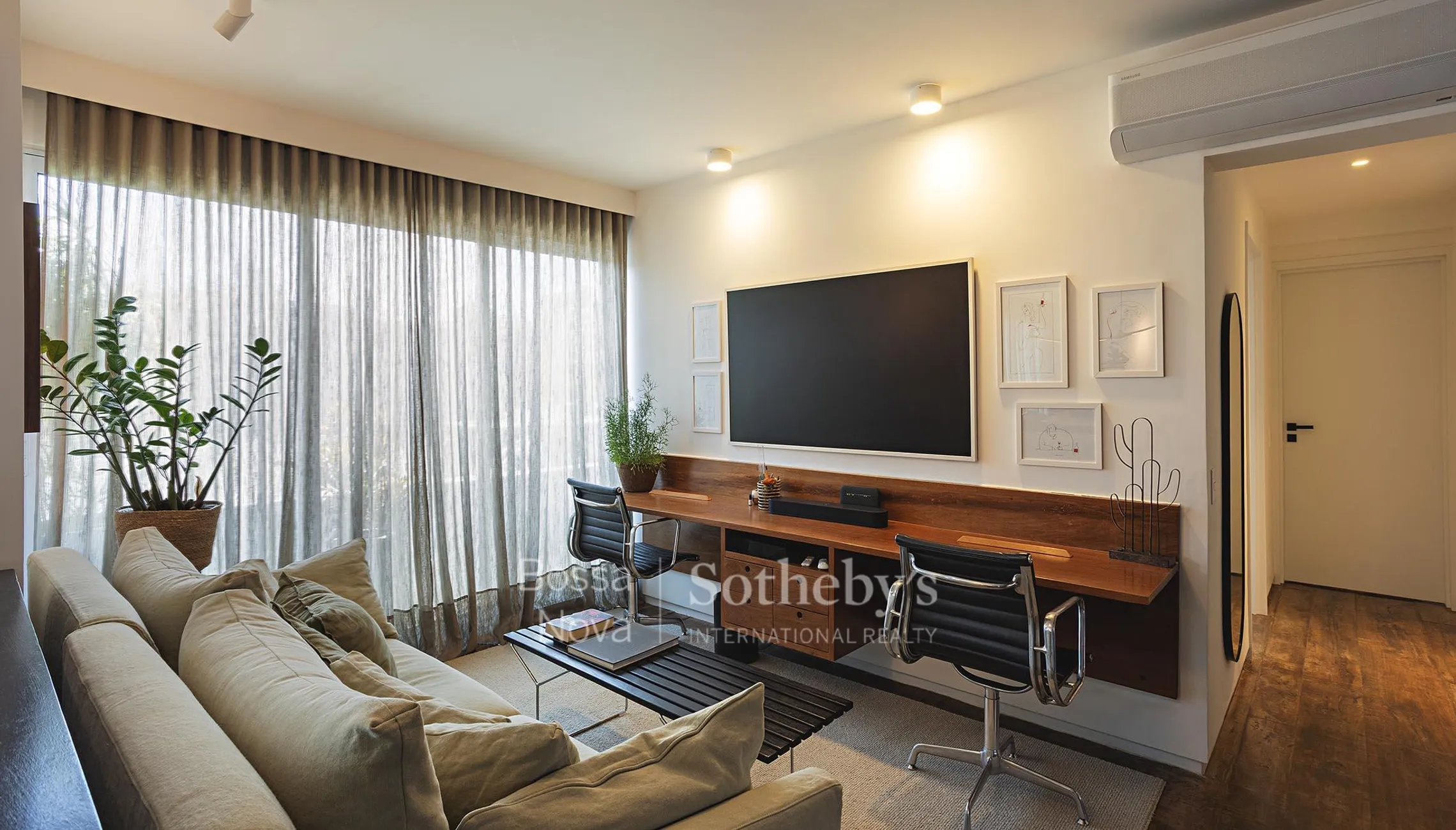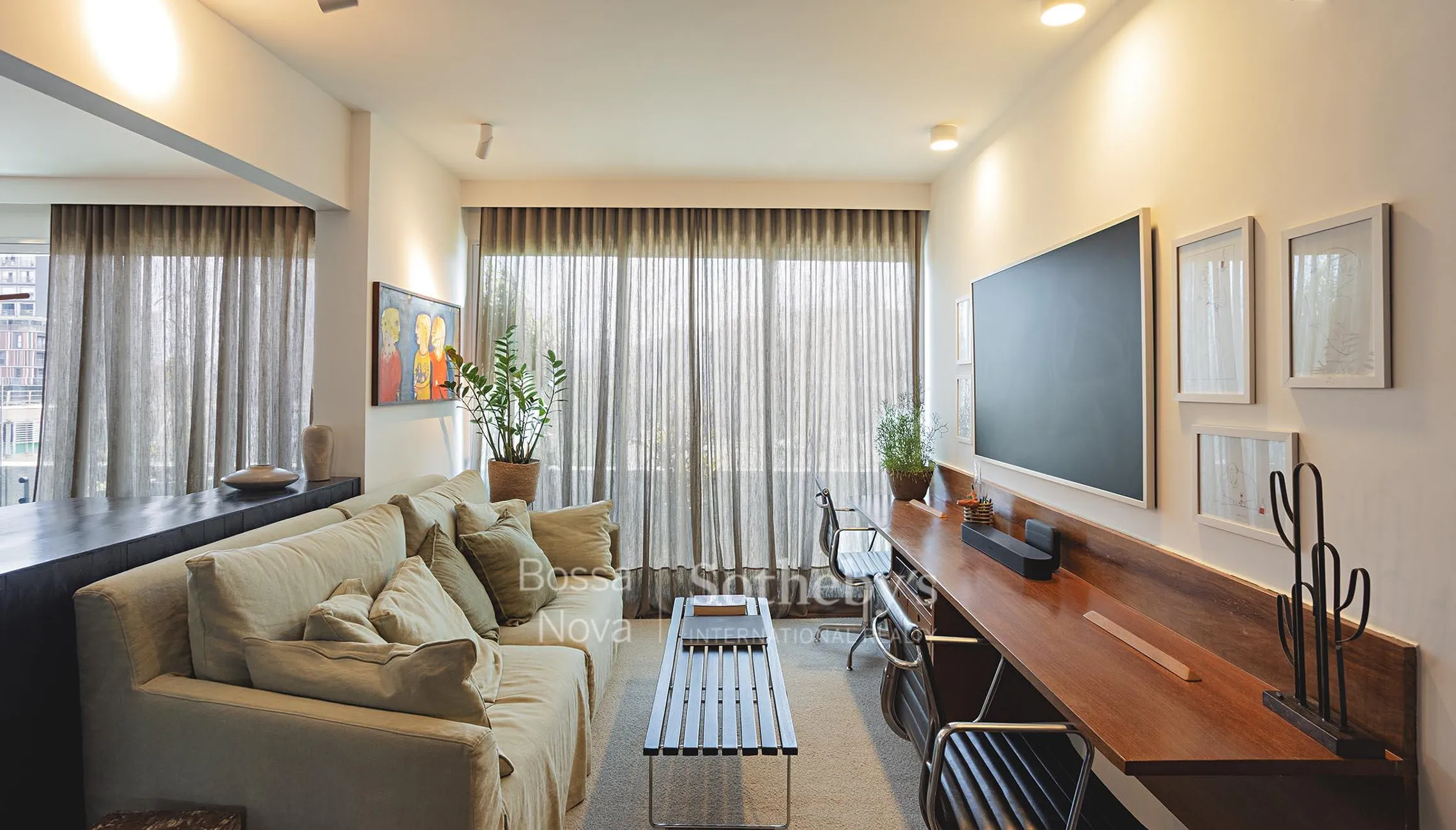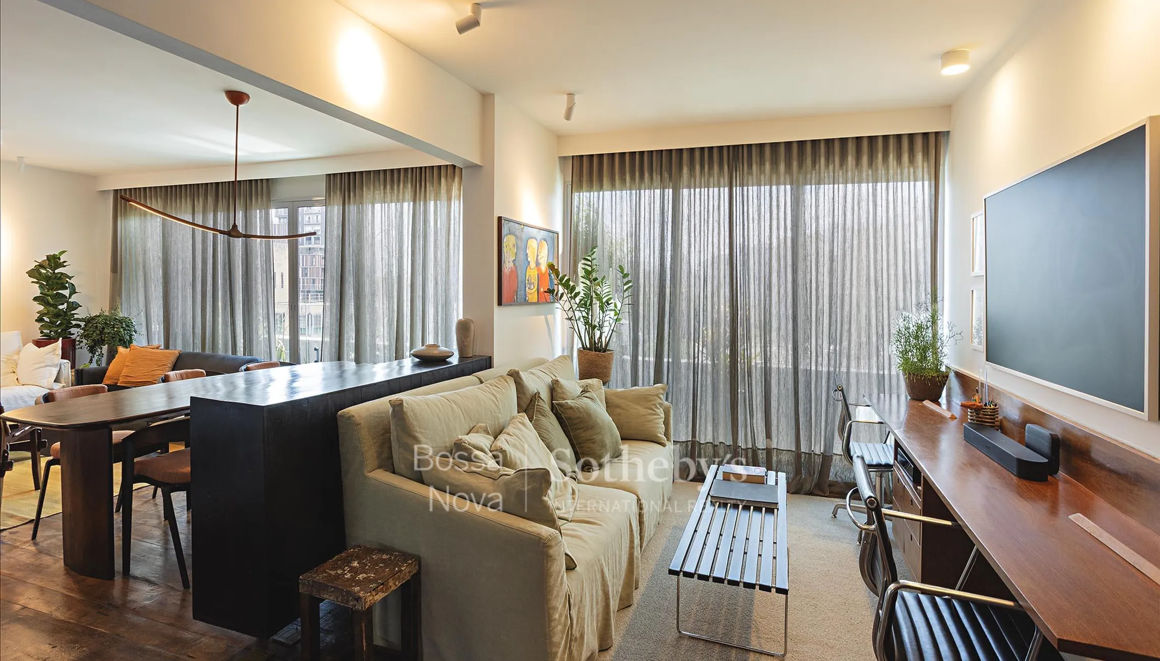 Este apartamento, totalmente reformado e situado em pavimento elevado, apresenta boa iluminação natural e vista aberta, em localização com acesso facilitado a serviços e conveniências. A área social conta com living amplo e lavabo, destacando piso de madeira de demolição vinda da Bahia, marcenaria detalhada e renovação completa das instalações elétrica e hidráulica. A planta dispõe de um dormitório com banheiro e uma suíte, ambos com janelas piso-teto e varanda que circunda o imóvel. A suíte principal oferece closet e banheiro com duas cubas e dois chuveiros, com ventilação natural em todos os banheiros. O condomínio passou por retrofit recente e dispõe de duas vagas de garagem.