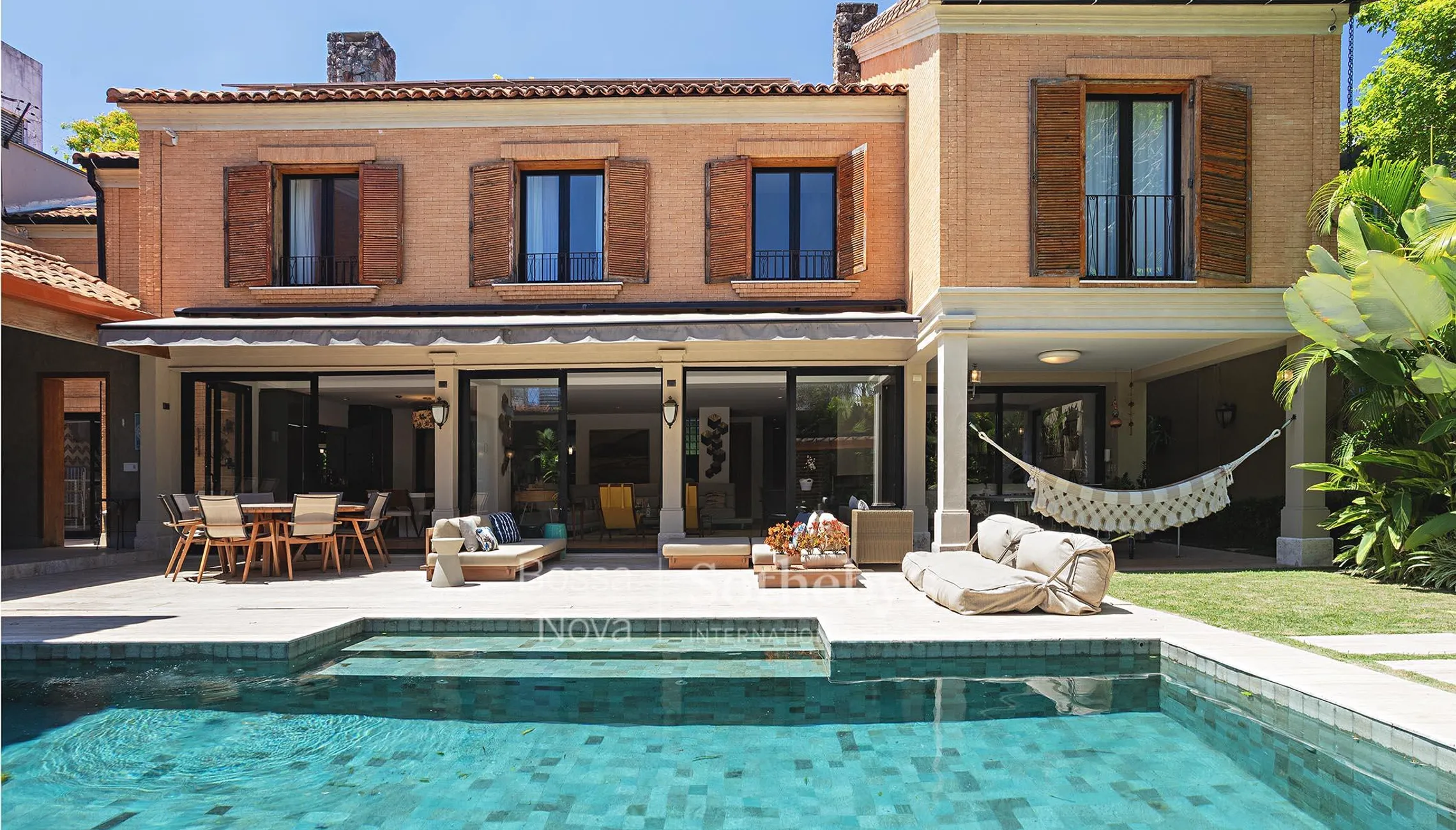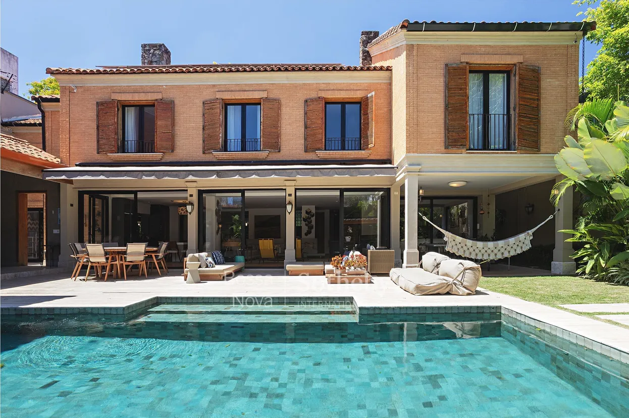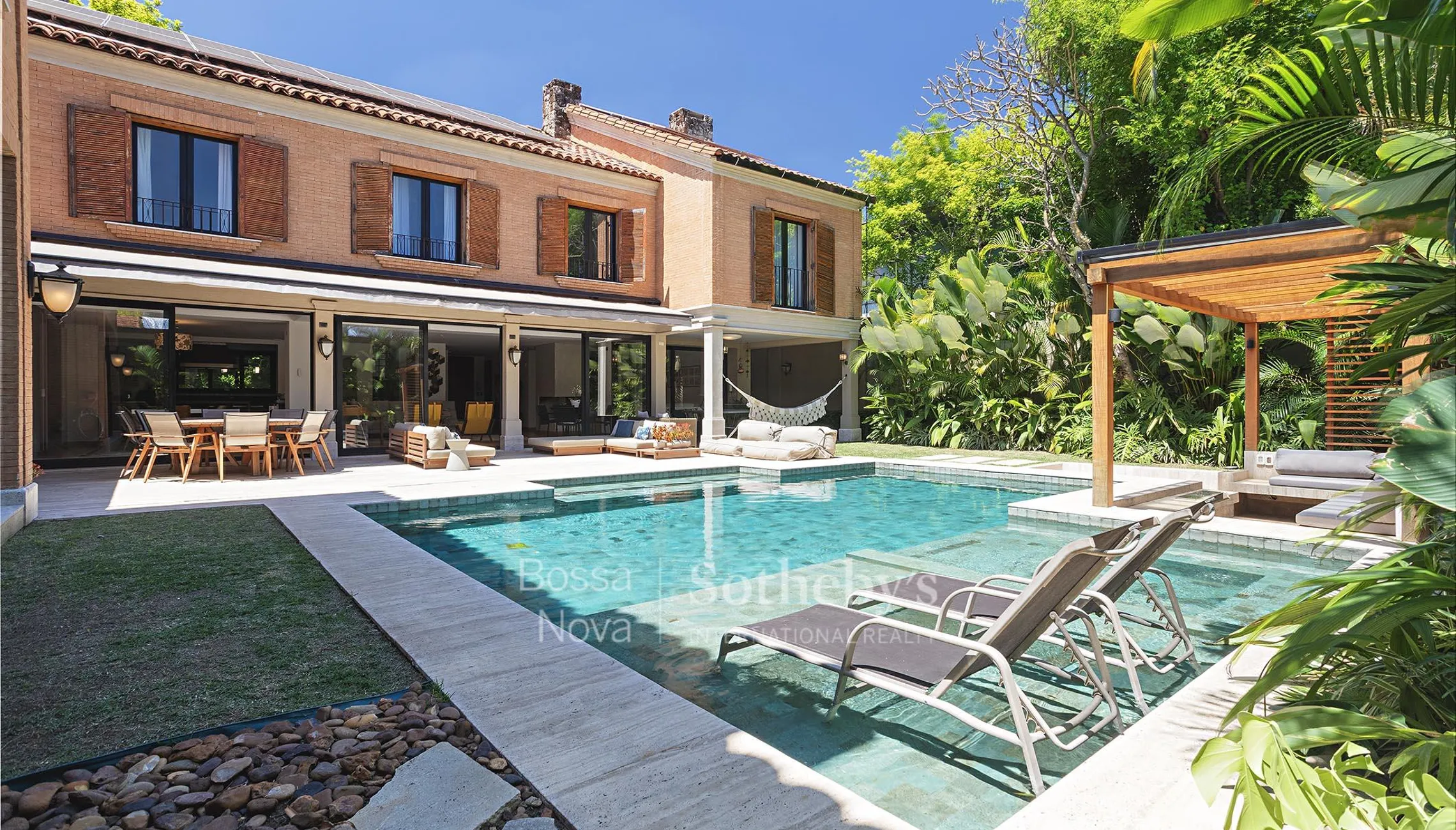 Projetada pela arquiteta Rosana Collet, esta casa no Jardim Europa foi concebida para oferecer conforto, harmonia e elegância em todos os ambientes. O paisagismo tropical valoriza os espaços e reforça a integração entre o interior e o exterior. A área externa conta com deck em mármore travertino, piscina com prainha e jacuzzi revestidas em pedras Hijau, além de espaço gourmet, home theater e academia, proporcionando bem-estar e versatilidade ao uso dos ambientes. A construção emprega madeiras nobres de peroba e pinho de riga, que conferem caráter e refinamento ao projeto. O living amplo integra-se à moderna cozinha americana planejada pela Ornare, criando uma atmosfera fluida e contemporânea. A área íntima dispõe de cinco suítes amplas, todas com armários Ornare, sendo a principal com closets independentes e banheiros Sr. e Sra. No mesmo pavimento há ainda uma sala íntima, escritório e copa de apoio. Localizada entre os shoppings Iguatemi e Eldorado, e próxima aos clubes Pinheiros e Hebraica, a casa está em rua arborizada com segurança privada e ambiente tranquilo, representando o equilíbrio perfeito entre funcionalidade e bem-estar em um dos endereços mais desejados da cidade.