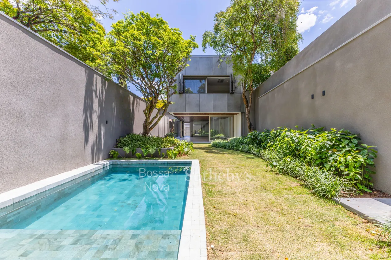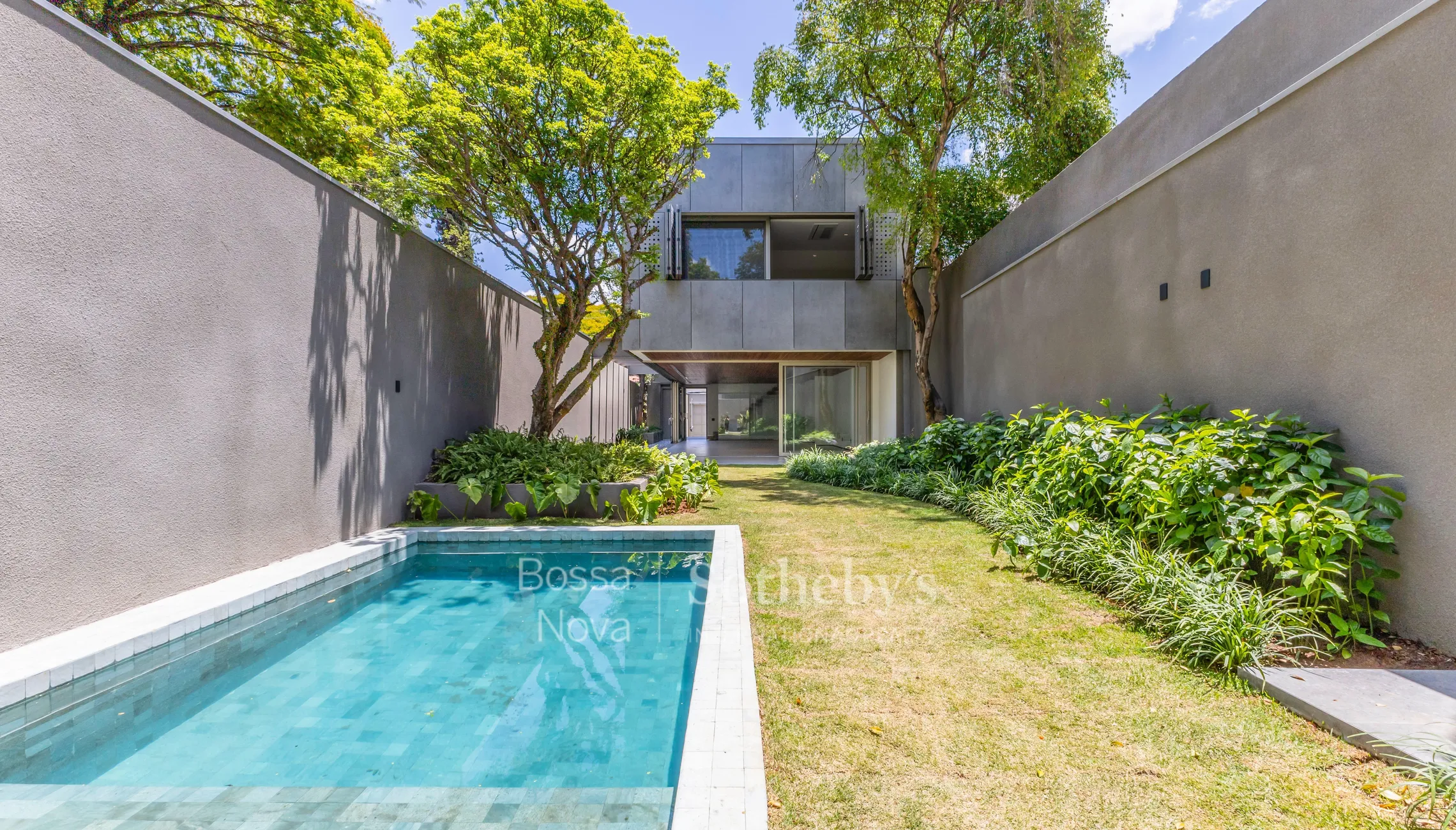 Casa contemporânea recém-construída, assinada pela Erplan Engenharia e com projeto arquitetônico de Ana Terra Capobianco, que valoriza a eficiência estrutural e o uso de elementos simples com alta funcionalidade construtiva. Os ambientes foram concebidos para garantir amplitude e integração total à paisagem, que conta com paisagismo cuidadosamente planejado. Os acabamentos incluem venezianas perfuradas que criam jogos de luz e sombra, revestimentos em granito, superfícies de alto desempenho do grupo Consentino e isolamento acústico. O sistema de ar-condicionado possui difusores lineares, e a residência dispõe de painéis solares, gerador a gás, infraestrutura para aspiração central e elevador silencioso e ecológico. A área social integra o amplo living à varanda, ao jardim e à piscina. A área íntima abriga quatro suítes espaçosas, garantindo conforto e privacidade.