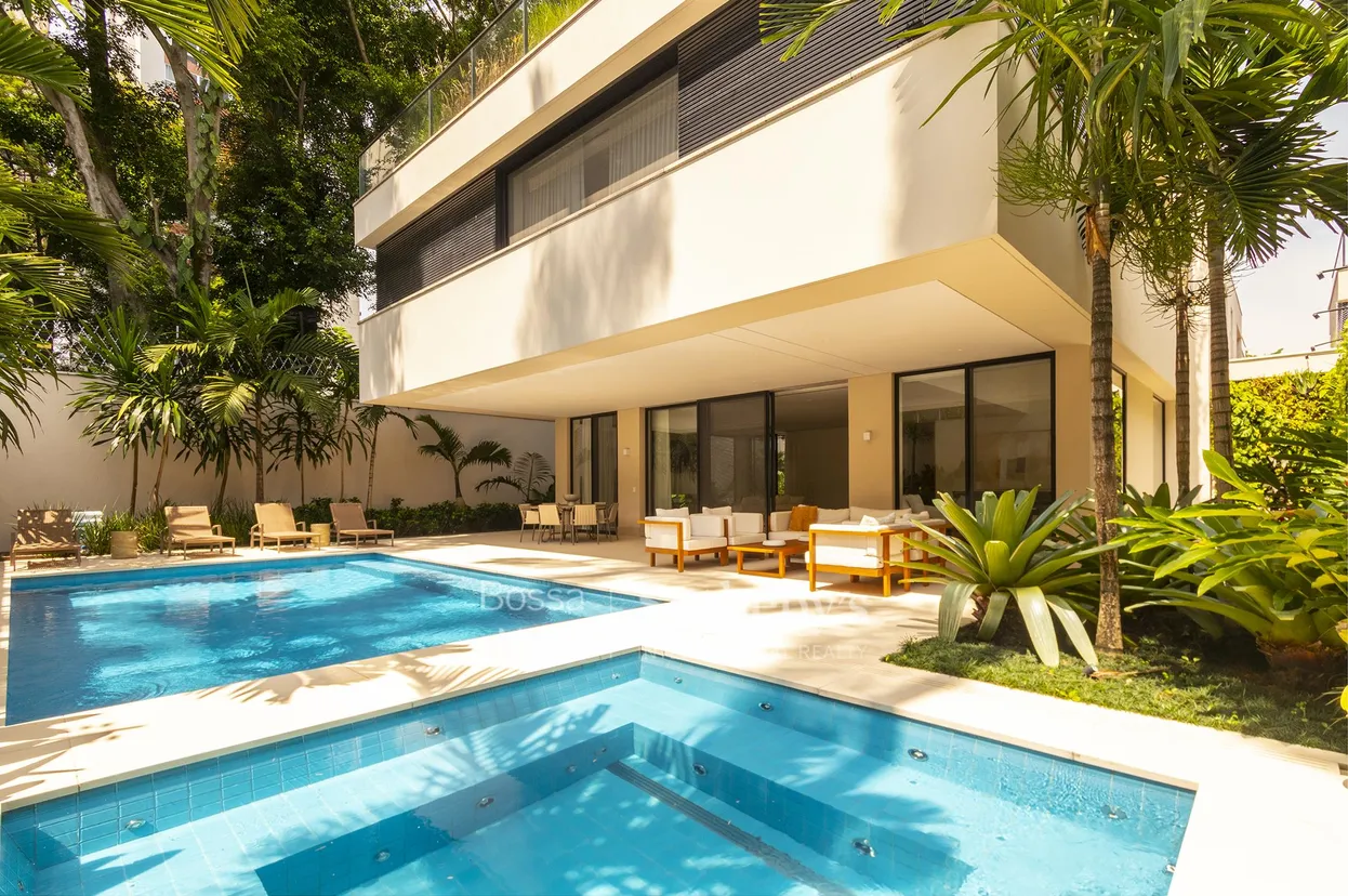 Localizada em um dos endereços mais valorizados do Jardim Paulistano, esta casa em condomínio oferece segurança, privacidade e projeto arquitetônico voltado ao conforto em todos os ambientes. O living contempla quatro ambientes, com janelões que proporcionam luz natural e vista para o jardim com piscina. A área social inclui sala de jantar com duas mesas — uma para dezoito lugares e outra para dez —, além de espaço gourmet com churrasqueira, forno de pizza, coifa moderna e paisagismo integrado. No pavimento intermediário estão seis suítes com armários e closets planejados, incluindo a suíte principal, com área generosa e closet. A cobertura abriga solarium, espaço fitness, brinquedoteca e home theater. A área de serviço é composta por lavanderia ampla, dependências completas para funcionários, sauna e jacuzzi. A residência conta com dez vagas de garagem e está equipada com acabamentos de alto padrão, como porcelanato italiano, marcenaria Kitchens, portas com espessura especial, projeto de iluminação, ar-condicionado em todos os ambientes, elevador, gerador e sistema de aquecimento central de água.