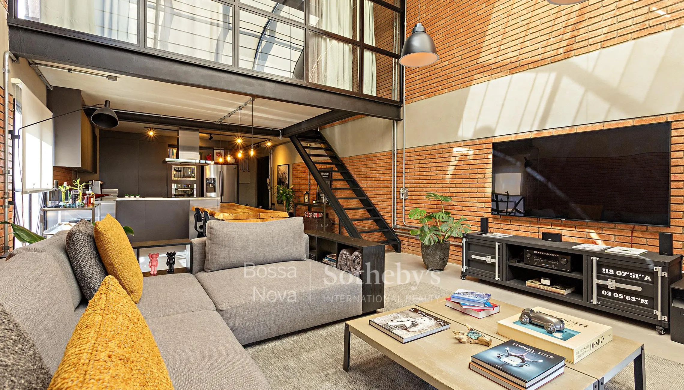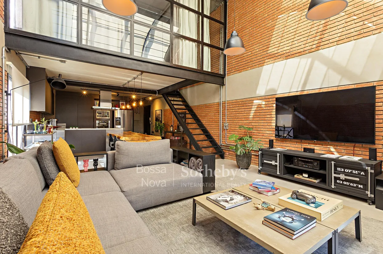 Cobertura mobiliada com pé-direito duplo, varanda integrada e estilo industrial