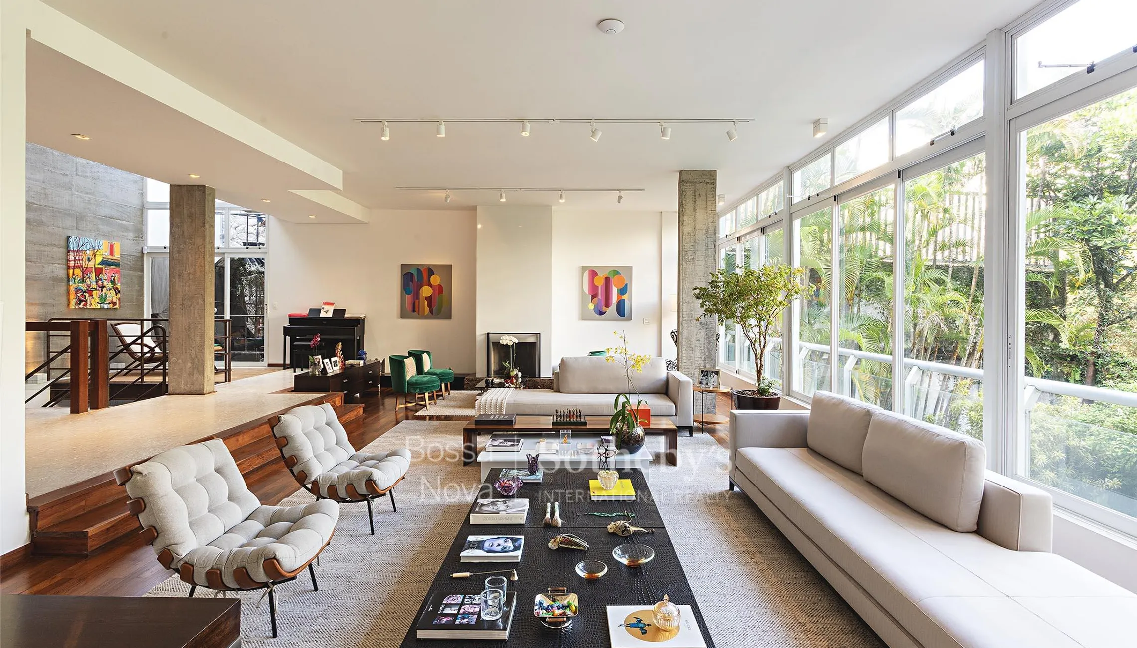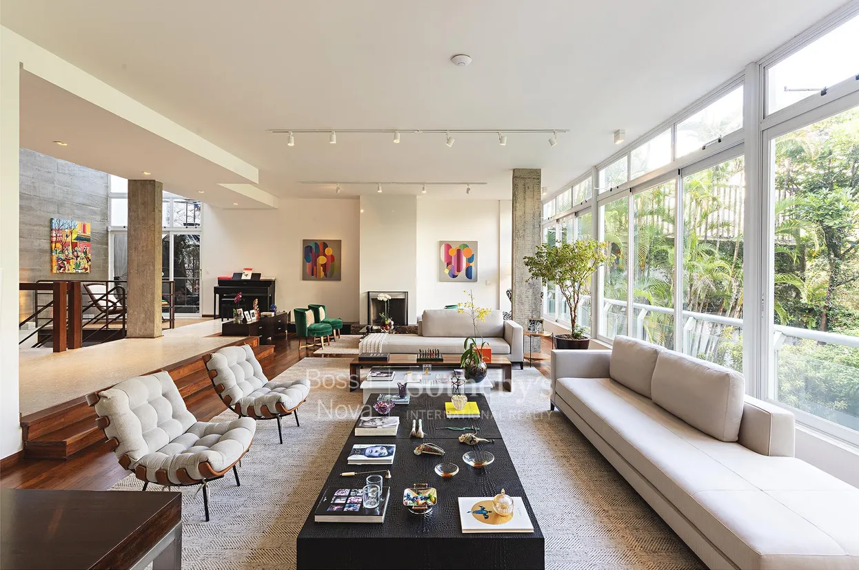 Arquitetura modernista integrada à natureza com ambientes amplos para receber bem