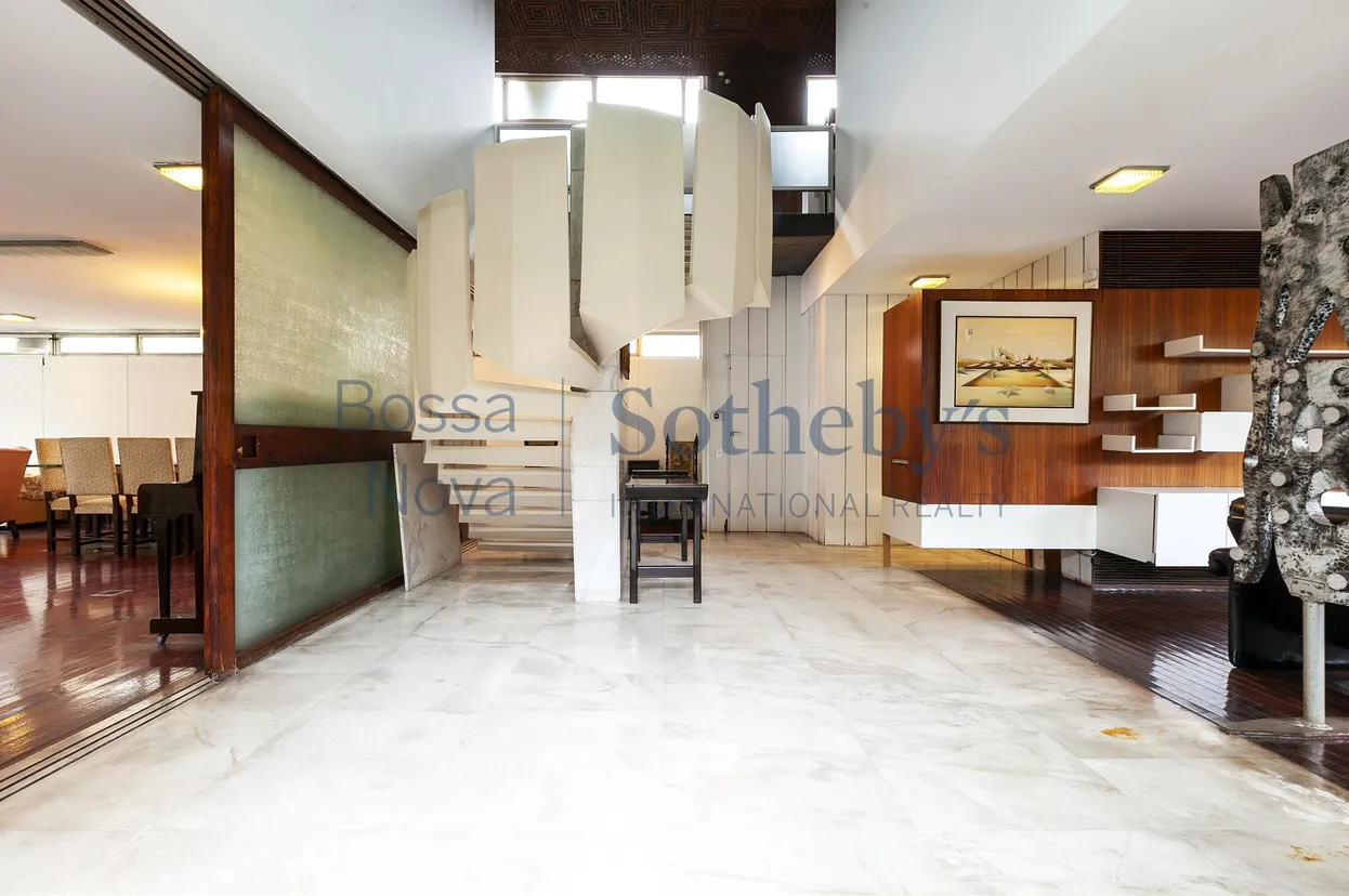 Casa no Jardim Paulista a poucos minutos do Parque Ibirapuera. Tem arquitetura moderna dos anos 70, assinada pelo arquiteto Luiz Alcino Teixeira Leite, com projeto arrojado e ambientes amplos e ensolarados. No pavimento térreo há um hall de entrada, seguido por living para três ambientes, com varanda, sala de jantar, jardim de inverno e sala de TV, além de copa, cozinha e dependências de serviço. Todo o living é cercado pelos jardins da casa. No pavimento superior há quatro dormitórios, sendo a suíte master com jardim interno e closet, sala de estudos e acesso de serviço. O subsolo conta com sala multiuso, suíte para motorista, lavanderia, depósito e vagas para cinco veículos. Todos os três pavimentos são servidos por um elevador.