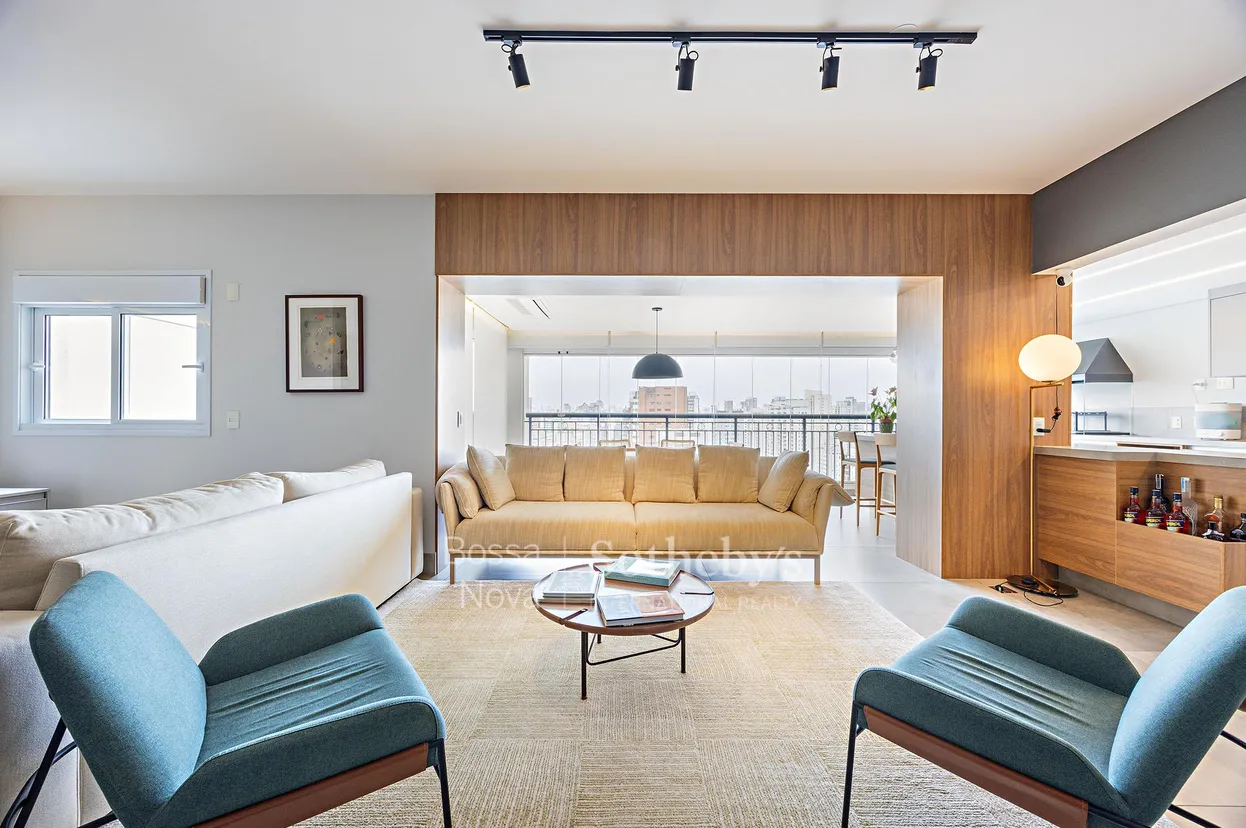 Apartamento com varanda gourmet em edifício Cyrela, localizado em andar alto, com vista e projeto de reforma assinado por profissional renomado. Os acabamentos e detalhes seguem um padrão elevado de qualidade, com marcenaria sob medida e integração total entre os ambientes. A planta conta com três suítes amplas, sendo a principal com banheiro Sr. e Sra. e closet, facilmente reversível à configuração original. A área social possui living para diversos ambientes, integrado ao terraço e à cozinha equipada com eletrodomésticos de última geração. O condomínio dispõe de infraestrutura completa de lazer e segurança diferenciada. Localizado em uma das áreas mais valorizadas de Moema, está próximo a restaurantes, serviços e opções de conveniência e lazer do bairro.