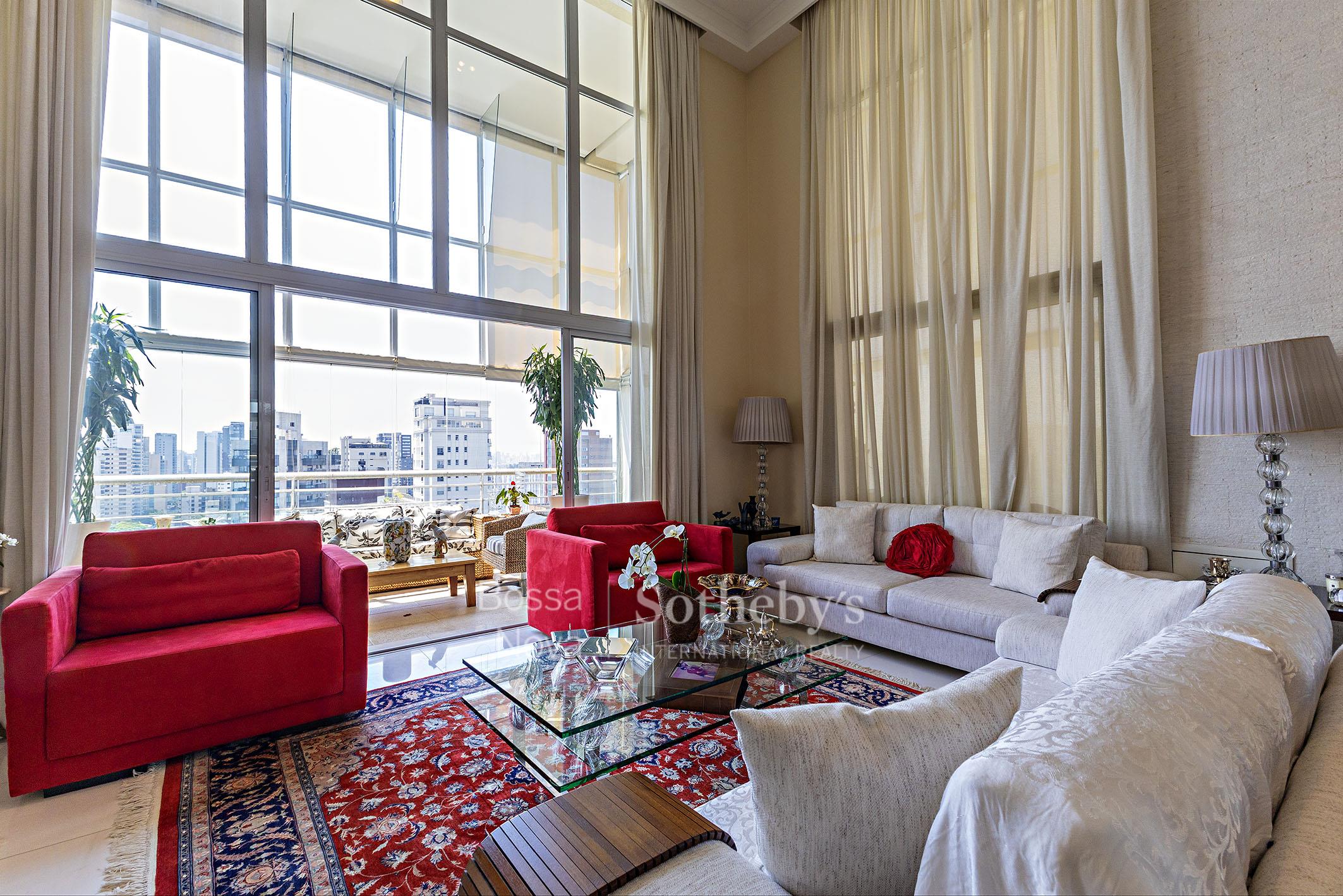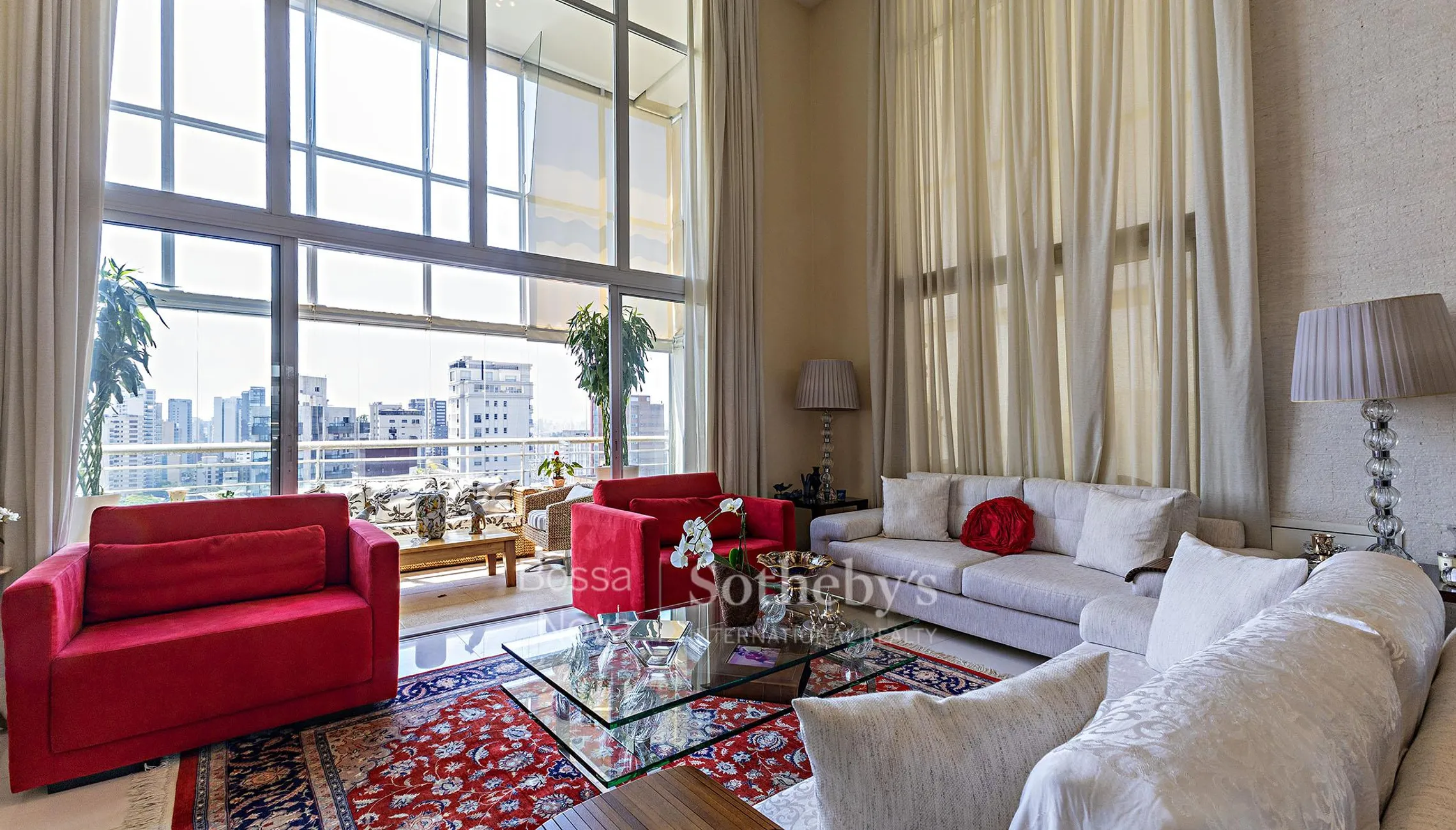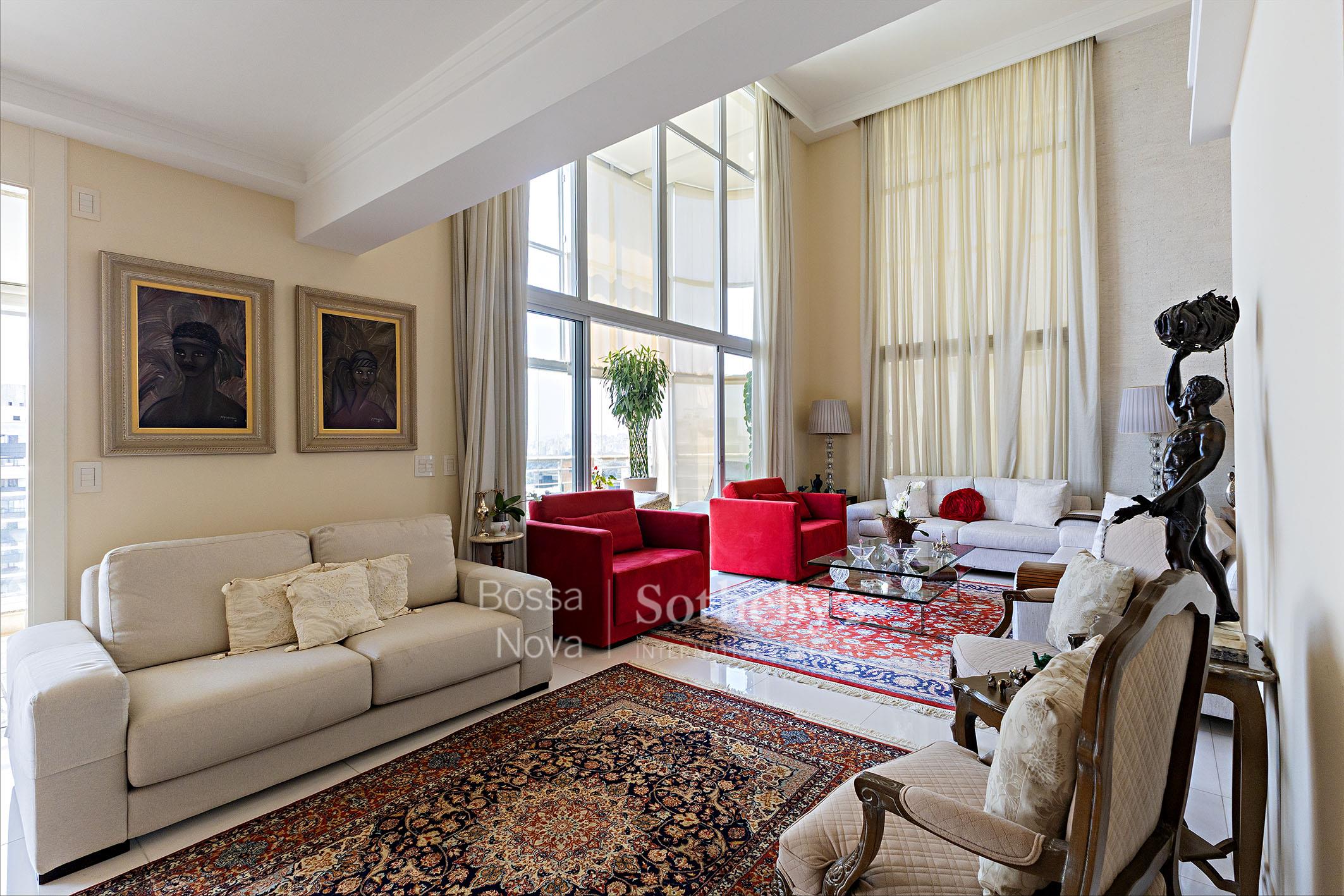 Localizado em Moema, este apartamento em andar alto oferece vista ampla e permanente, com área social marcada pelo living com pé direito duplo integrado à varanda envidraçada, que traz vidro do chão ao teto e possibilita múltiplos ambientes. O living conta com ambiente de bar, duas salas de estar, sala de jantar e o home theater integrado, que mantém a infraestrutura para ser revertido para suíte conforme a necessidade. A cozinha é integrada à sala de almoço e à área gourmet, criando um espaço fluido para o dia a dia. A área íntima dispõe de três suítes, sendo a principal composta por varanda envidraçada, dois banheiros e closet, enquanto as demais também se destacam pela iluminação natural. A planta inclui lavanderia com quarto e banheiro de apoio, além de armários Kitchens em todos os ambientes. O condomínio oferece piscina adulto e infantil, brinquedoteca, sala de massagem, playground, sauna, academia, salão de festas e quadra poliesportiva. A portaria é blindada e o apartamento conta com cinco vagas de garagem e depósito.